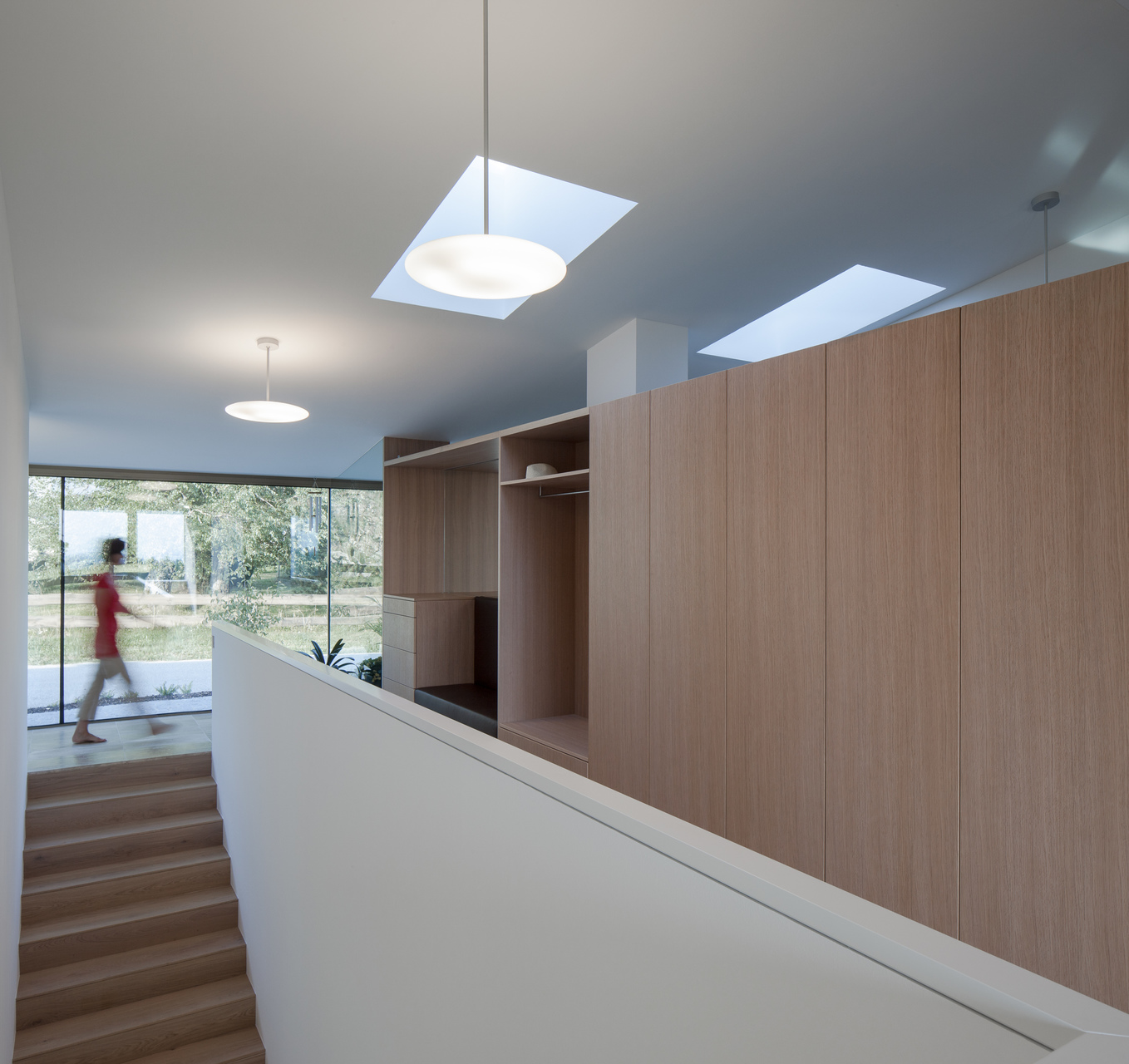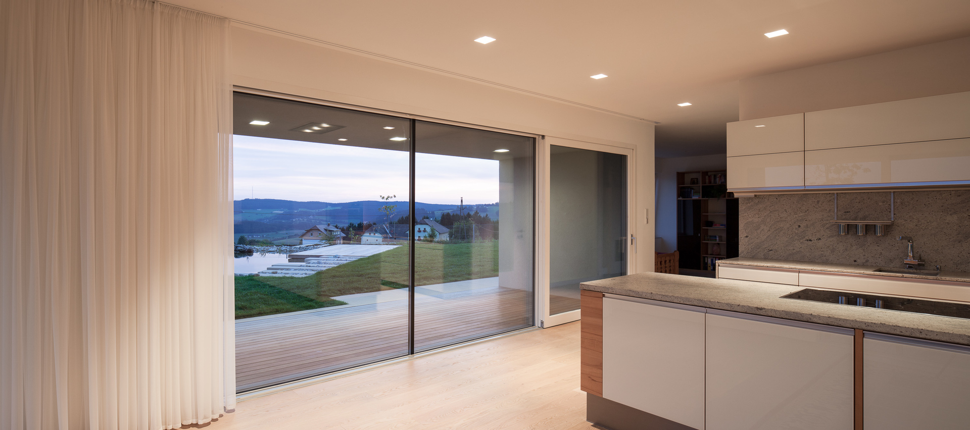 Das in der Gegend übliche Satteldach kommt ohne Vorsprung aus und verstärkt – passend zur Mühlviertler Landschaft – die karge, ja schroffe Wirkung des Massivbaus. Den Kontrapunkt setzen die rhythmisch geschnittenen Öffnungen auf der Südseite. Das Gebäudeinnere dominiert der Kontrast zwischen erdfarbenem Naturstein, weiß gekalkten Wänden und warmen Eichenholztönen. Die Kombination aus vertrauter Gebäudeform, solider Materialwahl und hoher Ausführungsqualität garantiert anhaltenden Wohnkomfort.