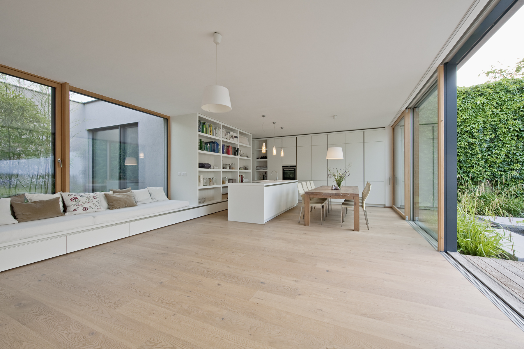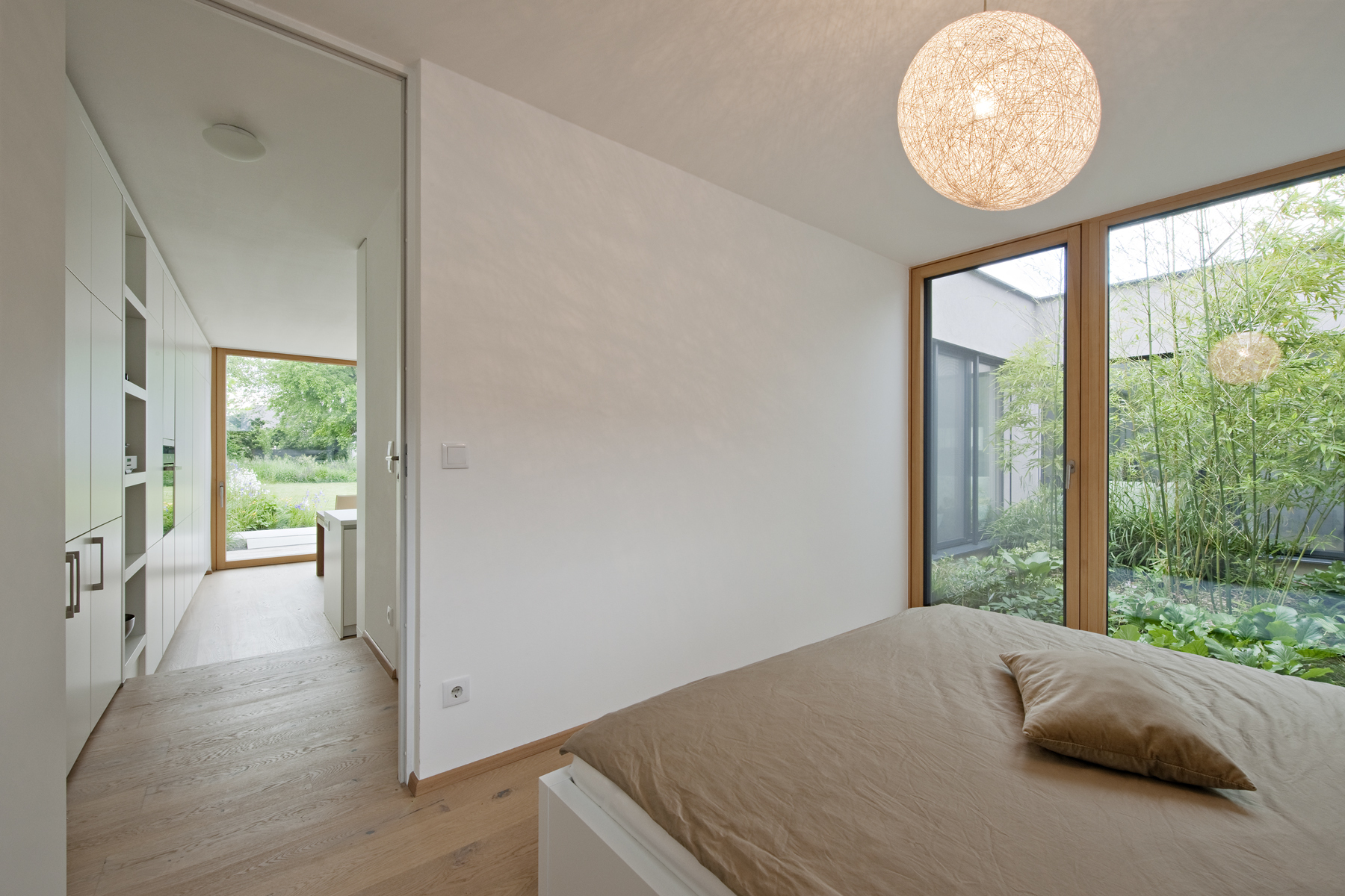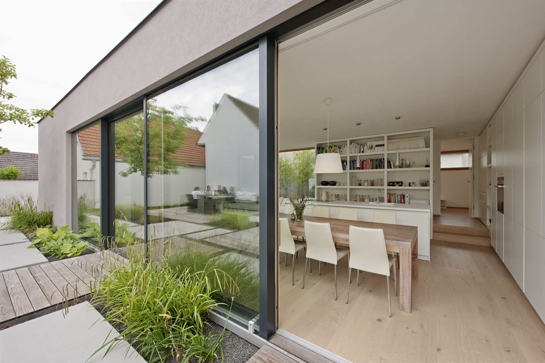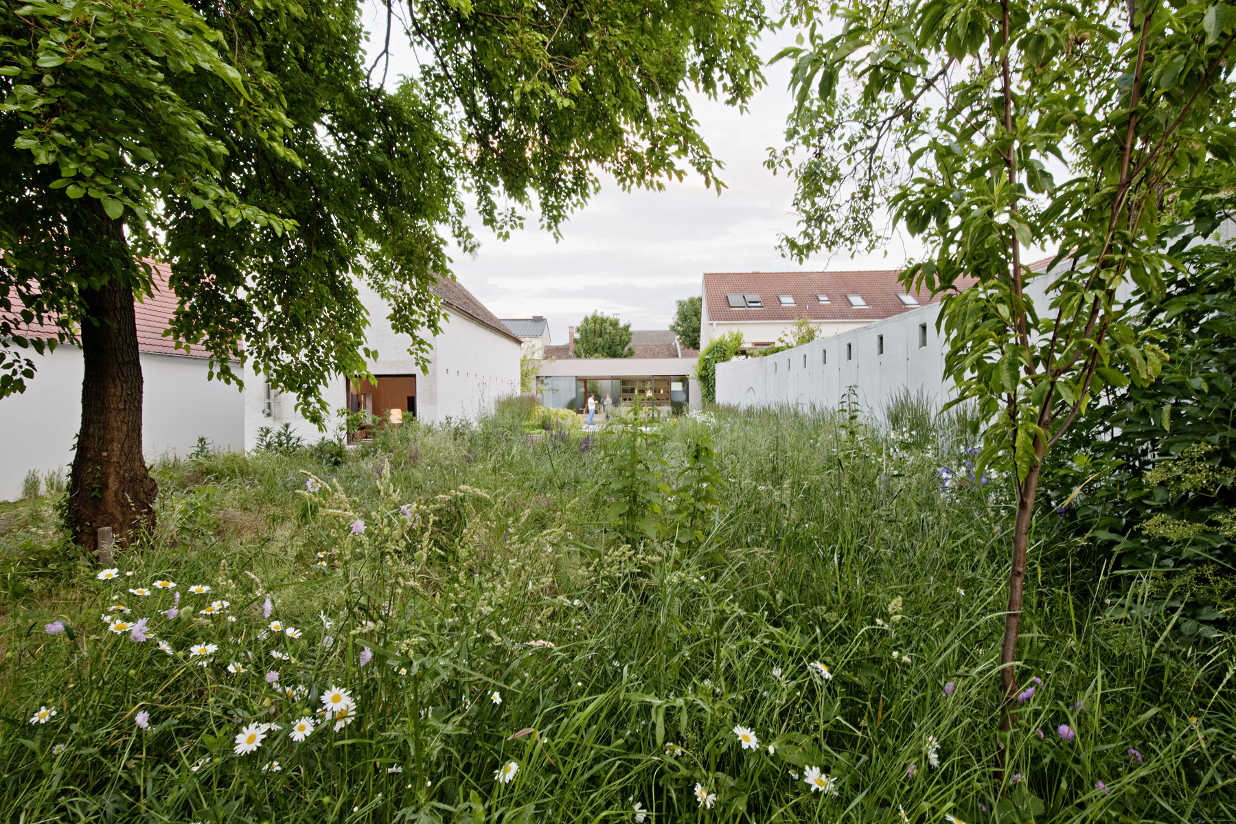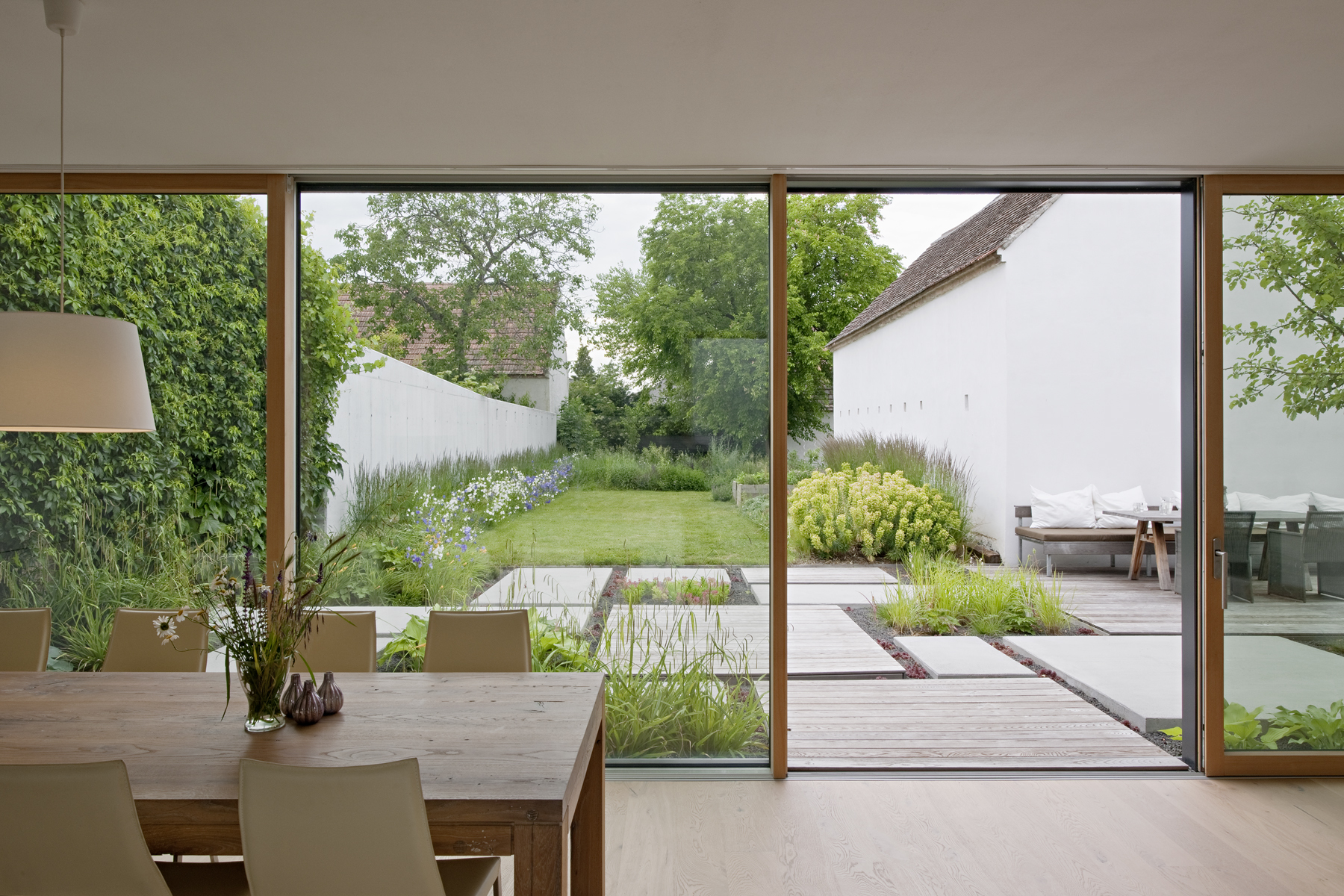 Zwei Streckhöfe wurden zusammengelegt und neu bebaut. Der Stadel und ein Teil der Hofgebäude blieben erhalten. Letzteres wurde saniert und dient als Gästehaus. Der Hofgarten bietet Platz zum Spielen für die Kinder und Eigenbau von Kräutern und Gemüse.Im straßenseitigen Teil des Grundstücks befindet sich ein flacher Neubau. Das zwischen den beiden Gebäudeflügeln situierte Atrium ist nicht nur Lichtspender, sondern auch immergrüner Schaugarten. Die Verbindung zwischen Haus, Garten und Hofgebäude bildet eine rund hundert Quadratmeter große Terrasse, die in mehrere unterschiedliche Schollen aus Beton, Holz und dunklem Basaltkies unterteilt ist. Die Gestaltung des Hauses, des Gartens und vor allem der Erhalt von gut nutzbaren Bestandsgebäuden nimmt Rücksicht auf die Lage im Ortsverband.