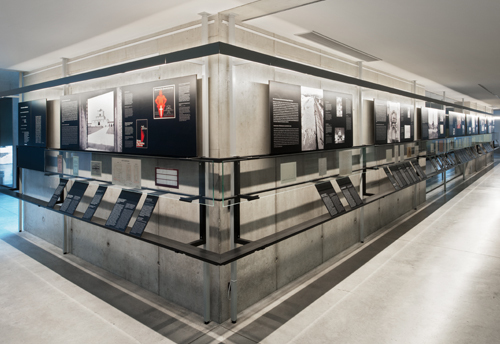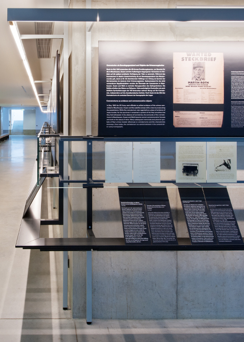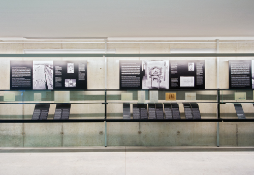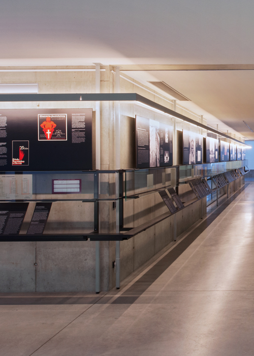 Auf der mitt leren Ebene vertiefen, auf Aughöhe ange ordnet, kleinformatige Dokumente die Themen. Die Details und Texte der Bild- und Fotodokumente bleiben – trotz kleiner Bildformate und geringer Schriftgrößen – gut lesbar. Die lose, „zufällige“ Anordnung der Textelemente in der unteren Ebene soll den Besuchern den Zugang zu den Texten erleich tern, die Besucher werden auf gefordert, einzelne Themen herauszugreifen, aus einer Vielzahl von Textangeboten einzelne „Blätter“ zu wählen.