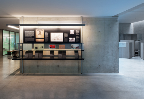 Die modulare, zerlegbare Konstruktion aus Stahlform rohren und schwarz beschichte ten, gekanteten Blechen ist an den Sichtbetonwänden angeklemmt und gegen Decke und Fußboden verspreizt. Glaselemente und ein Bord sind über u-förmige Trä ger mit Stahlformrohrstützen verschraubt. An der Oberseite sind die Stützen als Kragkon solen ausgebildet und tragen Linienleuchten. (Text: Architekten)