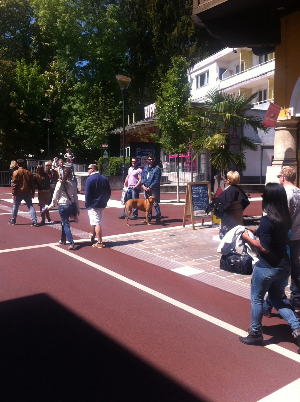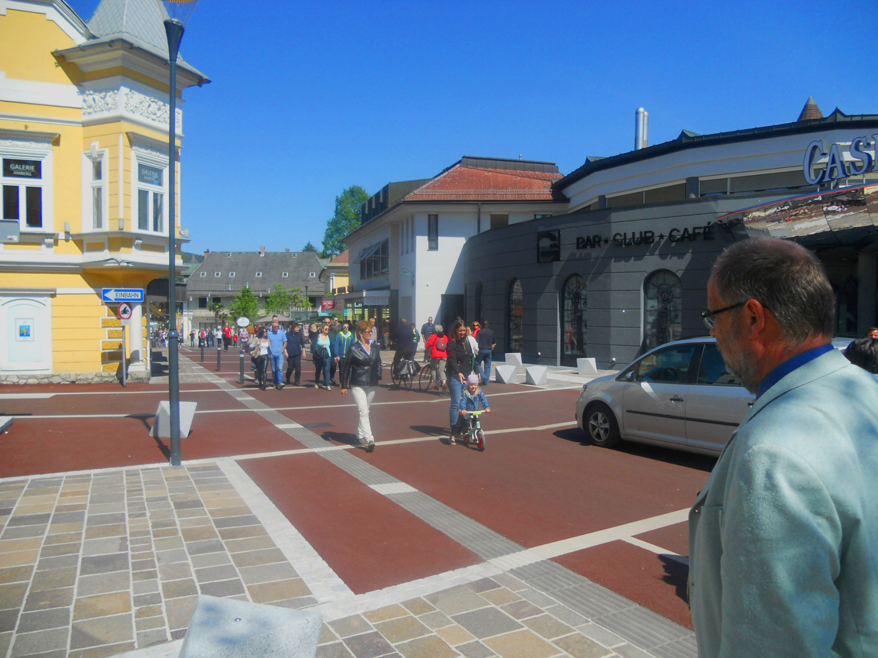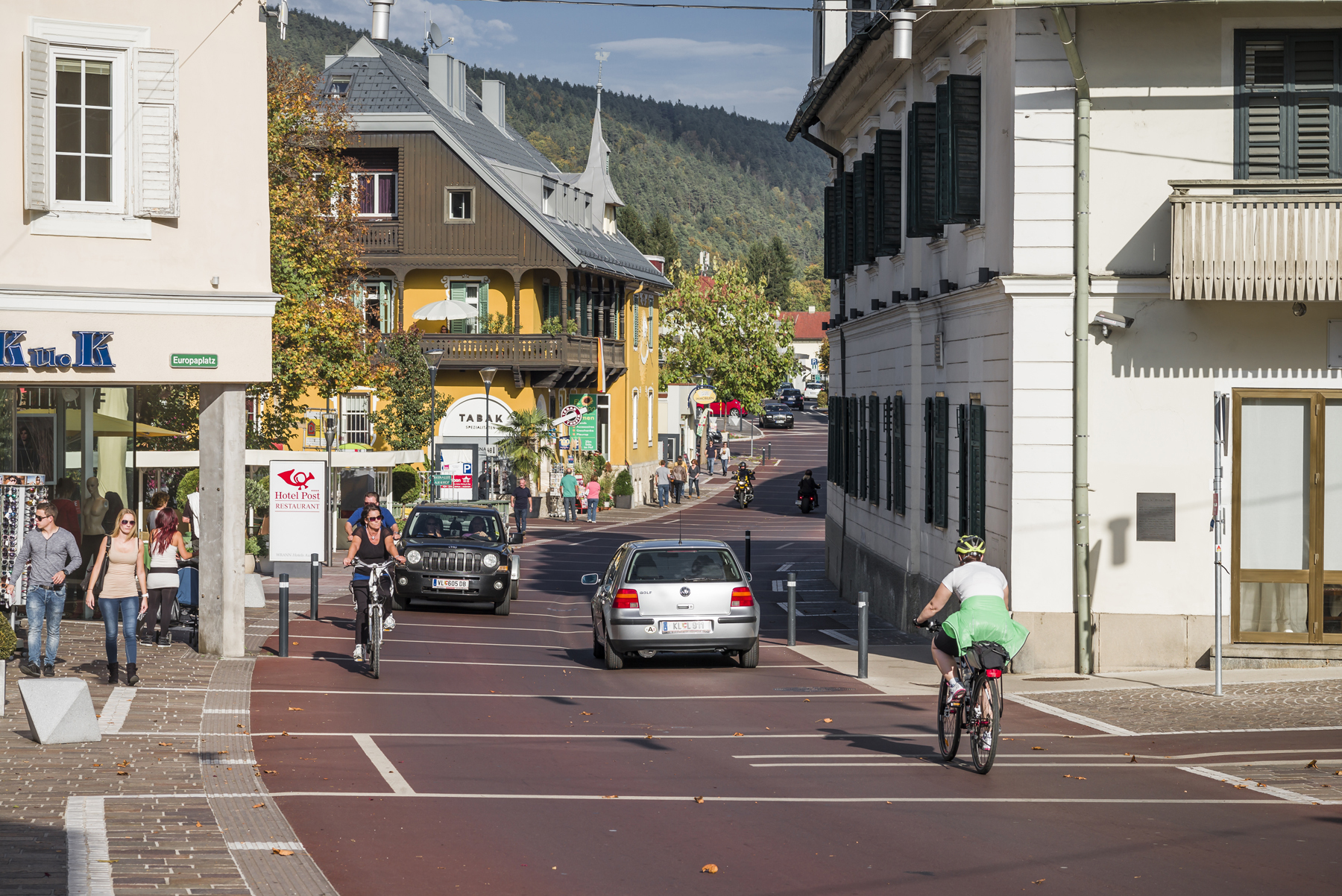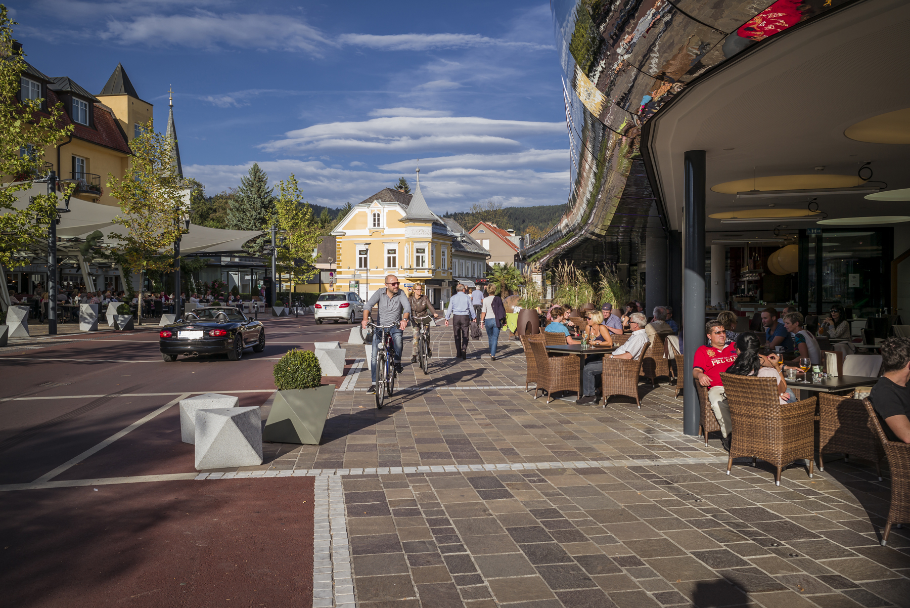 Um den öffentlichen Raum in seiner möglichen Fülle und Ausdehnung feierlich und einladend in Erscheinung zu bringen, wird im Sinne der Shared Space Prinzipien zwischen die begrenzenden Gebäude eine großzügige, ungebrochene Fläche gelegt: „Velden rollt einen roter Teppich für alle aus!“ Jetzt tritt die räumliche Qualität des öffentlichen Raums jenseits der Zerstückelung durch Verkehrsachsen deutlich hervor. Auf dieser Bühne für den Auftritt der Gäste werden möglichst sparsam Elemente der Bewegungsführung eingesetzt. Gestalterische Merkmale der Orientierung zeigen: Hier ist auch der Autofahrer nur zu Gast. (Text: Architekt)