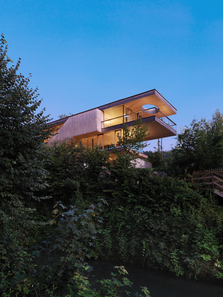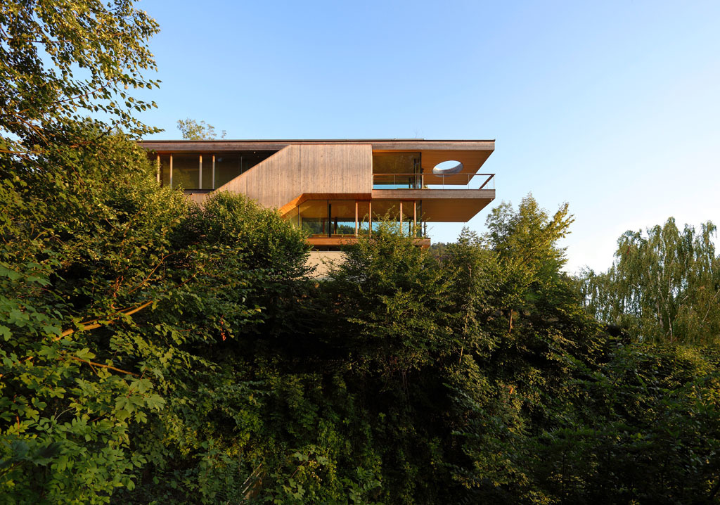 Der langgezogene Baukörper nutzt das schmale Grundstück zwischen Straße und Abhang ideal aus. In Skelettbauweise errichtet, liegen Stahlbetondecken auf Stützen und mittig gelegenen Wandscheiben auf, die einen massiven Kern bilden. Das gesamte Obergeschoss ruht auf dem fast vollständig verglasten Erdgeschoss, kragt talseitig weit aus und bildet bergseitig einen überdachten Vorplatz. An der Nordfassade zeichnet sich der Stiegenverlauf ab und verstärkt damit die Dynamik des Obergeschosses in seiner Ausrichtung nach Westen. Eine feine Holzstruktur an der Südfassade des Obergeschosses dient als teilweise verschiebbarer Holzvorhang, der einfallendes Sonnenlicht filtert und straßenseitig die dahinterliegenden Wohnräume verhüllt.