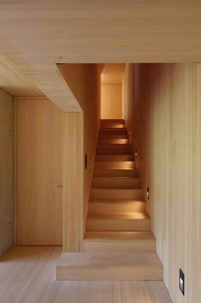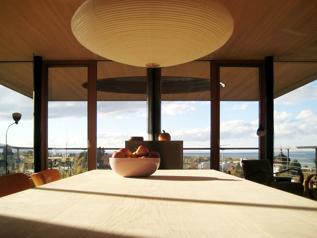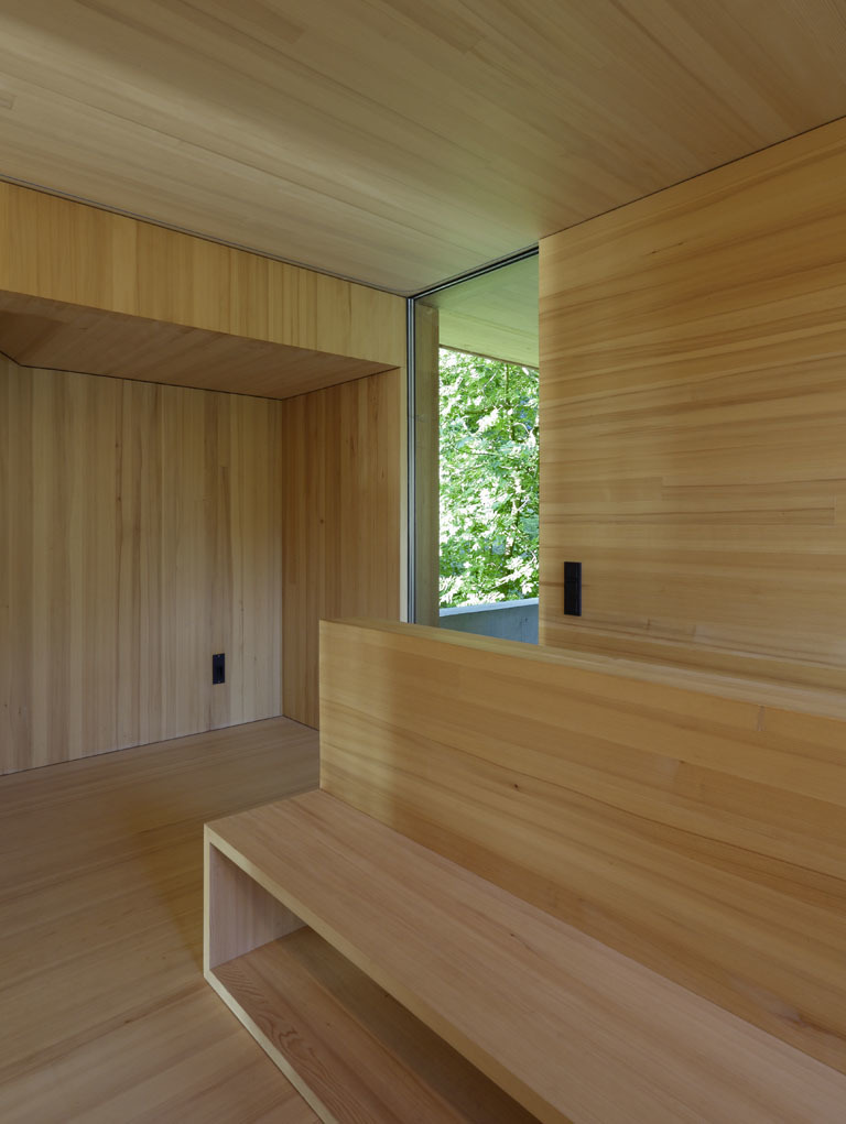 Im Inneren sind sämtliche Flächen (Boden, Wände, Decken) in astreiner Weißtanne verkleidet. Zusammen mit den ebenfalls aus Weißtannenholz gefertigten Einbaumöbeln bilden sie eine Einheit und eine ruhige Basis. Nur wenige schwarze Säulen und unverkleidete Sichtbetonwände durchbrechen das Zusammenspiel von Holz und Glas.