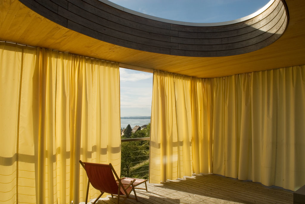Durch das Zuziehen eines Segeltuchvorhangs und/oder dem Verschieben des Holzvorhangs an der Fassade werden unterschiedliche Aus- und Einblicke ermöglicht. Selbst in geschlossenem Zustand kann in diesem geschützten, privaten Außenraum durch eine ovale Öffnung am Plafond der (Sternen-)Himmel betrachtet werden.