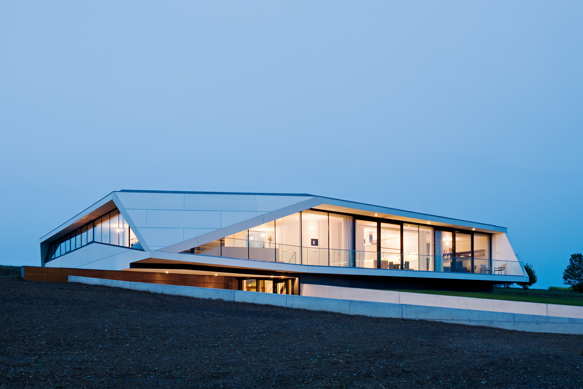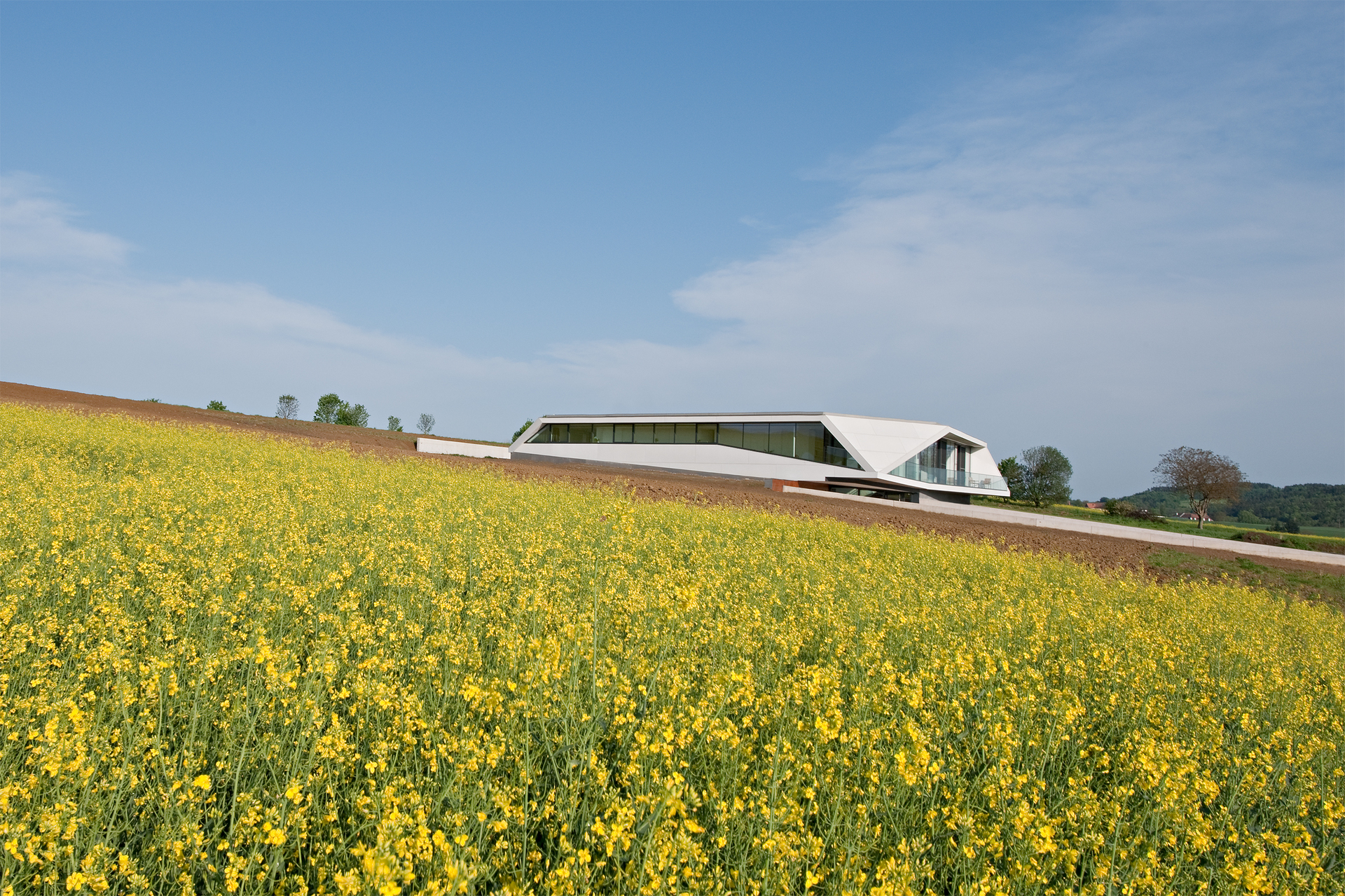 Das 300 m² grosse Haus ist mit Tageslicht durchfluten und beeindruckt durch seine vielfältige Blicke auf die idyllische Hügellandschaft. Das Gebäude erreicht durch die 3-fach-Verglasung, seine Orientierung und die tiefen Vordächer die Vorgaben eines Niedrigstenergiehauses, wodurch ein höherer Wohnkomfort und geringere Energiekosten folgen. (Text: Architekten)
