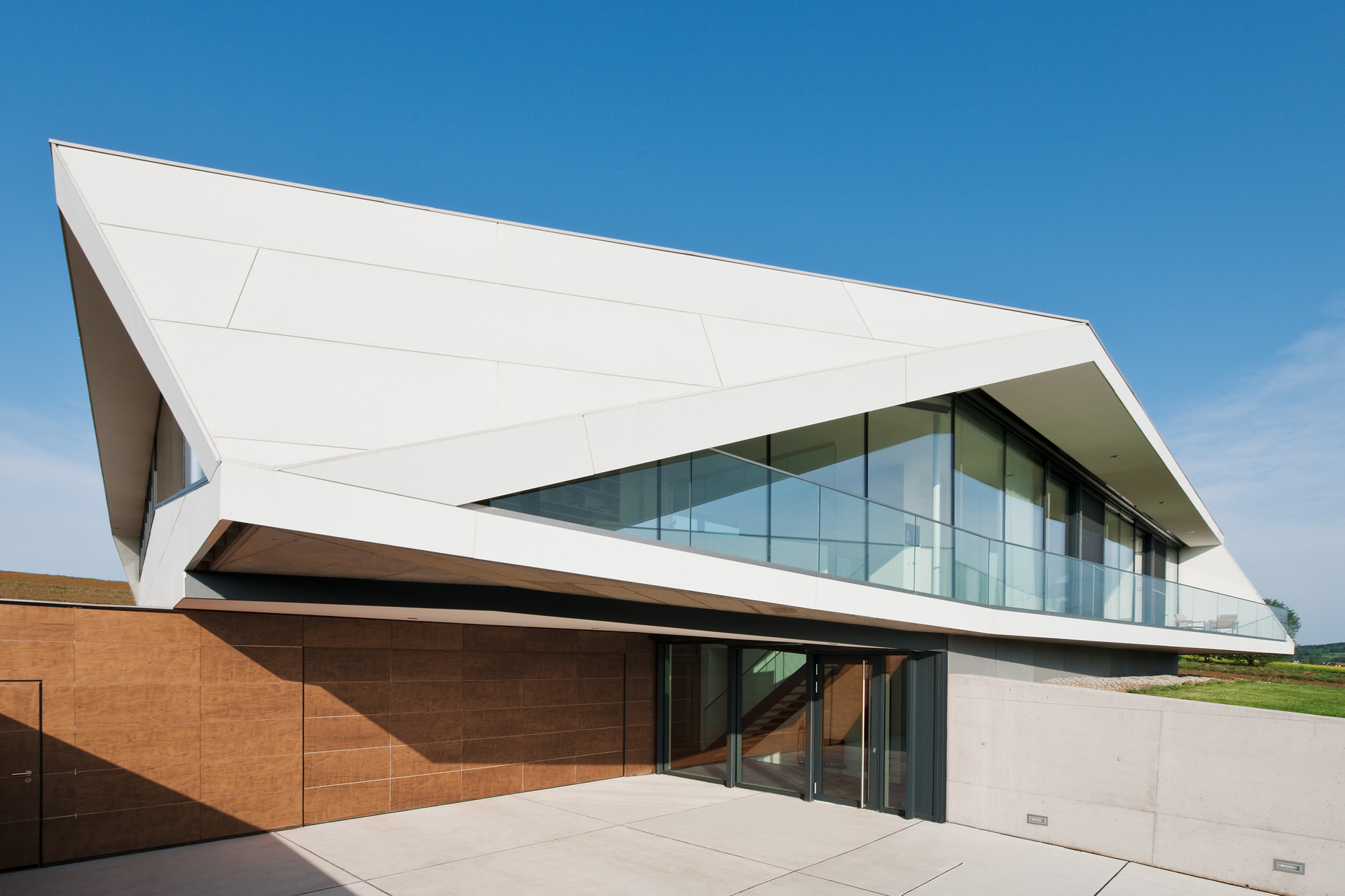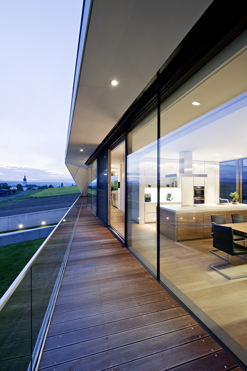 Die regional-typische und historisch gewachsene L-Bauweise gab den Anstoß den markanten Blickfang einer L-Form, in die Architektur des 21. Jahrhunderts zu übersetzt. Durch die Form entstand ein geschützter Innenhof, die von der Familie gewünschte Aufteilung von Wohn- und Schlafbereich und viel natürliches Licht. Die großzügigen Glasflächen erweitern den Wohnraum optisch in den Garten und die dahinterliegende Hügellandschaft.