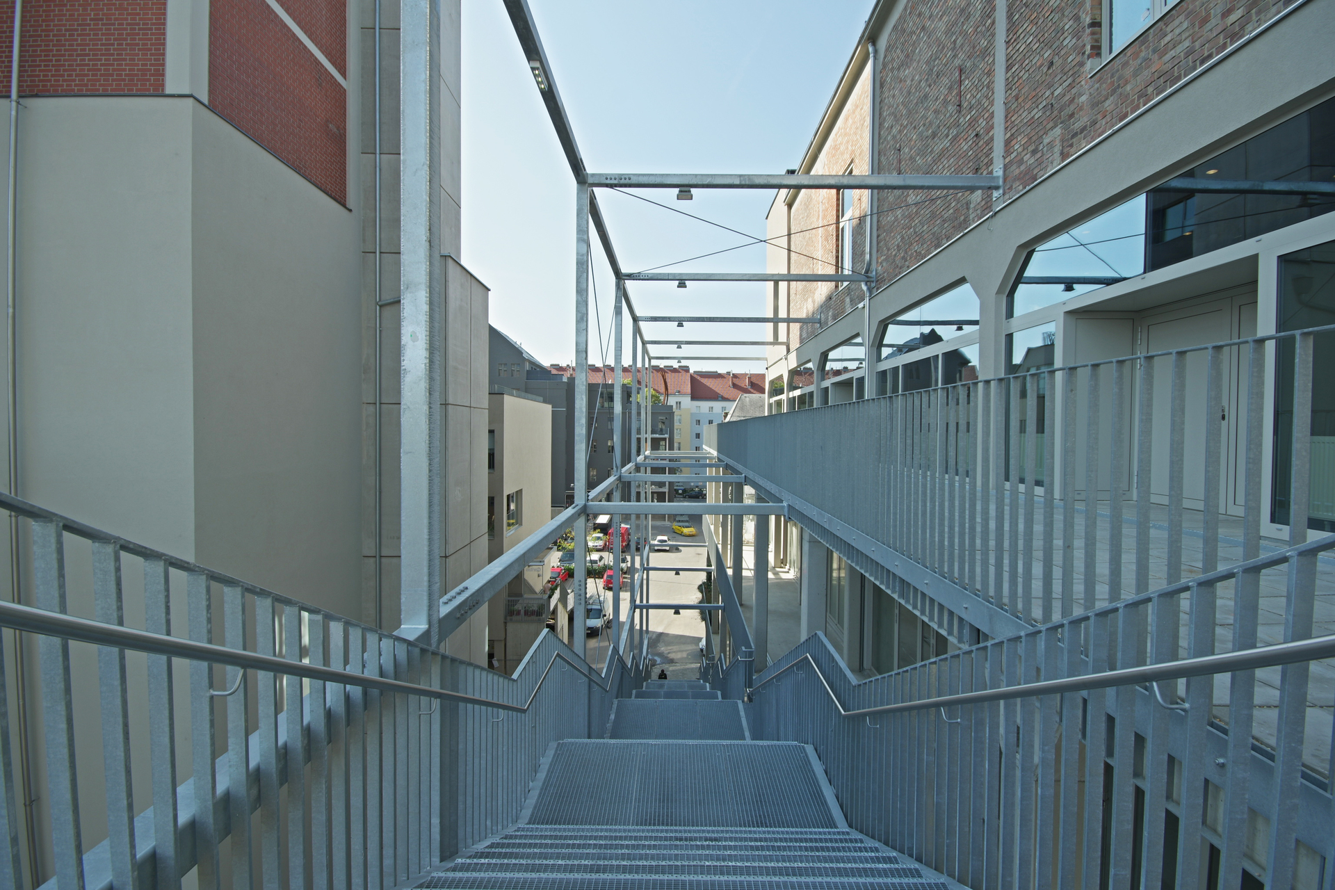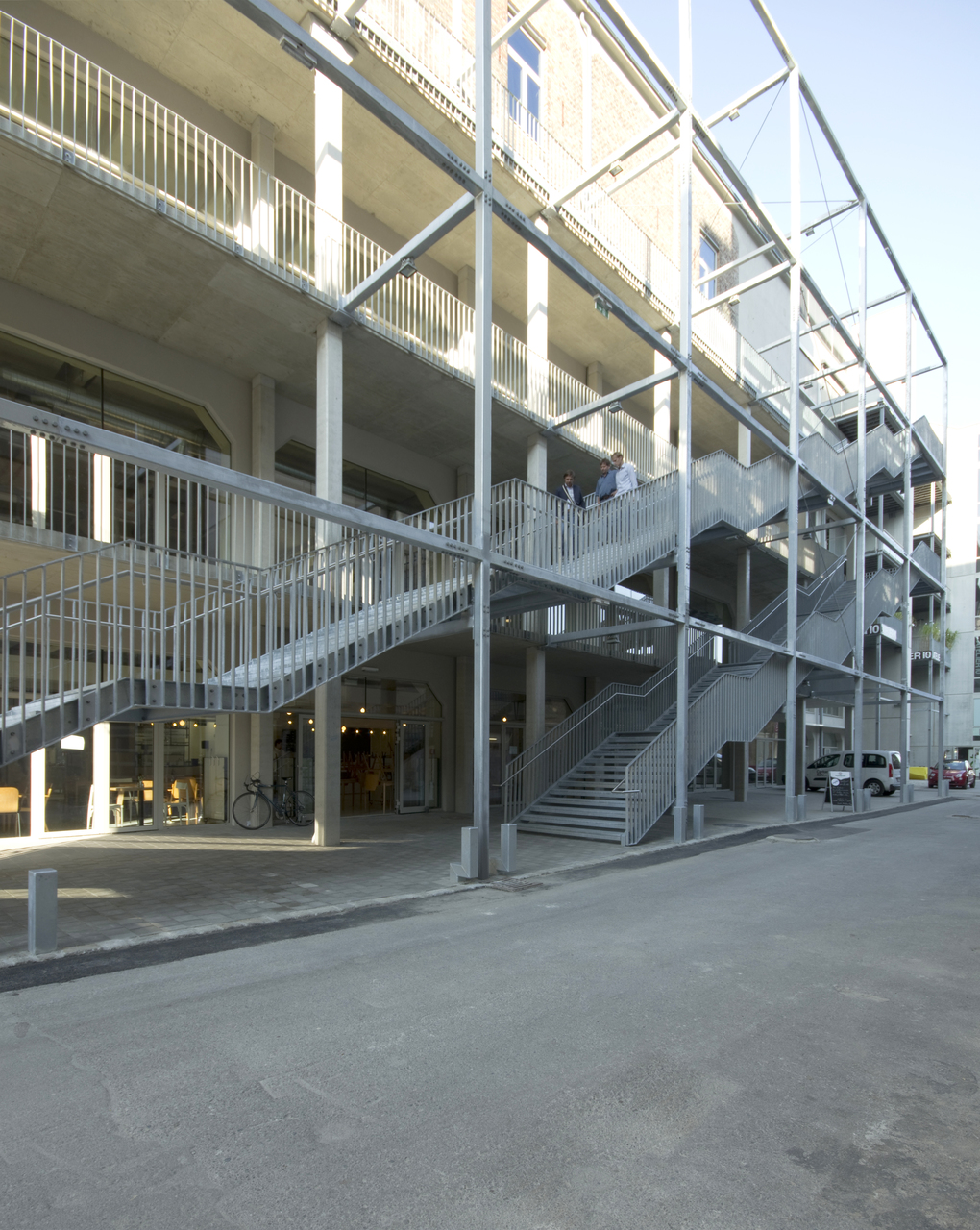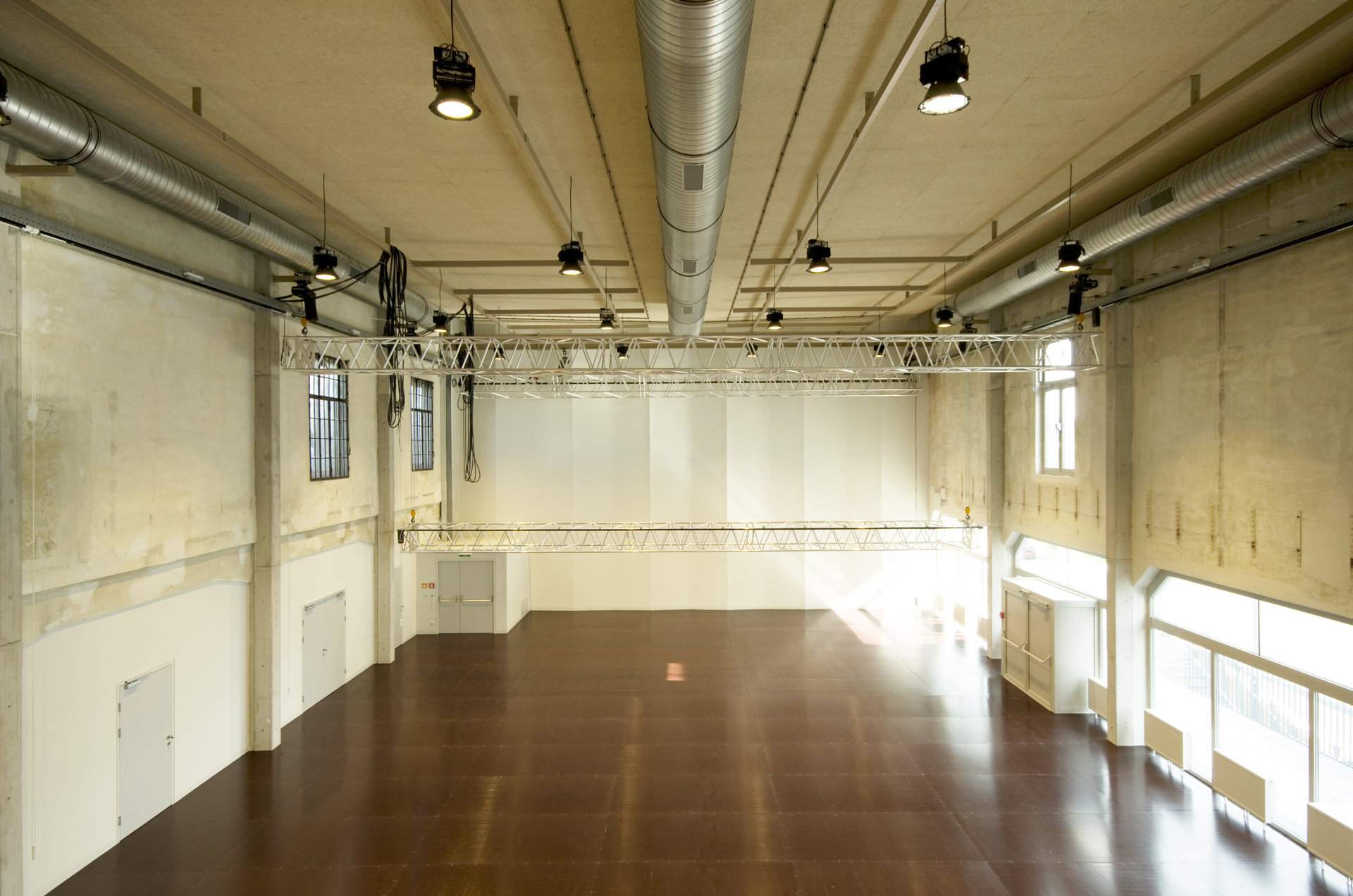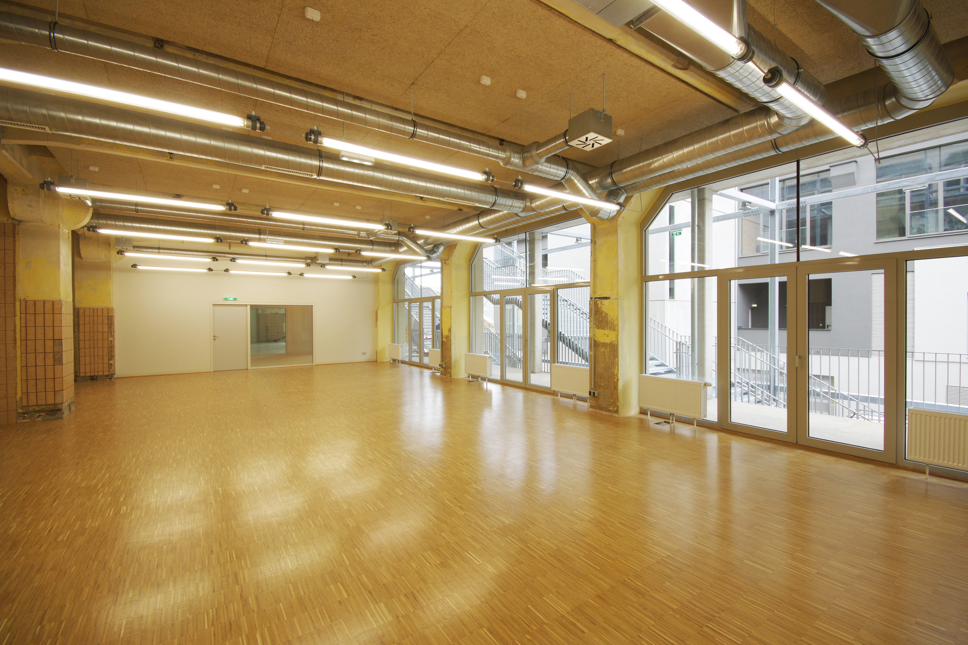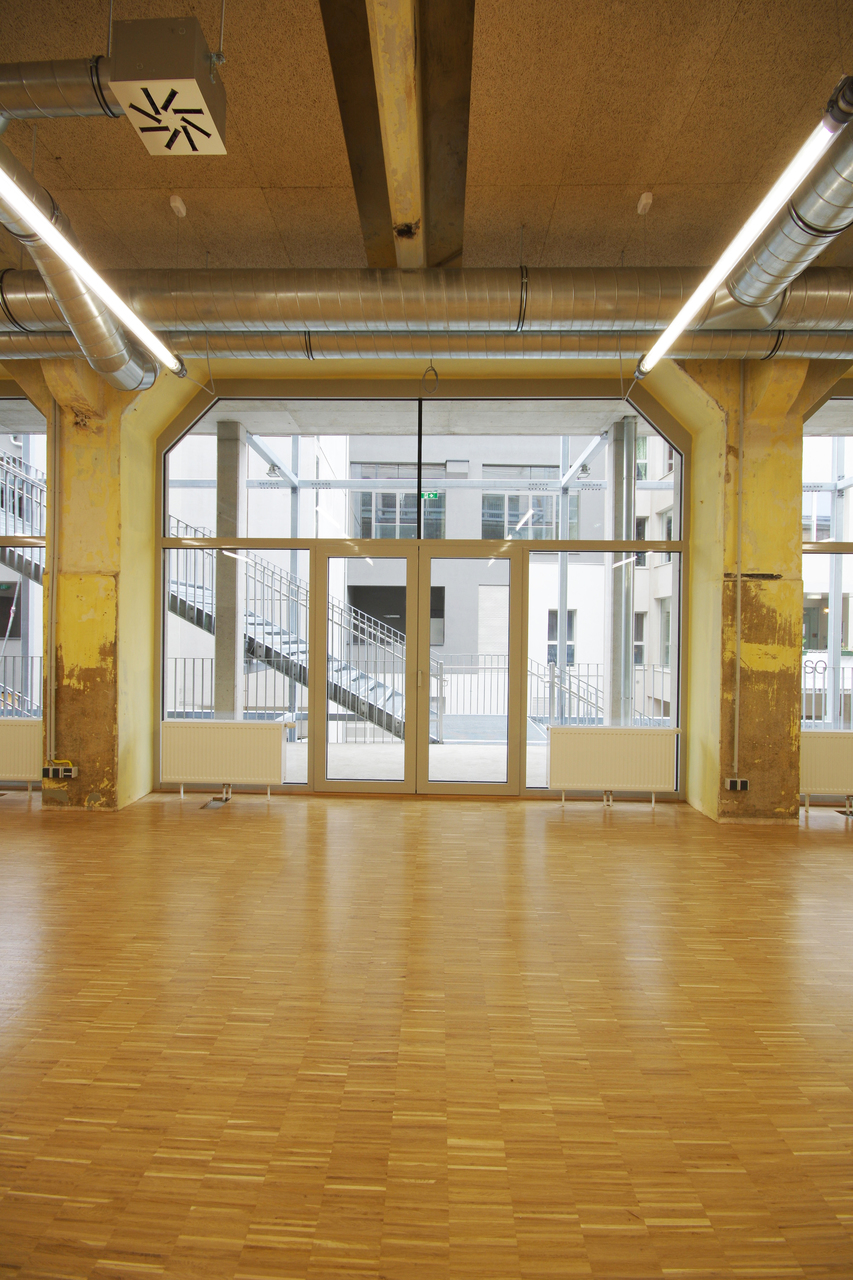 Im Hof inszeniert eine Freitreppe den Aufstieg über drei Geschosse hinauf zum Veranstaltungssaal. Oben angekommen weitet sich das Treppenplateau zur kleinen Terrasse, die in der warmen Jahreszeit als erweitertes Pausenfoyer genutzt werden kann. Der Veranstaltungssaal bietet Platz für 300 Personen und steht dem im Gebäude ansässigen Verein „suparar“ als Aufführungsort zur Verfügung. Der Saal wird auch vermietet und ist entsprechend funktionsoffen mit flexibel auf- und abbaubarer Tribüne gestaltet. Ein akustisch wirksamer Boden stattet den Saal mit der für den Aufführungsort notwendigen raumakustischen Qualität aus. Ein Backstagebereich, Künstlerzimmer, Bar und Foyer komplettieren das Raumangebot rund um den Veranstaltungssaal.