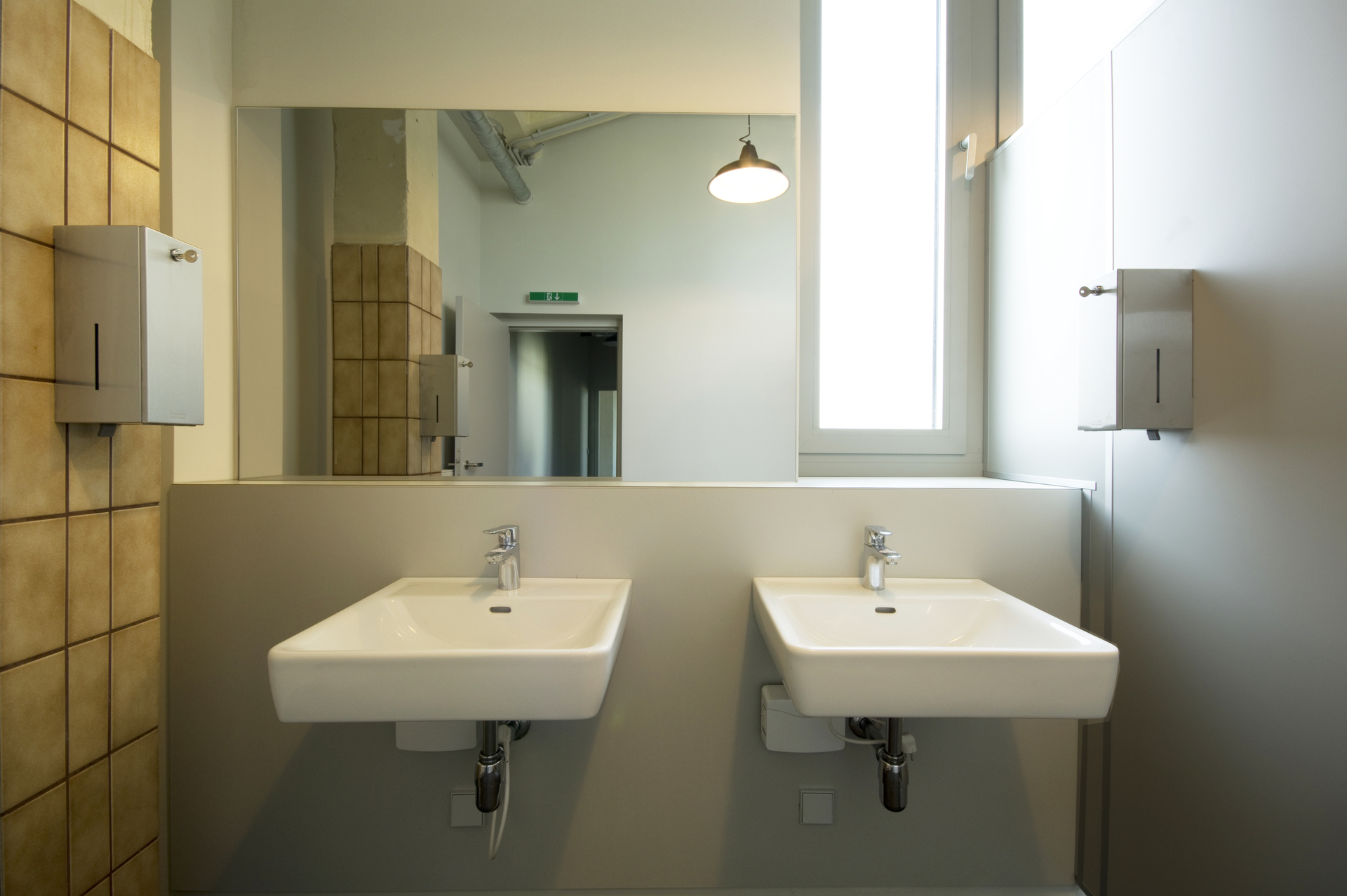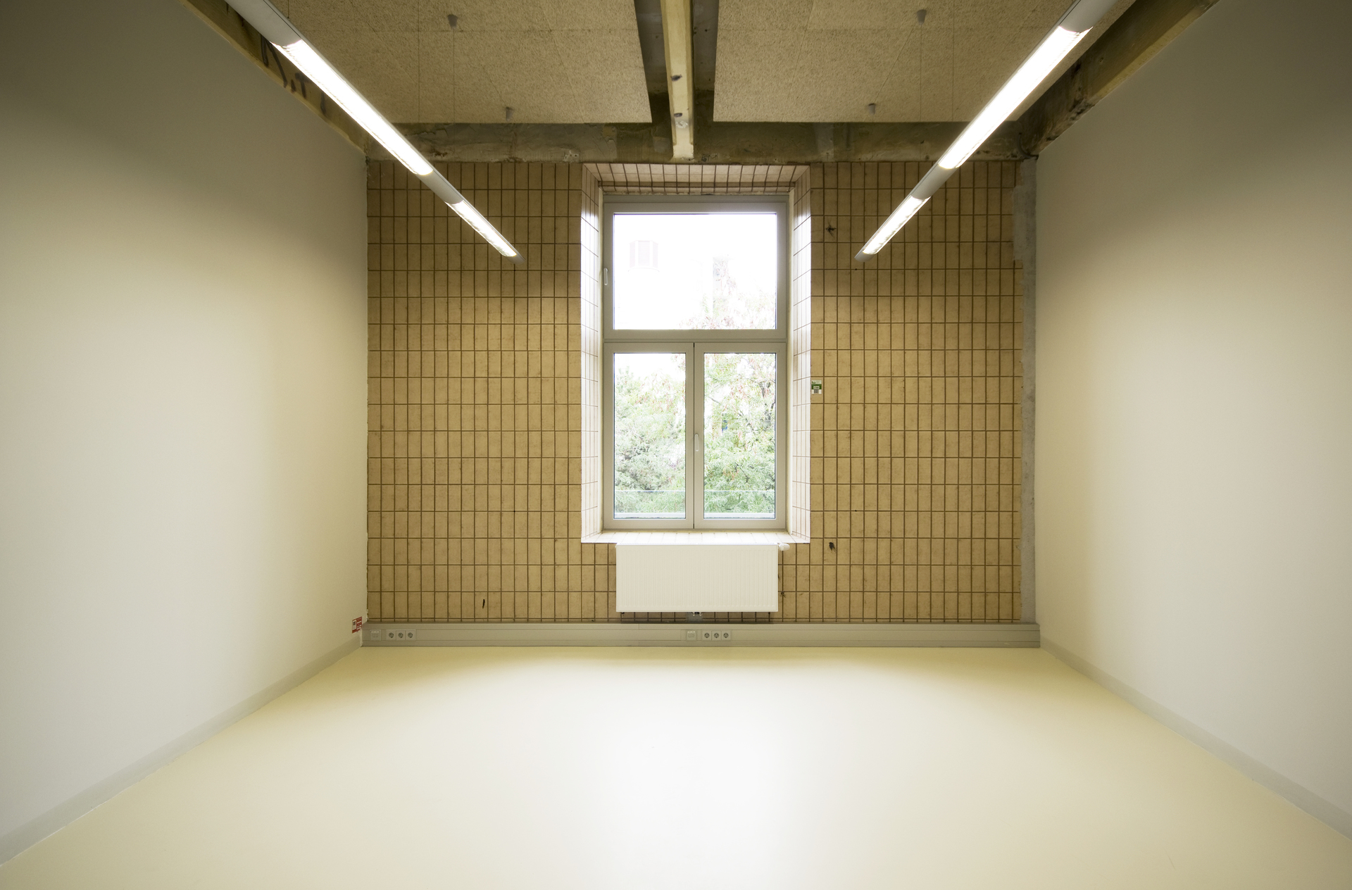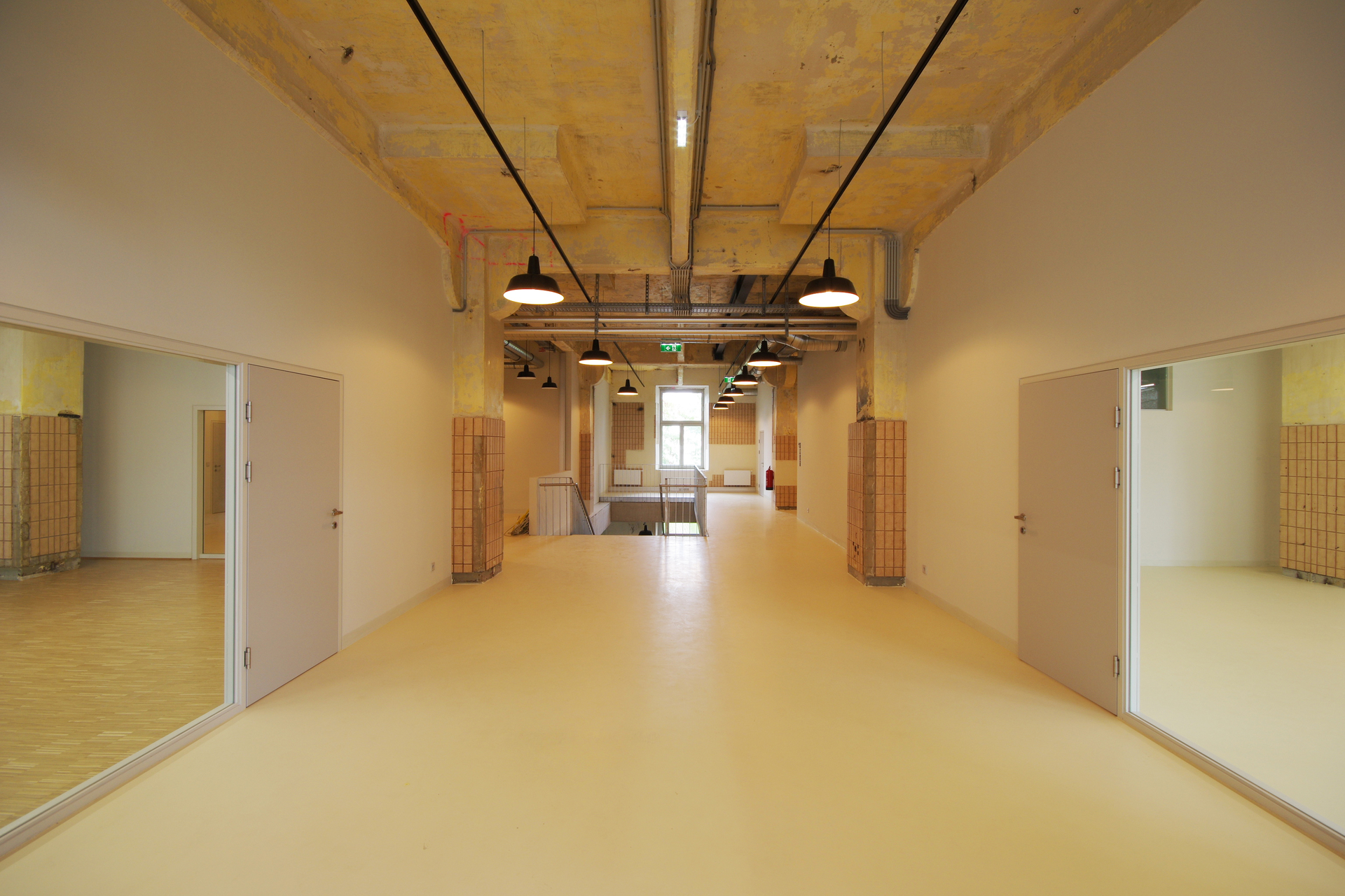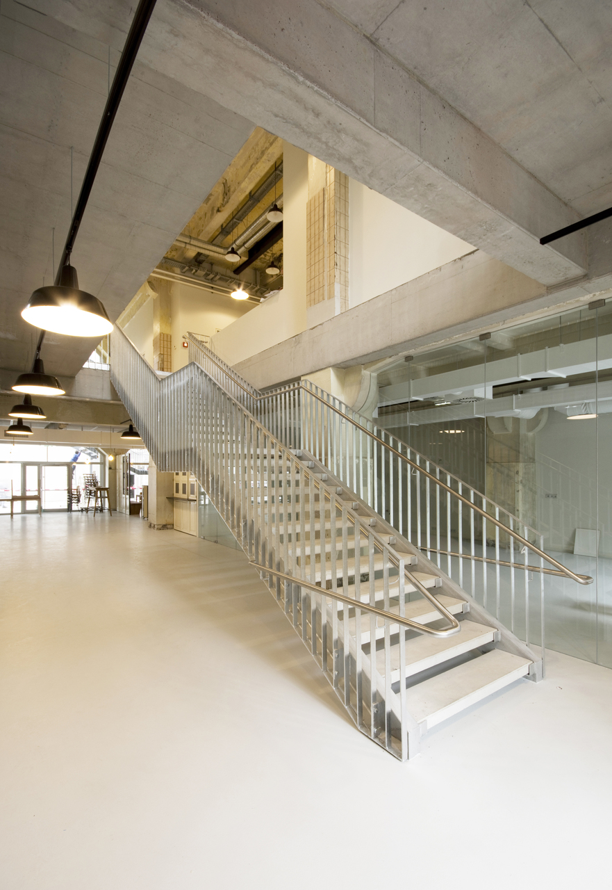 Die Revitalisierung des ehemaligen Fabrikgebäudes erfolgte mit akribischer Behutsamkeit: Neue Elemente kommen nur zurückhaltend zum Einsatz. Wo möglich, wurden Konstruktionen freigestellt, vorstehende Eisenteile abgeschnitten und konserviert. Das Konservieren ist ein generelles Anliegen der Architekten. Die Wertschätzung der Geschichte des Gebäudes, das übrigens nicht unter Denkmalschutz steht, führte sogar so weit, dass rußige Spuren an den Wänden und Decken an abmontierte Rohrleitungen der ehemaligen Produktionsstätte erinnern dürfen. Braune, vertikal verlegte rechteckige Fließen an Wänden und Säulen sind Zeugnisse der 1980er Jahre. Einige Lücken im Fliesenverband wurden bewusst als solche belassen. Die Kinder und Jugendlichen sind eingeladen, sich hier „einzuschreiben“. Persönliche Landkarten schließen nach und nach die Lücken im Bestand (siehe Foto).
