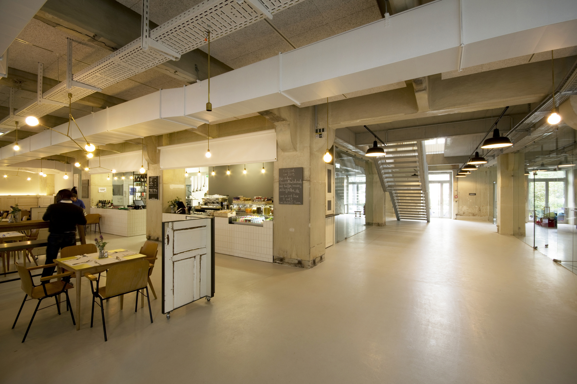 Im Erdgeschoss befinden sich ein Bistro, ein Seminarraum für Kochkurse, Sitzlounges und ein Second Hand Laden. Im Bistro erfährt der mittlerweile etablierte „Shabby Chic“ eine neue Spielart: Auf halbe Höhe gestutzte Altbauflügeltüren bilden Nischen für ein wenig Diskretion. Eine offen gehaltene, großzügig dimensionierte Treppe verbindet das Foyer mit den Räumlichkeiten des Vereins „superar“ im ersten Stock. Hier befinden sich die Probestudios für Musik, Gesang und Tanz sowie die Büroräumlichkeiten des Vereins. Kinder und Jugendliche dürfen im Gebäude visuell wie auch akustisch über „ihren“ Bereich hinaus in Erscheinung treten – das Art Community Center als Haus-Gemeinschaft.
