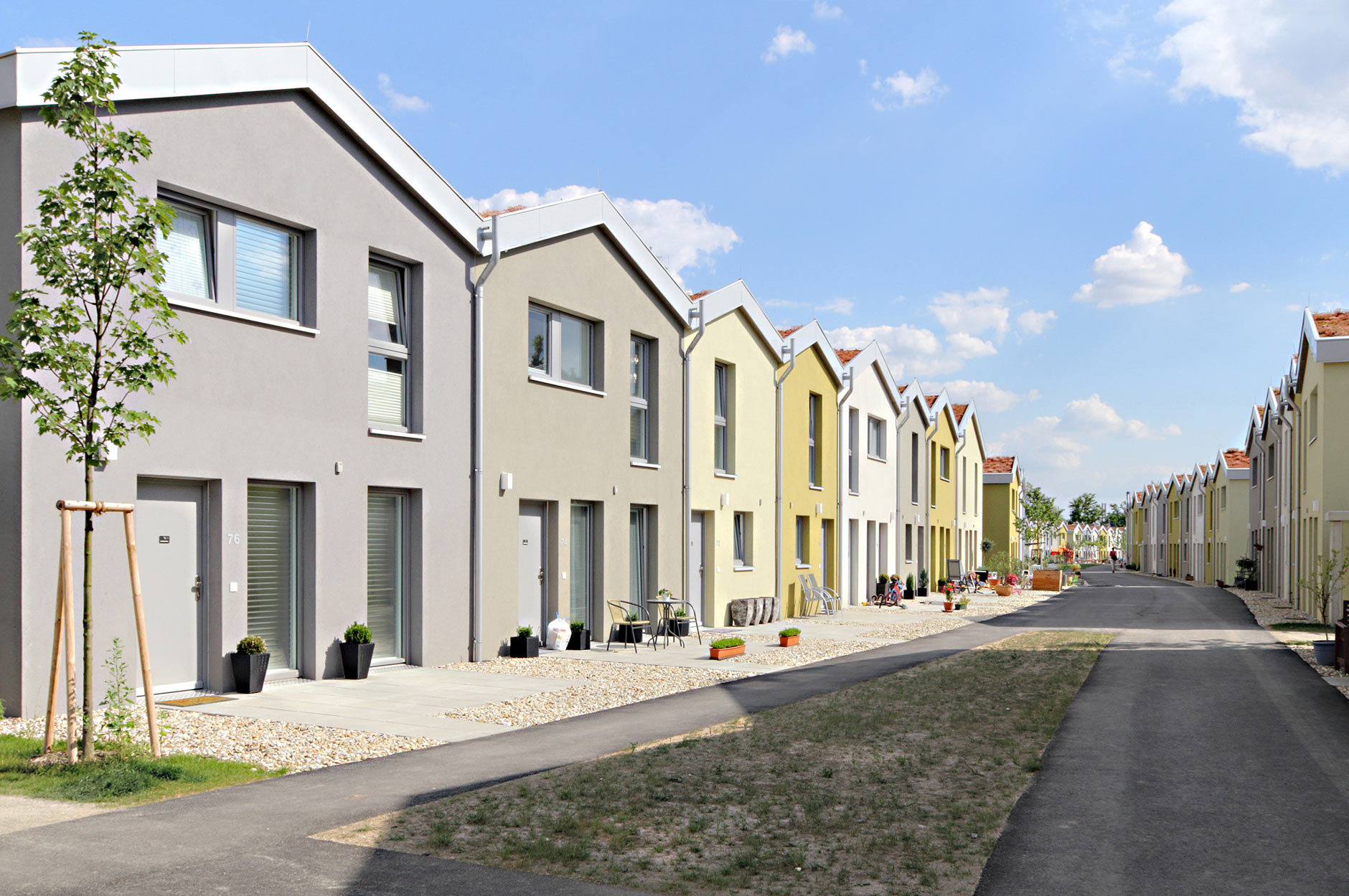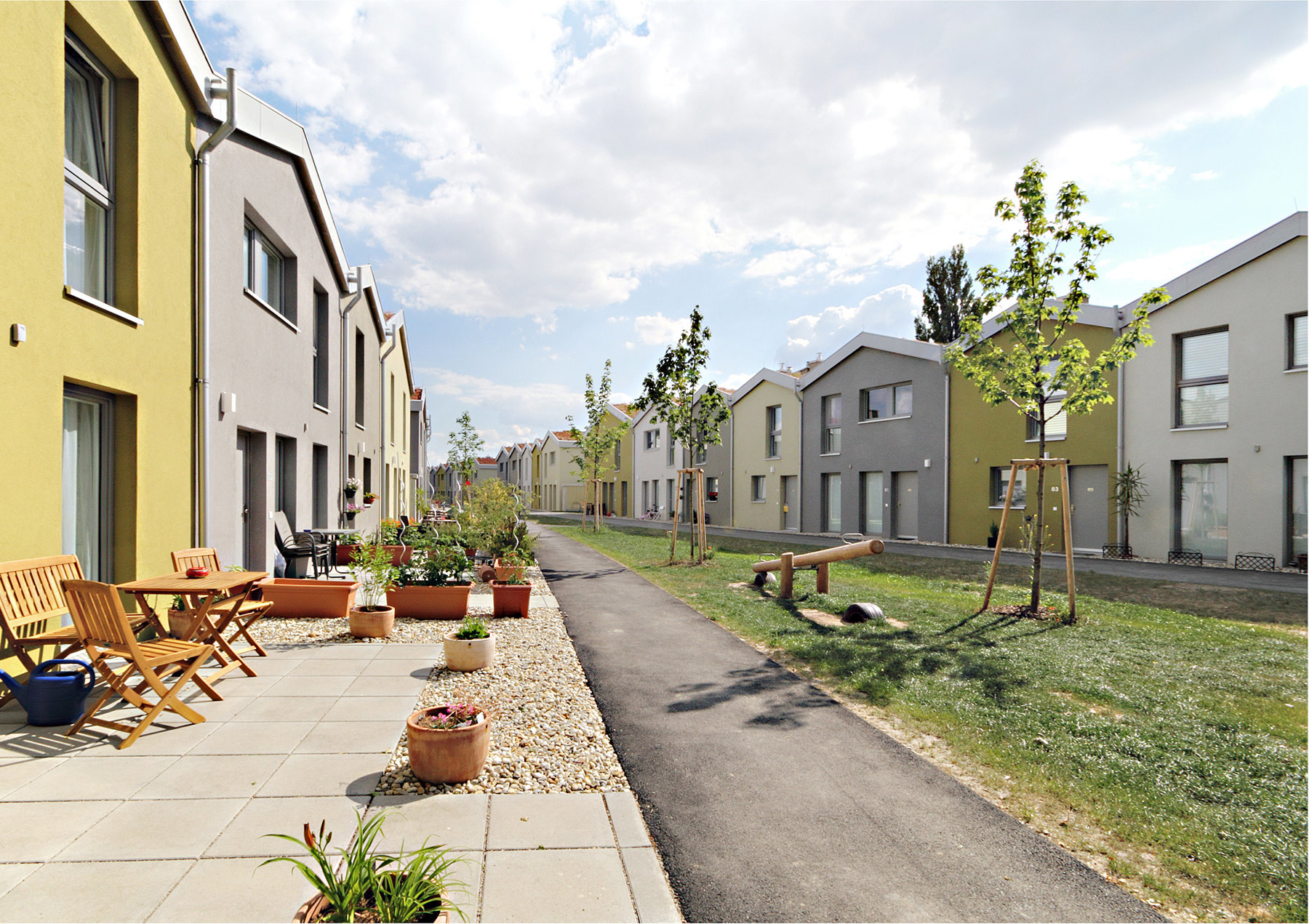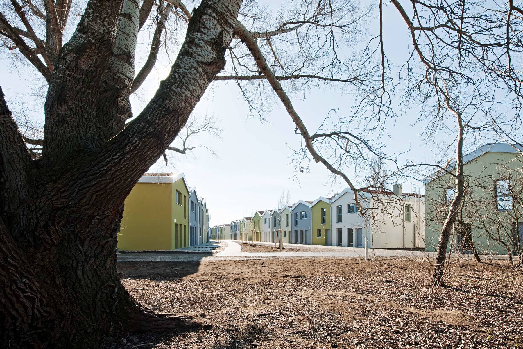 Die Reihenhausanlage besteht aus drei verschieden dimensionierten Haustypen, im größten mit fast 140 m² ist genug Platz für eine mehrköpfige Familie oder kombiniertes Wohnen und Arbeiten. Die Ausstattung ist für einen geförderten Wohnbau bemerkenswert: Im Erdgeschoss befinden sich ein Nutzraum mit Wasseranschluss und eine „Solldurchbruchstelle“, wo mit wenig Aufwand aus zwei Zimmern ein großer Raum entstehen kann. Das mittlere Reihenhaus deckt mit 95 m² die klassische Nachfrage nach 4 Zimmern ab, wohingegen das kleinste mit nur 65 m² und drei Zimmern durch seine entsprechend niedrigen Kosten für breite sozialen Schichten und differenzierte Familienformen die Möglichkeit des eigenen Hauses im Grünen bietet.