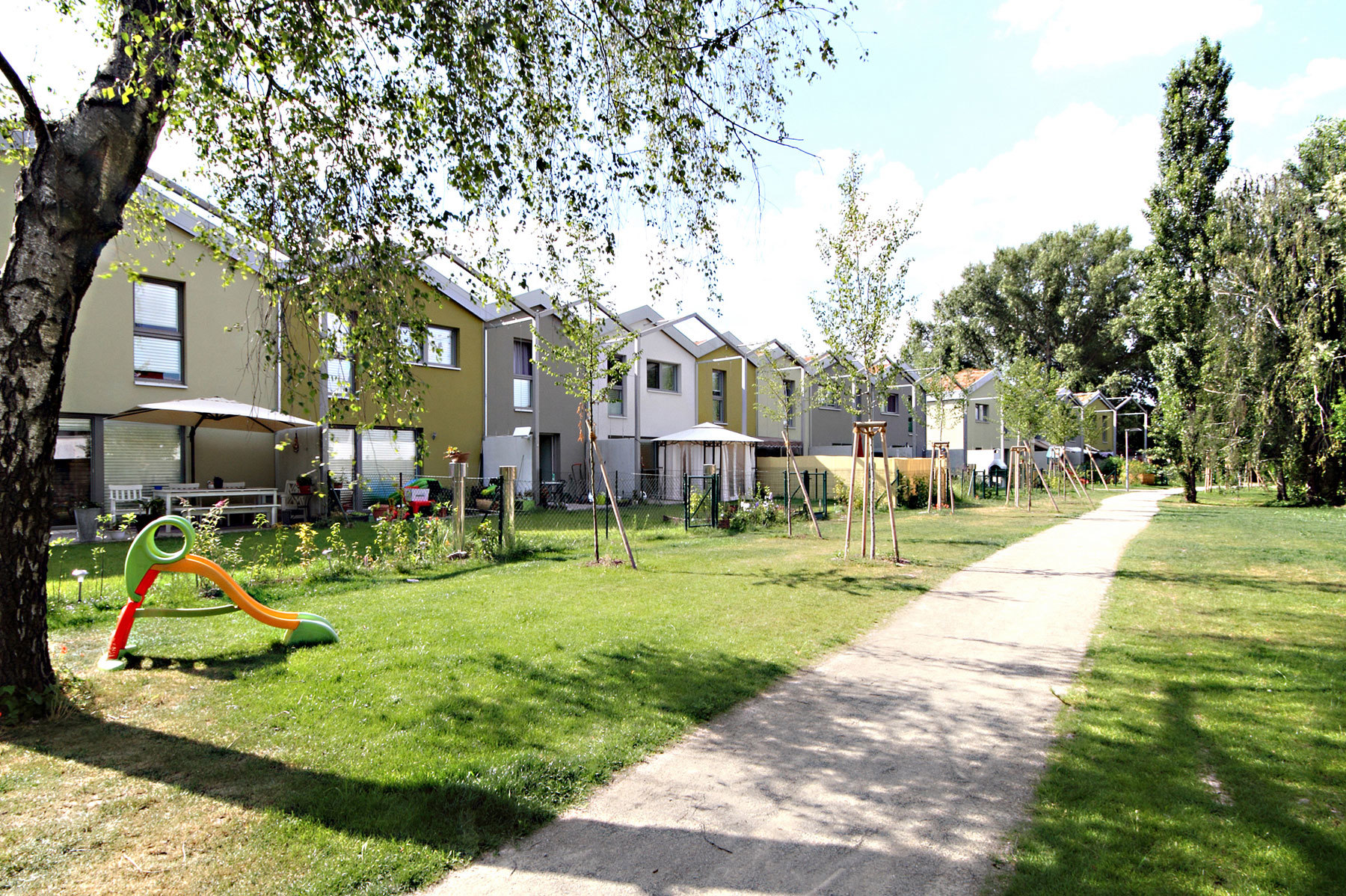 Auf der dem Anger abgewandten Seite befinden sich die privaten Garteneinheiten. Pergola-Konstruktionen sollen hier künftig Schatten und Privatheit bieten. Die notwendigen Pflanztröge fehlen jedoch, es hängt nun vom Engagement der Bewohner ab, ob die massiven Rankgerüste künftig ihre Funktion erfüllen können werden. Die Chancen stehen gut, denn die Bewohner entwickeln einen ausgeprägten Gestaltungswillen, das ist wenige Monate nach der Schlüsselübergabe rund um den Anger ablesbar. Das Engagement der Bewohner stößt jedoch auch an seine Grenzen. So konnte z.B. das Vorhaben, nachträglich Vordächer anzubringen, um das Regenwasser vom Eingangsbereich fernzuhalten, nicht umgesetzt werden. Der Bauträger argumentiert mit der baulichen Substanz (die Wärmedämmung könnte in Mitleidenschaft gezogen werden), aber auch mit der geförderten Nutzfläche, die nicht überschritten werden darf. Auch wenn die Architektur es beinahe vergessen macht, handelt es sich hier um geförderte Mietwohnungen.