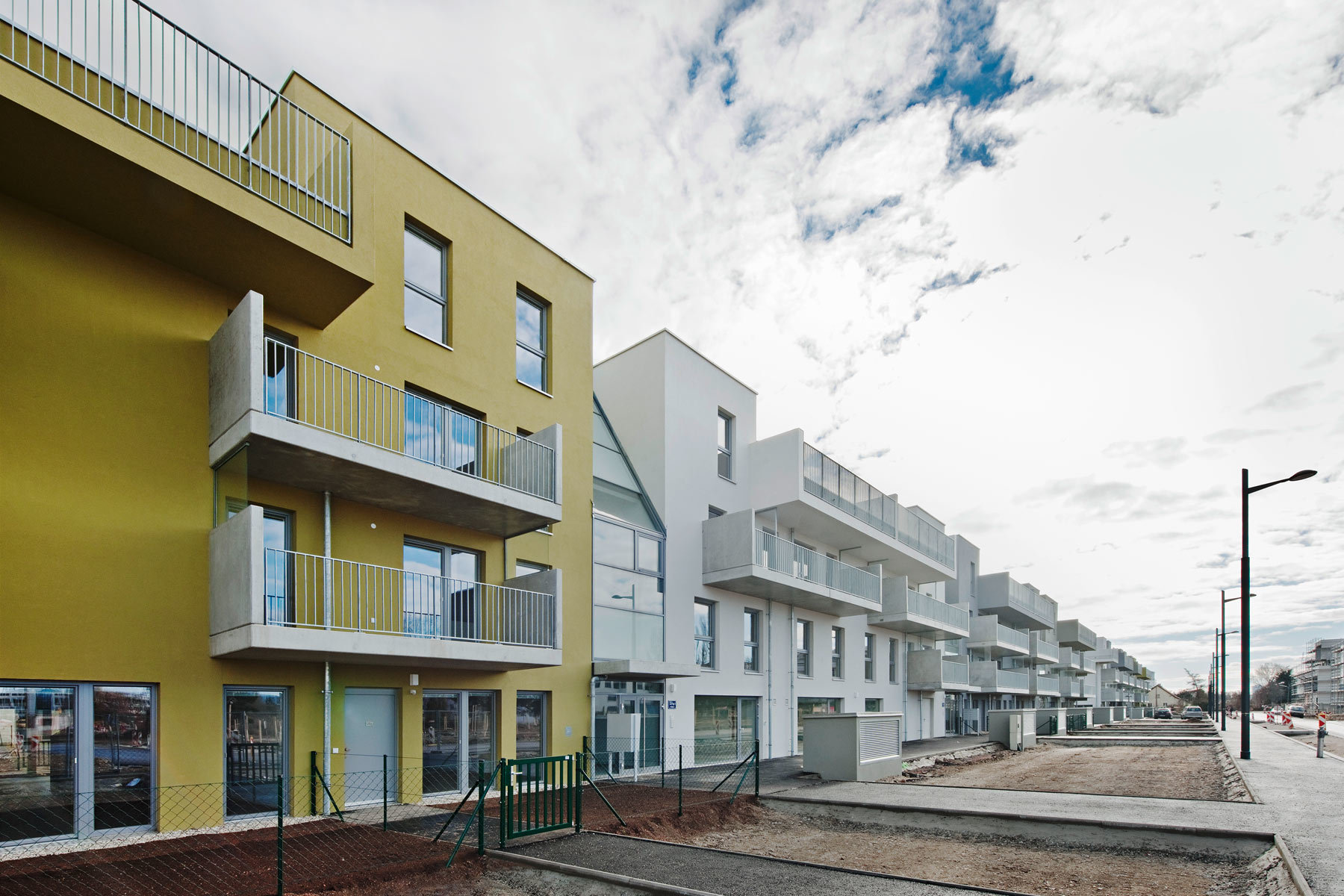 Straßenseitig bilden Geschosswohnbauten den Übergang zum dichter bebauten benachbarten Neubaugebiet und verfügt wie auch die Reihenhäuser über eine große Bandbreite an verschiedenen Wohnungstypologien. Hier befinden sich auch Gemeinschaftsräume, Kellerabteile und Garagenplätze für die gesamte Wohnanlage.