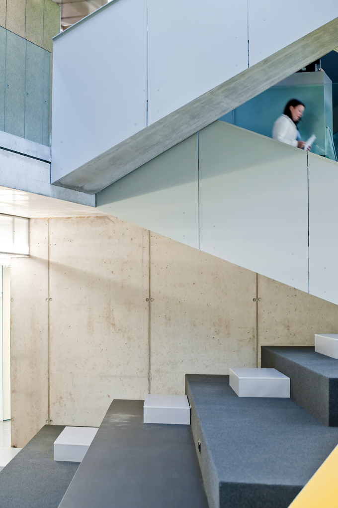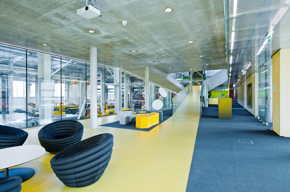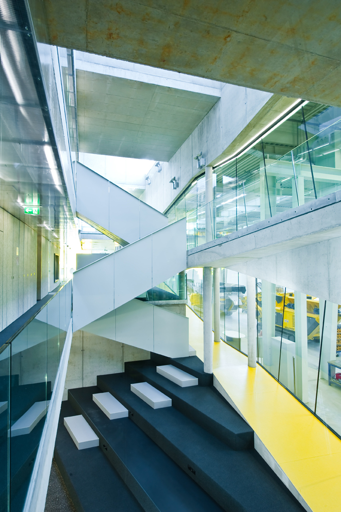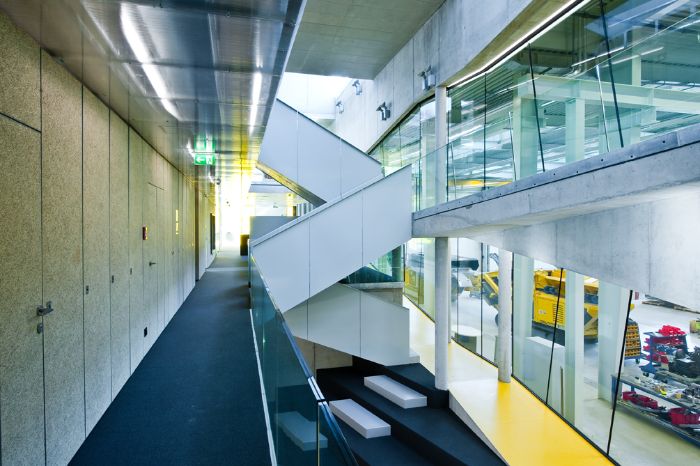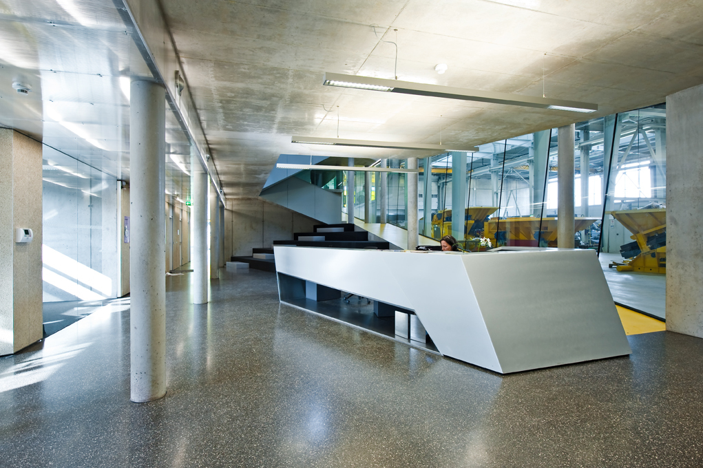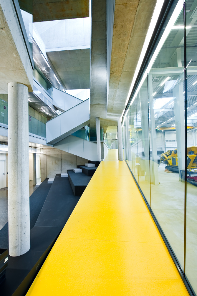 Der neue Haupteingang ist zentral angeordnet. Ihm folgt der Empfangsbereich, der mit der großzügigen Stufenlandschaft und der zentralen Rampe zu einem komplexen Raumkontinuum verschmilzt. Diesem Bereich sind unterschiedlichste Kommunikationszonen für die Mitarbeiter und Kunden angeschlossen. Das räumliche und visuelle Verbinden der Bereiche Büro und Produktion an einer Stelle wo üblicherweise die Nebenräume angeordnet sind, machte ein Umdenken in der Anordnung aller Funktionen notwendig. Das Fluchtstiegenhaus, die Sanitäranlagen und die Technikräume wurden demnach nach außen an die Südfassade verlegt, um das Innere des Gebäudes der direkten Sichtverbindung in die Halle zu widmen. Der innenliegende Luftraum über der Rampe und auch die Montagehallen werden über nach Norden gerichtete Dachsheds optimal belichtet. Die zweigeschossige Cafeteria öffnet sich zu einem begrünten Innenhof, der das Bindeglied zum Mitarbeitersozialtrakt mit Umkleiden, Sanitärräumen herstellt. Der Bürotrakt wurde in sichtbarer Massivbauweise errichtet, die Materialität von Stahlbeton deckt sich mit dem Einsatzgebiet der hergestellten Maschinen. Abgehängte Decken aus transluzenten Acrylplatten beinhalten die gesamte zu verteilende Technik, ein Doppelboden ermöglicht Flexibilität in der Raumanordnung. Die akustische Optimierung des Innenraumes wird über beplankte Schrankzonen gelöst.