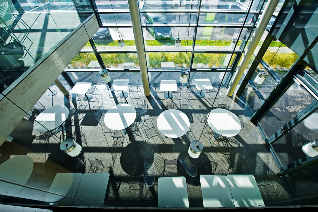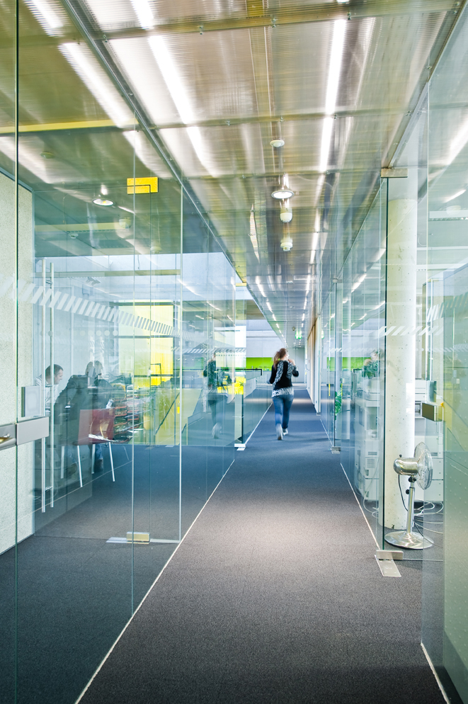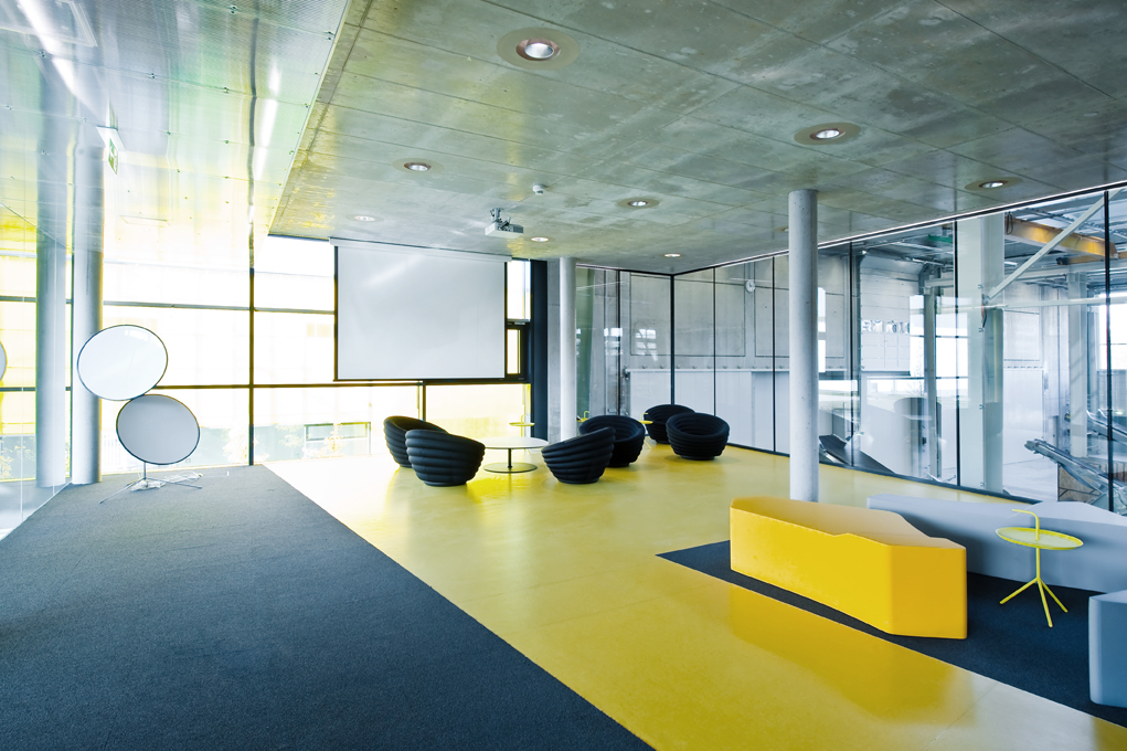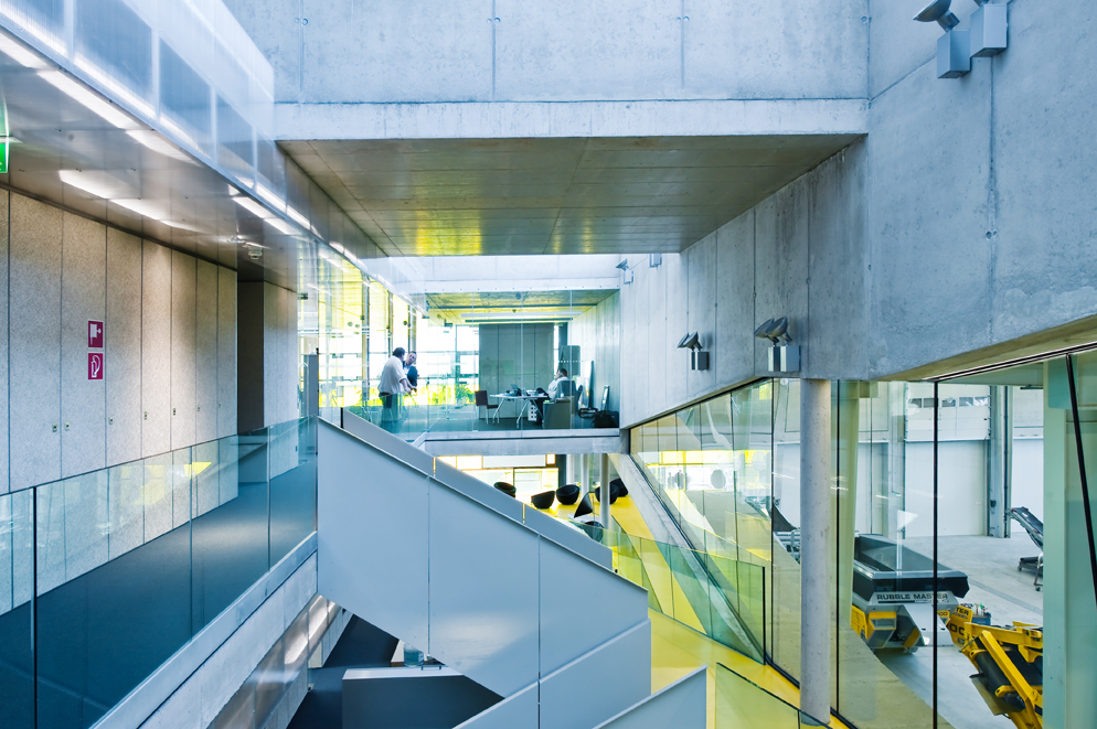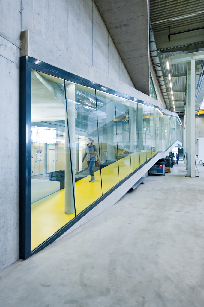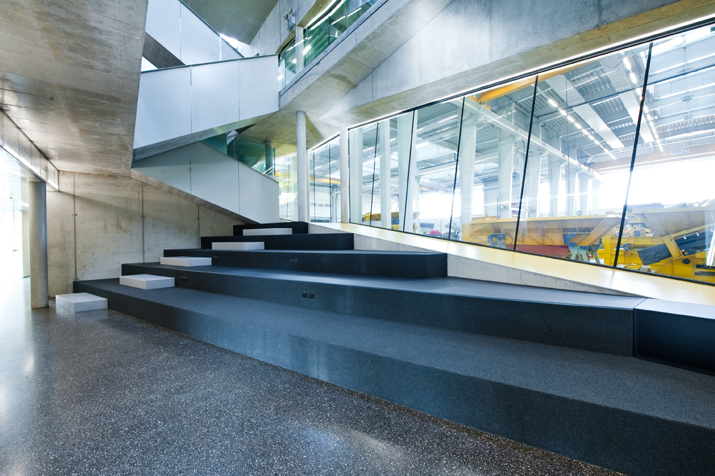 Die innere Öffnung zwischen Management (Bürotrakt) und Monteurinnen (Montagehalle) ist Kernstück der innerbetrieblichen Zielsetzung. Anstatt der üblichen Wand zwischen Büro und Montage und den verbundenen Defiziten an Kontakt und Informationsfluss wird ein transparenter und gemeinschaftlich genutzter Bereich für Alle Mitarbeiterinnen eingeführt. Damit wird die in den 60-er Jahren für moderne Bürobauten entwickelte sogenannte „Kombizone“ in neuartiger Weise auf einen Industriebau übertragen. Der offene Bereich enthält sämtliche gemeinsam genutzten Einrichtungen. Die Rampe als „Boulevard“ durch die Mitte des Unternehmens dient auch als Weg für Kunden und Lieferanten durch die Anlage. Dieses völlig authentische Eintauchen in die Produktion bildet ein zentrales und durch andere Marketingmittel nicht ersetzbares Element einer nachhaltigen Kundenbeziehung. Die hohen Standards des Werkes werden in besonderer Weise real erlebbar, sowohl am Boden der Halle im Nahbereich der Produktion als auch aus der Vogelperspektive, welche man mit dem Entlangschreiten an der Rampe zunehmend einnimmt.