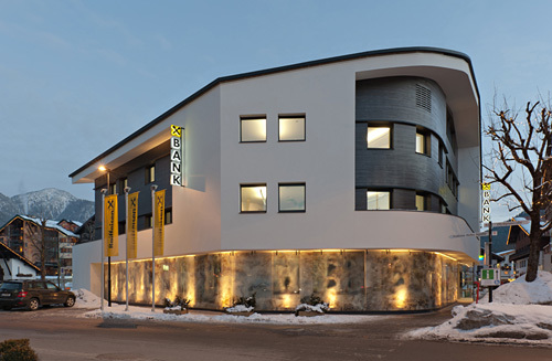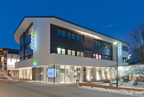 Im äußeren Erscheinungsbild behält die in sehr kurzer Zeit und mit strengem Kostenkorsett umgebaute Bank zwar den alpinen Charakter, ist nun aber ein homogenes Ganzes, das sich von der üblichen umgebenden Hotelarchitektur klar als Bürohaus abhebt. In der Sockelzone wurde eine Membran zum Straßenraum hin geschaffen – eine Intervention der Wiener Künstlerin Teresa Mar, die sich der Geschichte von Seefeld widmet. Die bedruckten, gekrümmten Glaselemente filtern die Blicke der Passanten und schaffen die notwendige Diskretion, führen aber gleichzeitig Tageslicht in die erdgeschossigen Beraterbüros. (Text: Claudia Wedekind nach einem Text der Architekten)