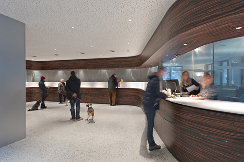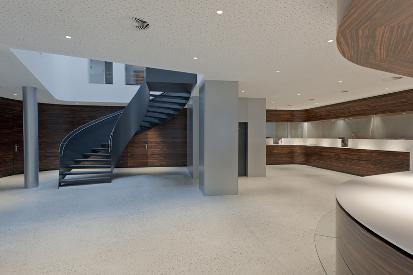 Zentral im Erdgeschoss befindet sich die Schalterhalle, ein offener Kundenbereich, durch den sich die geschwungene Holzsstruktur der Schalter zieht. Die parallel dazu verlaufende Glasfront wurde mit einem feinmaschigen Stahlgewebe versehen, das zwar das Tageslicht durchschimmern lässt, zu den dahinter liegenden Beratungsbüros hin aber eine blickdichte Rückwand bildet und damit die gewünschte Diskretion bietet. Vom Atrium aus führt eine Wendeltreppe hinauf ins erste Obergeschoss und weiter in ein großzügiges Entrée mit dem frei stehenden Sekretariat als Anlauf- und Verteilerstelle für den Kunden. Die nur für die Mitarbeiter der Bank zugängliche Erschließung zu den oberen Etagen wurde hinter einer durchgängigen Holzverkleidung verborgen. Das vorher aufgrund der Steilheit des Satteldachs kaum nutzbare Dachgeschoss wurde in einen lichtdurchfluteten Teamraum und einen ebenfalls großzügig verglasten Besprechungsraum transformiert.