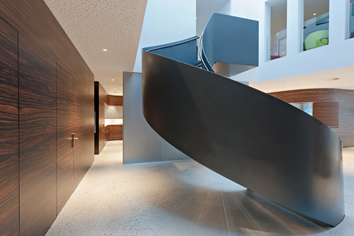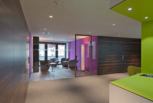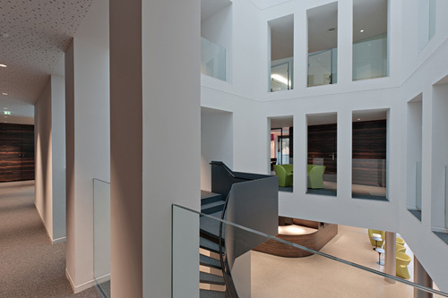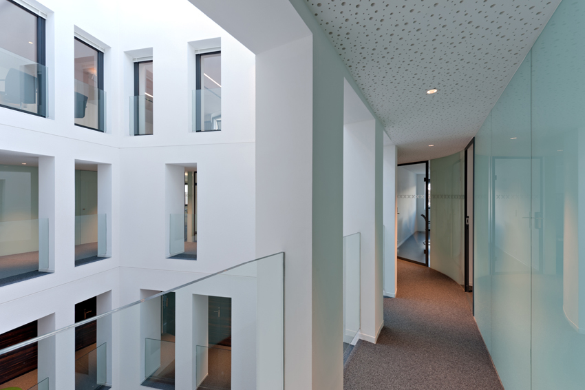 Die zentrale Idee bestand darin, in den Bestand einen Lichthof einzufügen, der das Tageslicht bis in die Erdgeschosszone führt und zwischen sämtlichen Geschossen visuelle Verbindungen und räumliche Verschränkungen ermöglicht. Aus der vorgefundenen Statik des Gebäudes abgeleitet, konnte das Atrium ohne große bauliche Eingriffe umgesetzt werden und bildet nun die zentrale, kommunikationsreiche Mitte, um die geschossweise die Erschließungszone der Büros liegt.