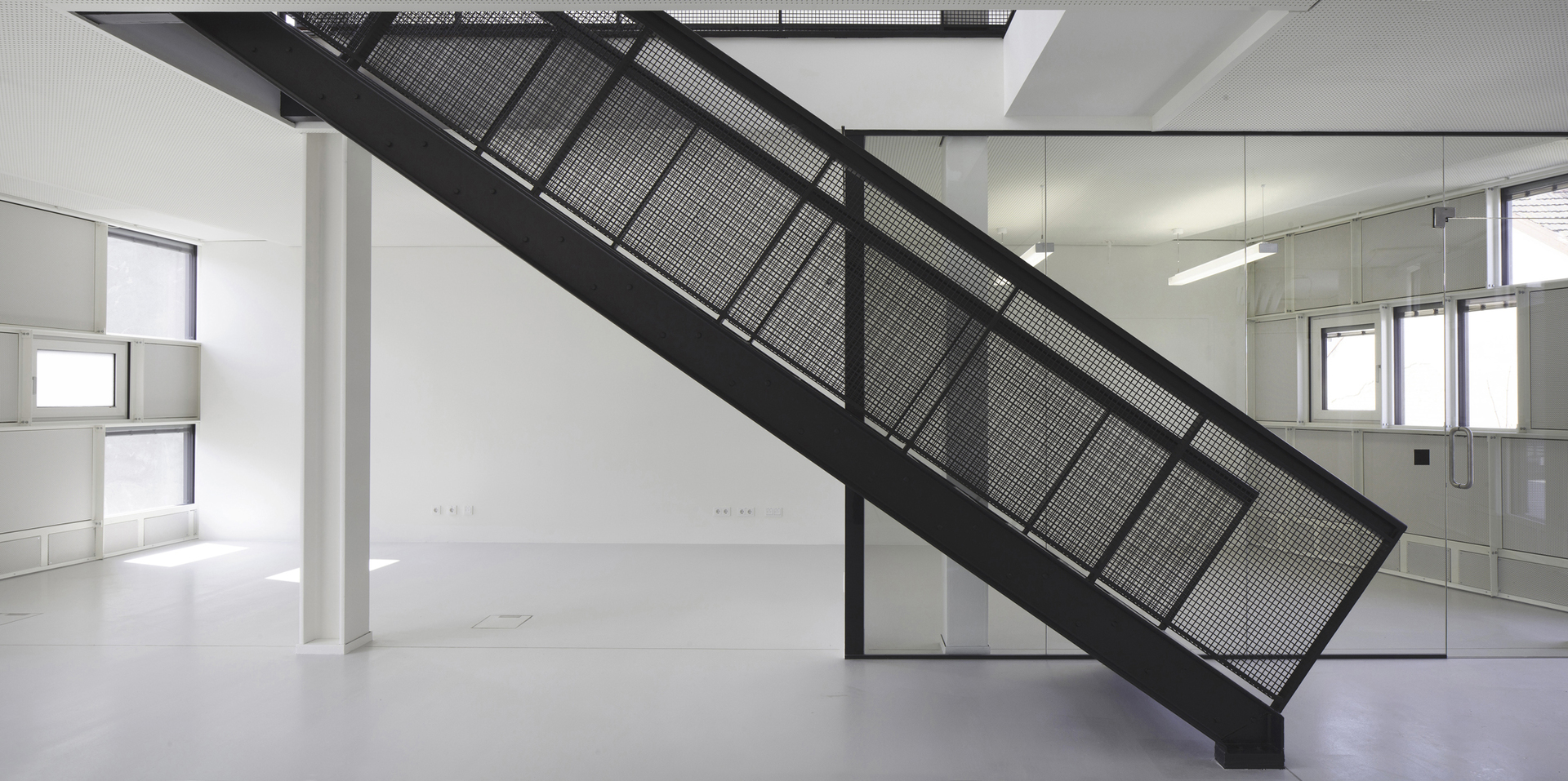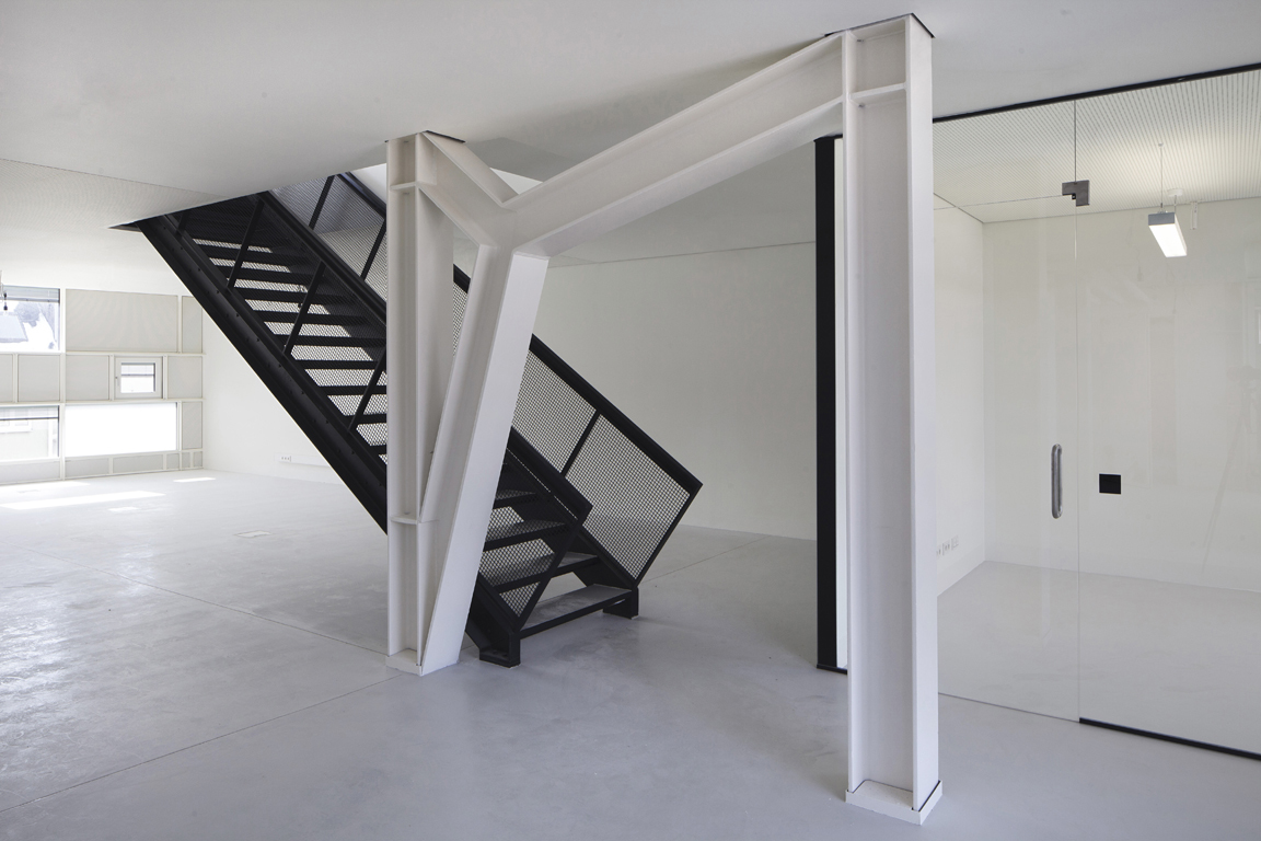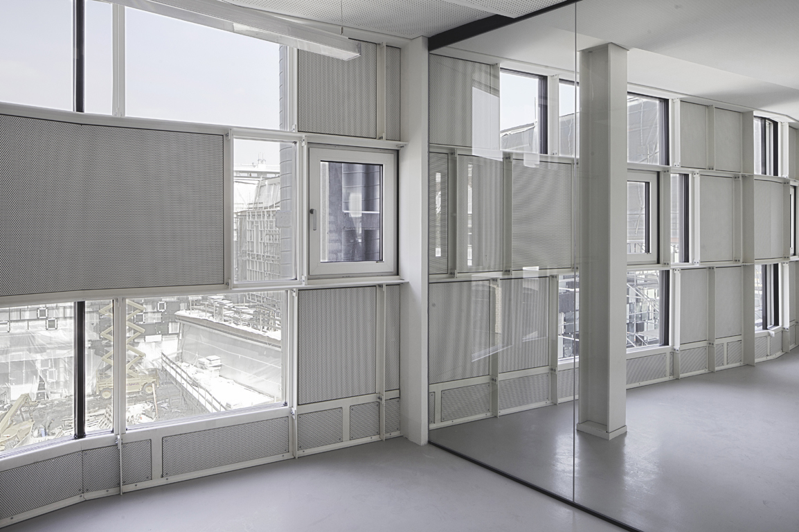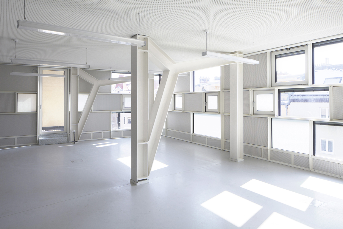 Der Aufbau der straßenseitigen Fassade besteht aus einer hochisolierten Pfosten-Riegel-Stahlkonstruktion, die für das Projekt eigens aus Systemteilen entwickelt wurde. Wie ein regalartiges Möbelstück, handwerklich mit Schraubenverbindungen erstellt, ist es mit verschiedenen Ausfachungen in liegenden Formaten bestückt. Zwischen den weißlackierten Metallschwertern sind in unregelmäßiger Reihenfolge Sonnenschutzglas, transluzente Füllungen (Kapillarglas zur Lichtlenkung) und Metallpaneele eingesetzt, wodurch ein lebendiges, plastisches Fassadenbild von außen entsteht.