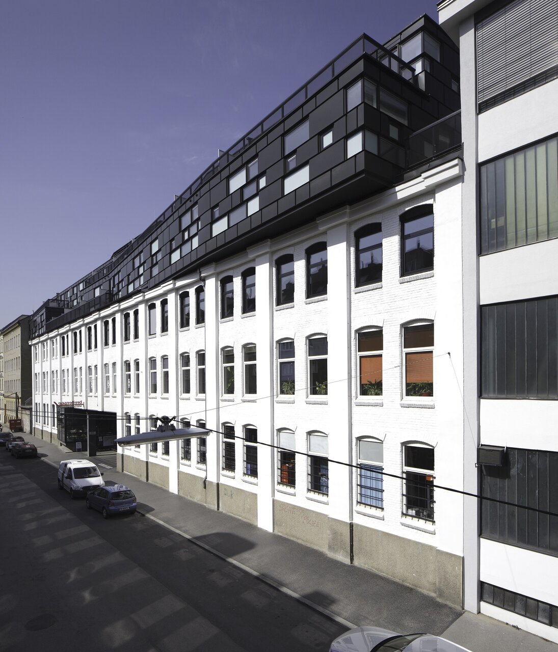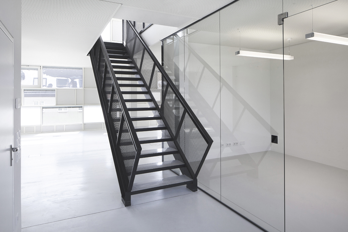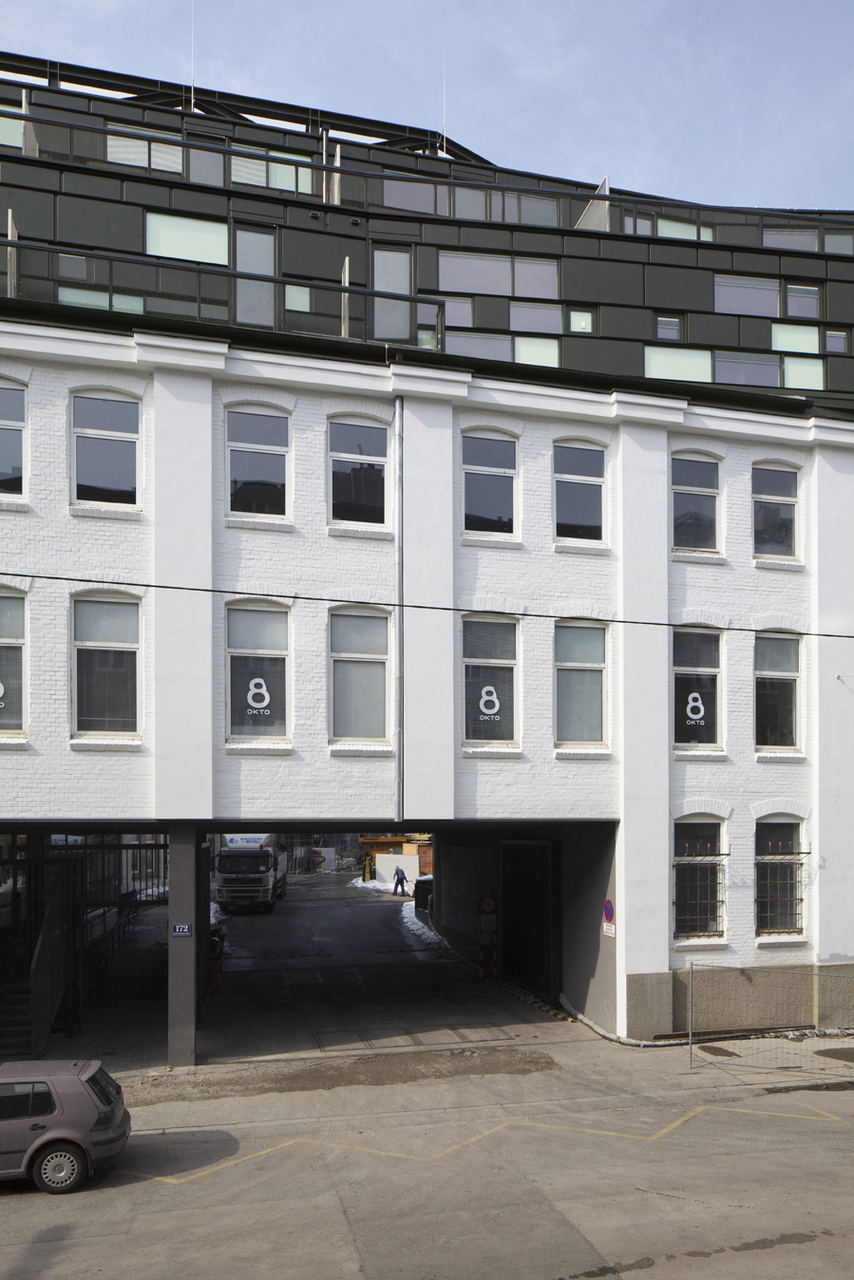 Der zweigeschossige Neubau legt sich als eigenständiger, horizontal ausgerichteter Bauteil auf das Bestandsgebäude (Sockel). Die Lücke des Straßenzuges im Bereich Trafogebäude innerhalb der geschlossenen Blockrandbebauung wird mit Balkonen für die Gründerzeitbüros geschlossen. Die Auskragung (per Definition Erker) am Ende stellt den Bezug und gleichsam die Verbindung zum Neubau im Innenhof dar und definiert den Freibereich (Büroterrasse) als Fuge zum angrenzenden 60er Jahre Industriebau im Osten.