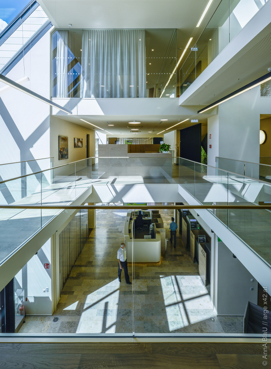 Das Forum wurde als Kommunikationsraum gestaltet. Die Kommunikation kann auf vielen Ebenen stattfinden: Brücken und Galerien machen die internen Abläufe sichtbar. Die leicht erhöhte Lounge bietet einen guten Überblick über das Forum und lädt mit Café und Internet auch zum Verweilen ein. Hier können informelle Beratungsgespräche stattfinden. Transluzente Vorhänge hinter Glastrennwänden steuern die Blickbeziehungen zwischen allgemeinen Bereichen und Beratungs- bzw. Bürozonen.