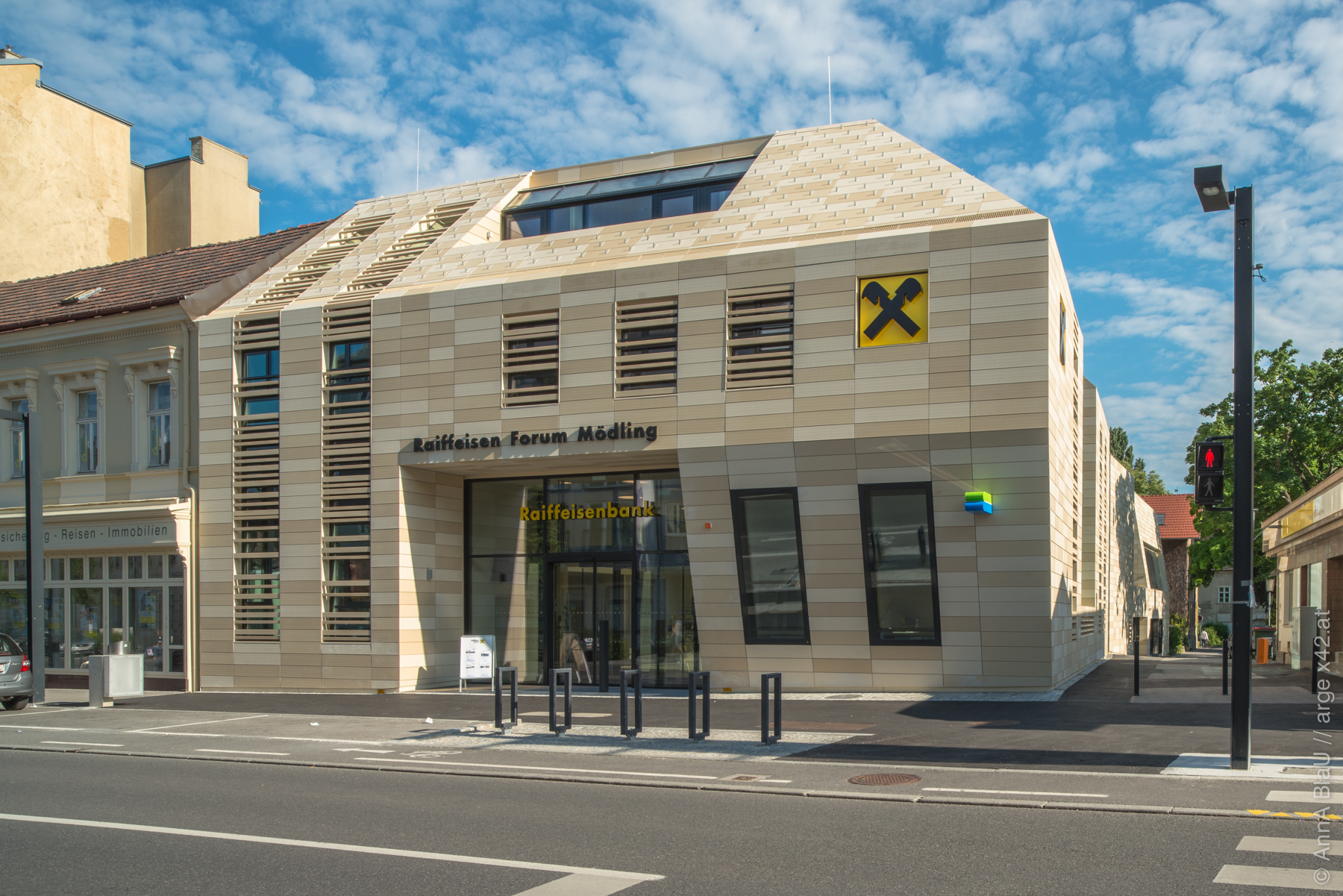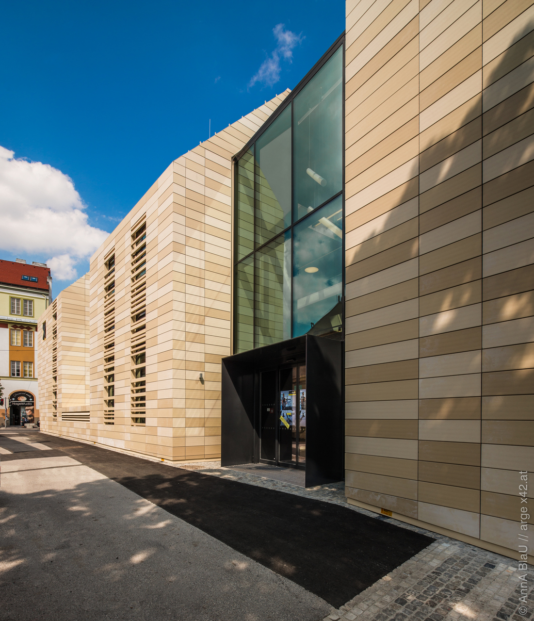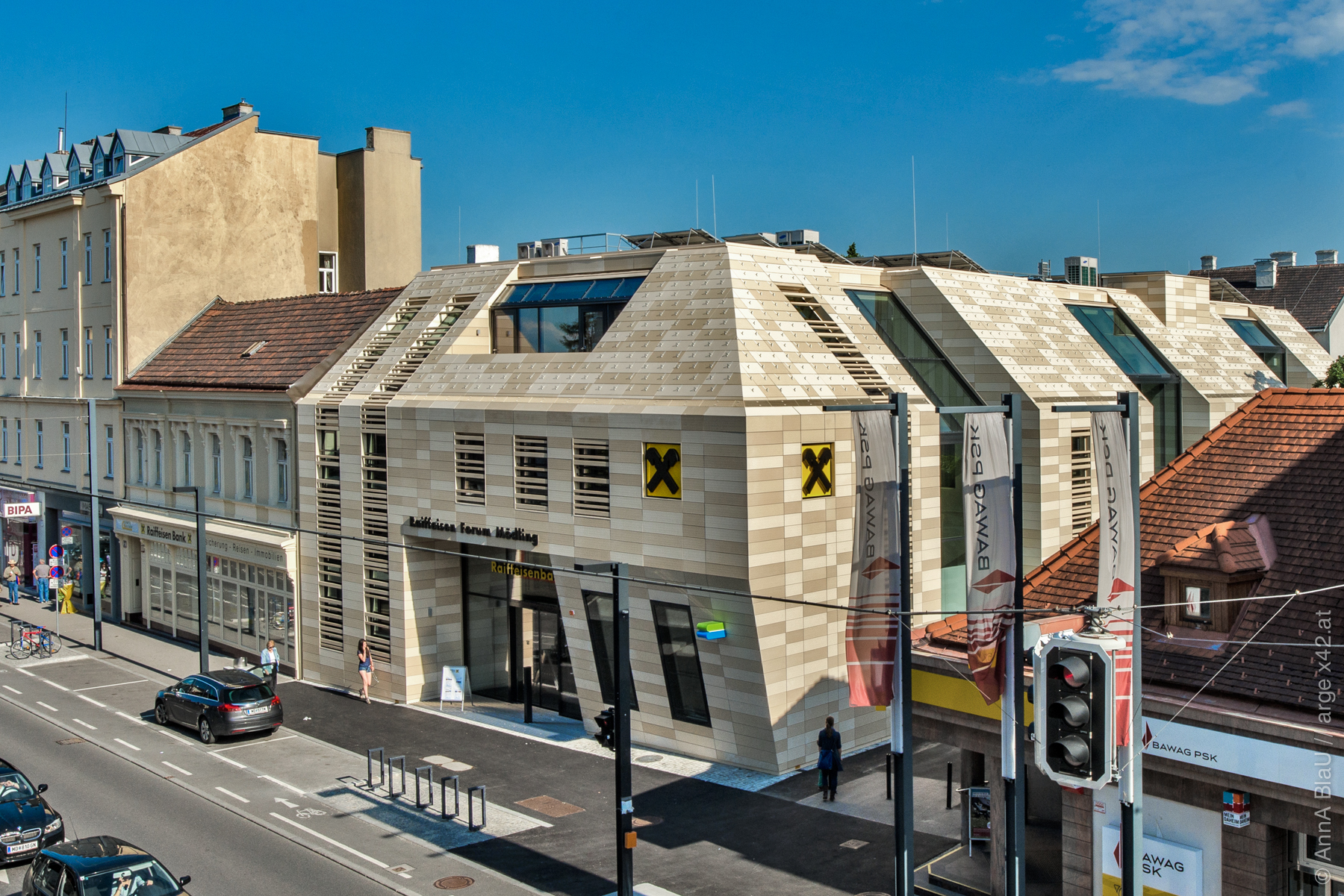 Die Hauptfront des Gebäudes liegt direkt an der Hauptstraße in prominenter Lage zwischen Bahnhof und historischem Zentrum. Der Bau zieht sich mit seiner langen Westfassade tief in die enge Freihofgasse, die von historischen, freistehenden Gebäuden geprägt ist. Hier wurde die Massivität des Gebäudes mit großzügig verglasten Einschnitten „gebrochen“ und an die Kleinteiligkeit des baulichen Umfelds herangeführt. Im Bereich des Haupteingangs wurde der öffentliche Raum erweitert, indem die Hauptstraßenfassade im Eckbereich ein wenig „zurückknickt“.