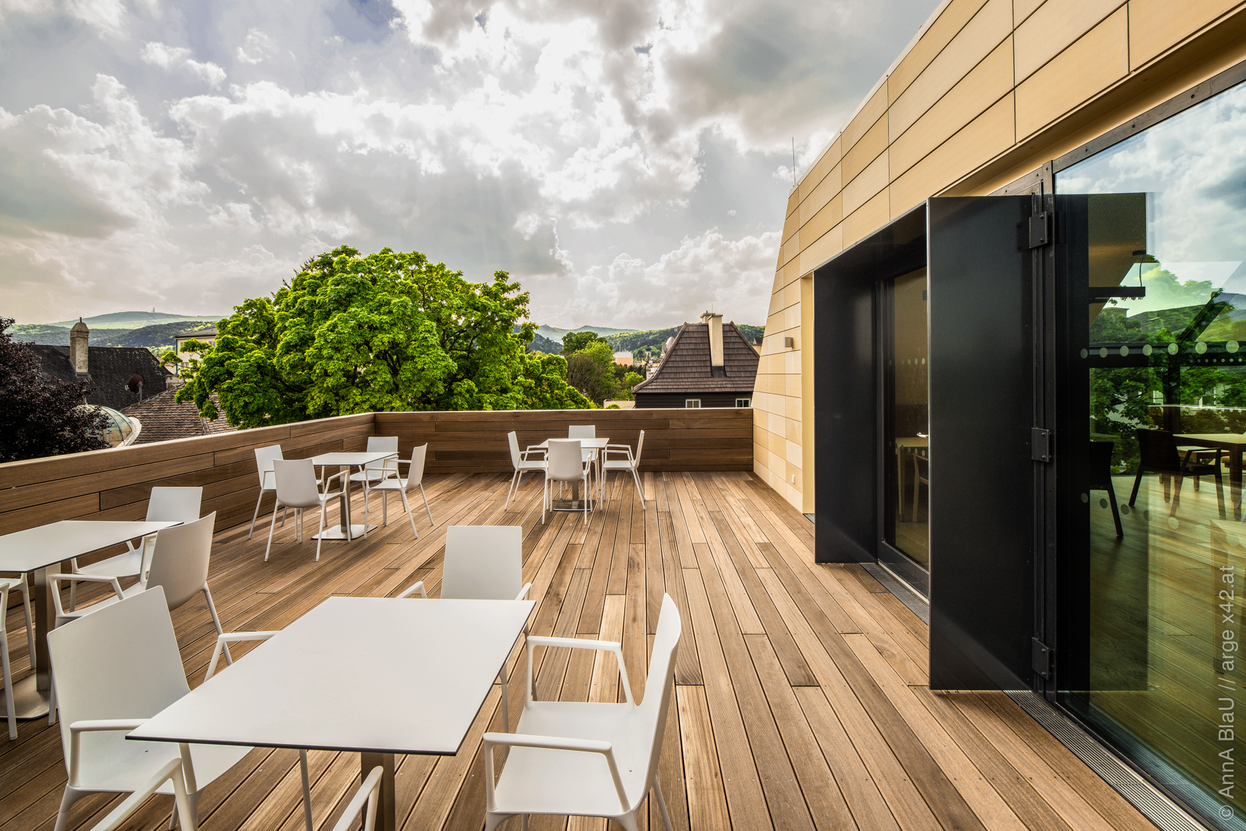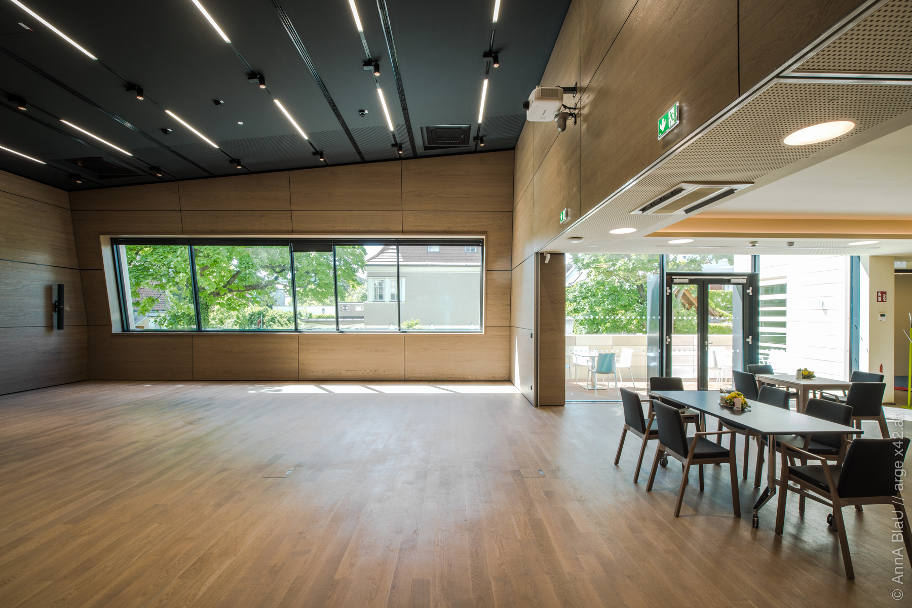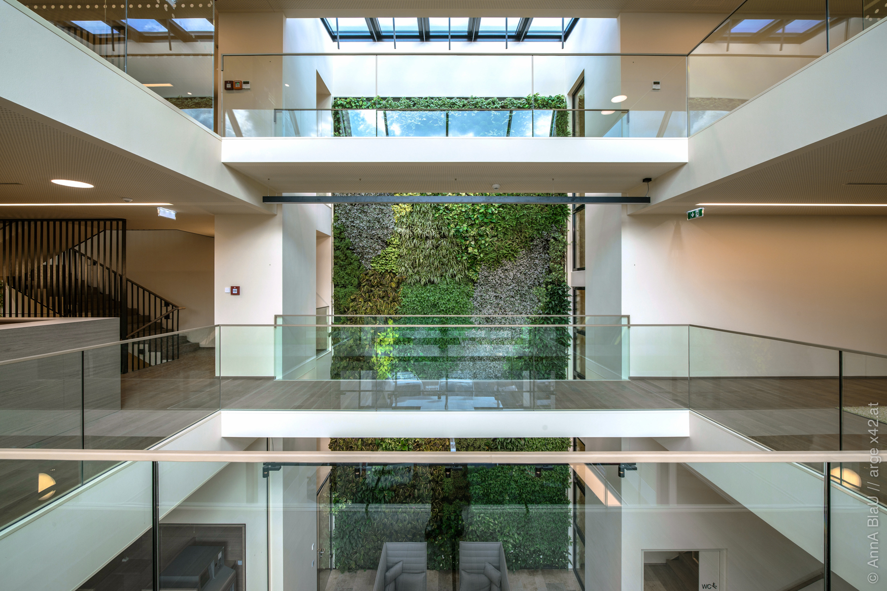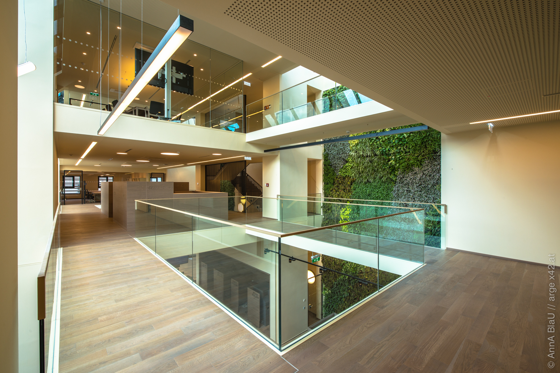 Bei der Auswahl der Materialien wurde auf ein einheitliches Erscheinungsbild und hochwertige Oberflächen Wert gelegt, die keinem kurzfristigen Trend folgen. Die Farbe der Keramikfassade findet sich im Inneren an den Wänden und Decken wieder. Höher beanspruchte Wandflächen und der Fußboden im Bereich der Allgemeinflächen sind aus geölter Eiche gefertigt. Der Boden des Forums im Erdgeschoss ist mit Donau-Kalkstein ausgelegt. Ein über Fernwärme angespeistes Fußbodenheizsystem und eine großzügige Photovoltaikanlage zur Stromerzeugung sind ergänzend zum nachhaltigen Gesamtkonzept in das Gebäude integriert. (Text: Architekt, redaktionell überarbeitet von Martina Frühwirth)