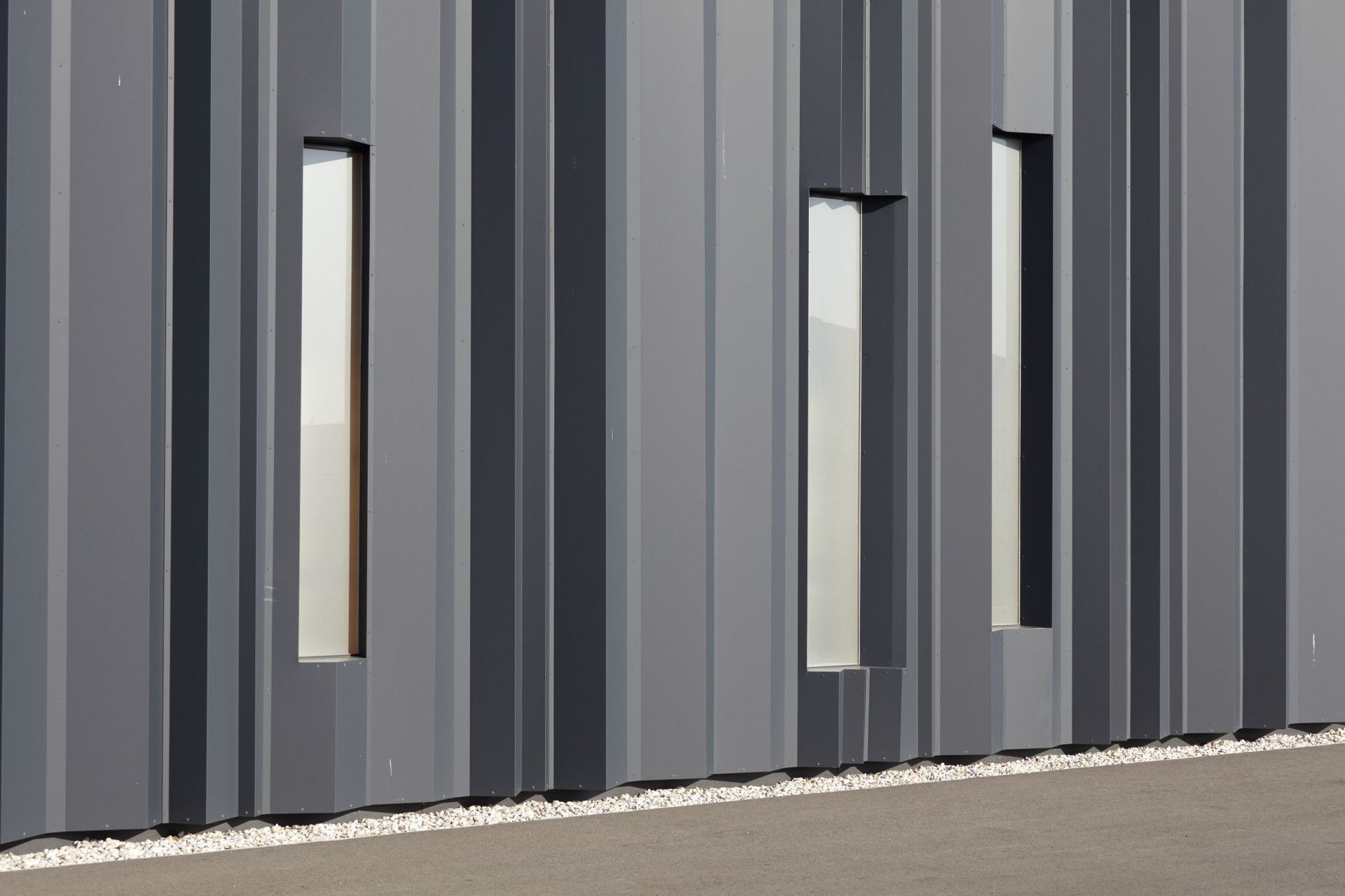 - über die gesamte Kubatur eine unregelmäßig gefaltete kompakte Hülle aus beschichteten Blechpaneelen