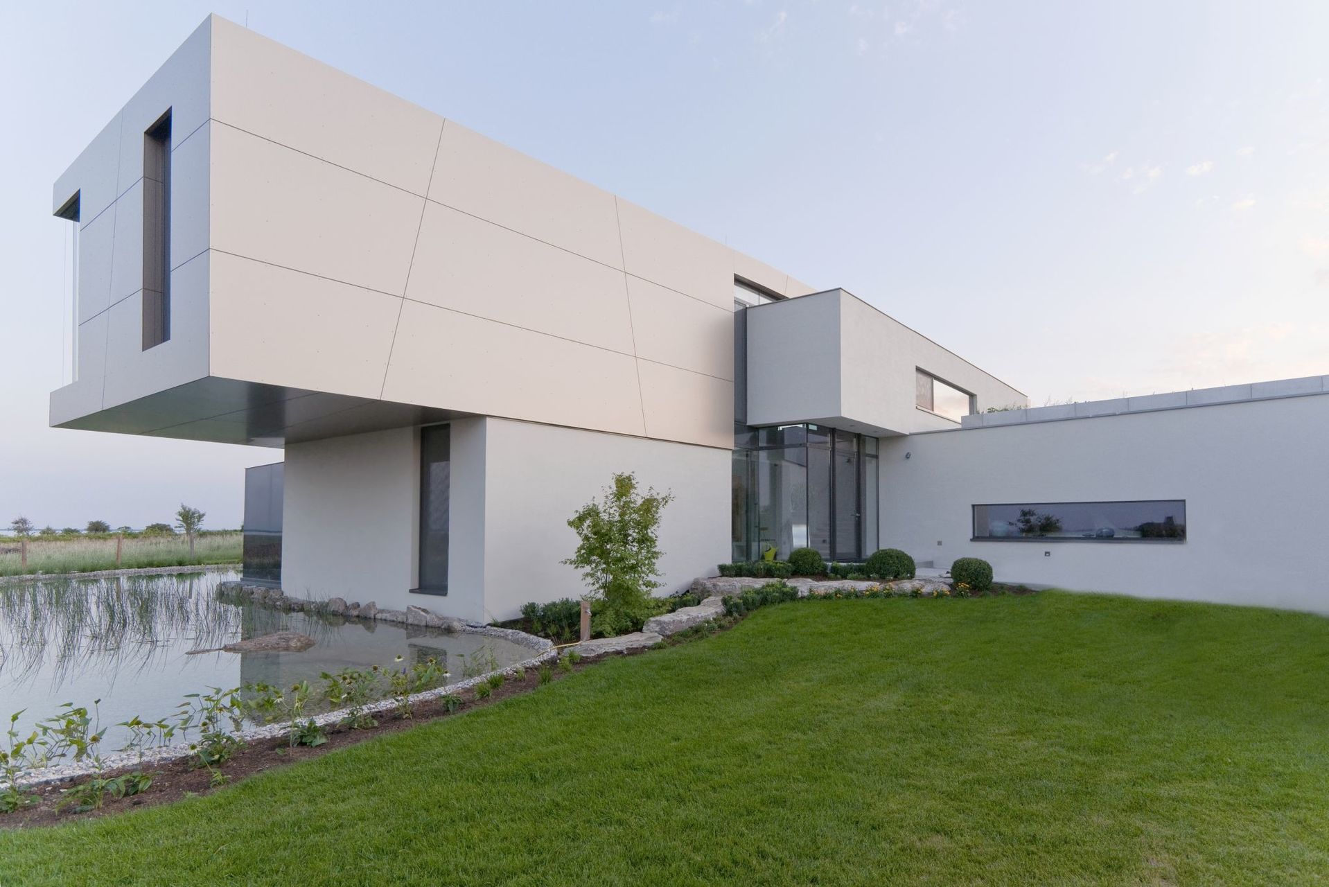 Entlang der zum Neusiedlersee abfallenden Abhänge des Leithagebirges erstreckt sich die Ortschaft Breitenbrunn. Das Siedlungsgebiet mündet nordseitig an die bewaldeten Ausläufer des Leithagebirges, südseitig ist die Landschaft geprägt durch Weingärten und den Schilfgürtel des Sees. Diese besondere naturräumliche Situierung ermöglicht auf dem Grundstück außergewöhnliche Blickbeziehungen, die es galt in das Bebauungskonzept einzubeziehen.Der sich aufdrängenden Vorgabe, die Wohn- und Verweilzonen möglichst ausgewogen zu orientieren, wurde durch einen lang gestreckten, südseitig orientierten, zweigeschossigen Baukörper entsprochen. Die jeweiligen Geschosse sind an die „untere“ und „obere“ Gartenebene direkt angebunden.