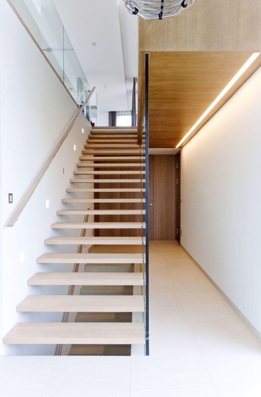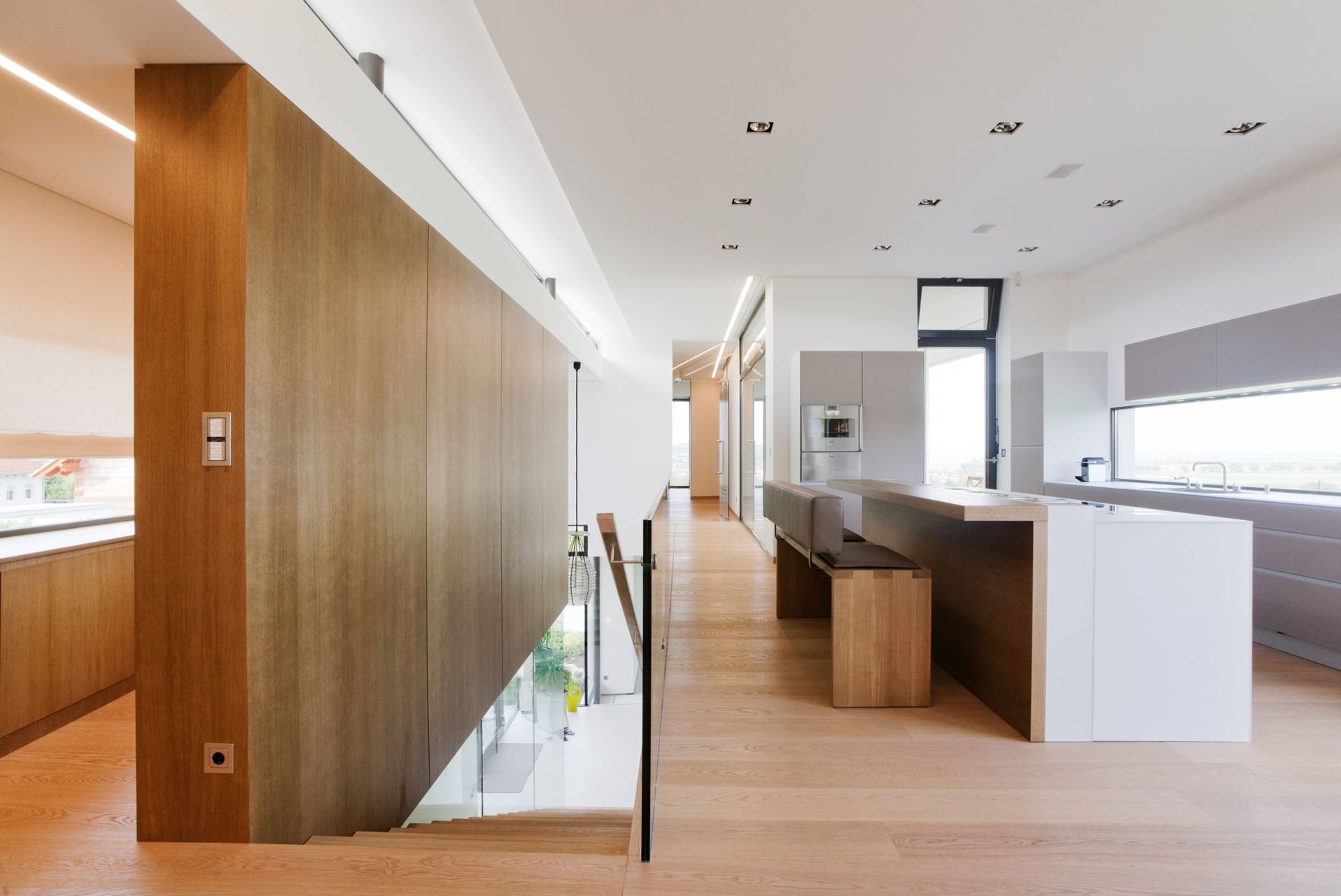 Das eigentliche Wohngeschoss wird von der Gartenebene über eine offene, direkt in den Wohnraum mündende Stiege erreicht.