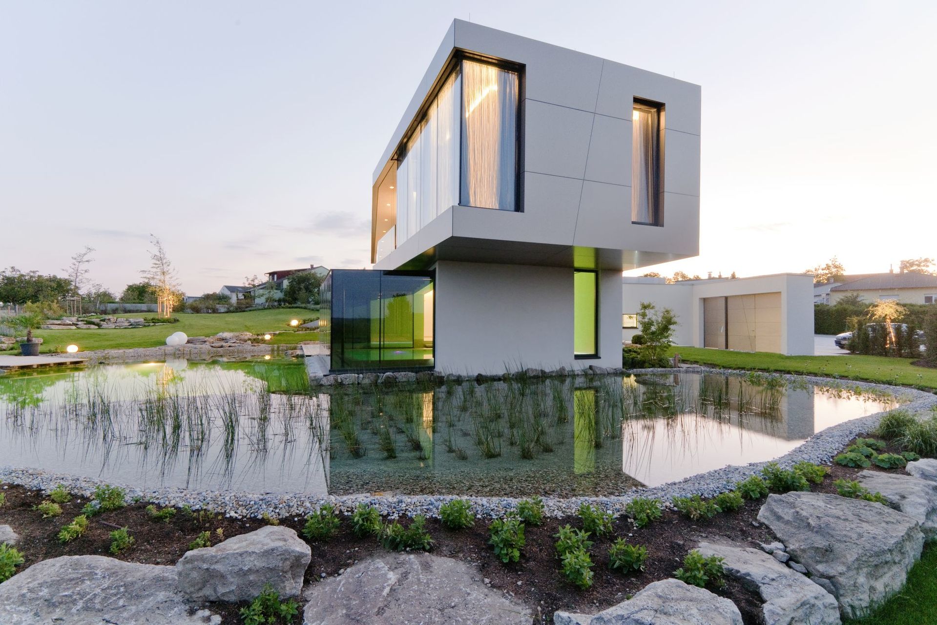 Der schwebende Charakter der auf dem Gartengeschoss aufgesetzten Wohnebene, wird durch die bronzefärbige Alucobond-Fassade unterstrichen. (Text: Architekt)