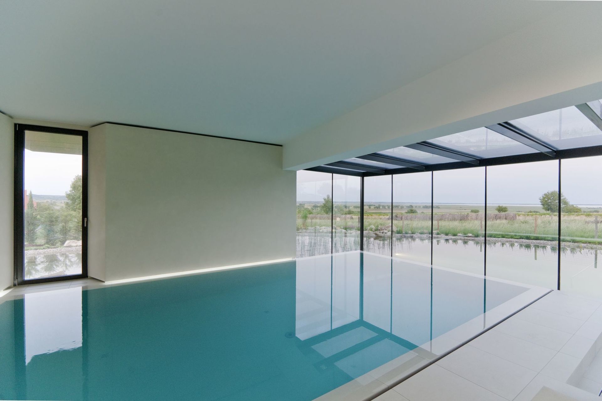 Die tiefer liegende Ebene wird dominiert von einem Hallenbad mit Wellnessbereich. Daran anschließend befinden sich ein Gästezimmer und ein Wirtschaftsraum, sowie der Bootseinstellraum und ein bestehender gewölbter Weinkeller, beide erdüberdeckt.