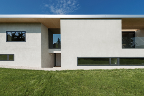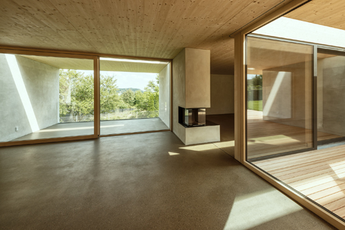 Behutsam fügt sich der Baukörper in die bestehende Siedlungsstruktur und nutzt die gegebene Topographie. Die ortsprägenden Qualitäten von Ausblicken und Freiräumen nach Ost und West begleiten das Konzept. Der Baukörper ist geprägt von Rücksprüngen und Einschnitten, genutzt als geschützte Freibereiche und Zugänge, aber auch von geschlossenen Wandscheiben, welche Geborgenheit für den Innenbereich anbieten und nur mit sparsam gesetzten Öffnungen besondere Ausblicke rahmen. Begleitend in der reduzierten Anmutung bildet ein überstehendes, unverkleidetes Massivholzdachelement den schützenden Abschluss. (Gekürzter Text der Architekten)