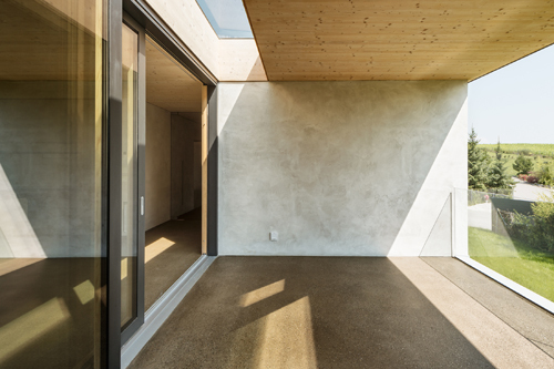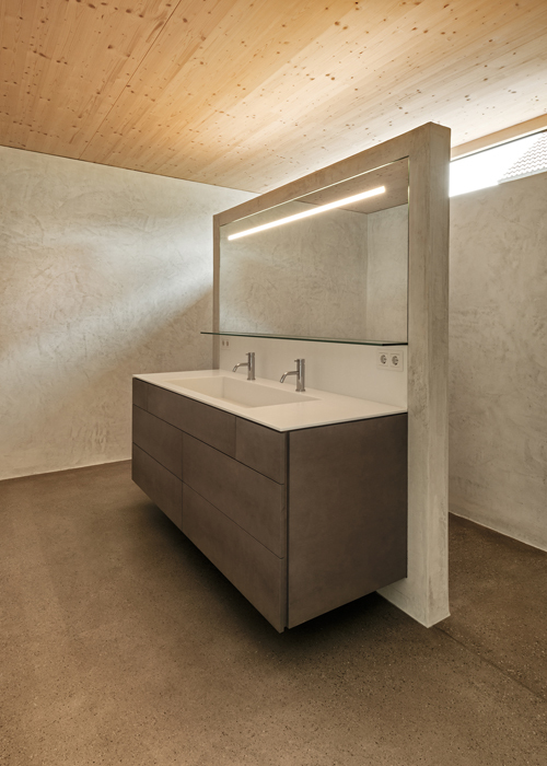 Die unverkleidete Holzdecke und das einschalige Mauerwerke mit Lehmoberfläche, hergestellt aus dem Erdaushub vor Ort und Kalkputz fügten sich aneinander. Die Nassbereiche wurden mit Asche, gelöschtem Kalk und Trass glatt gespachtelt. Die Böden wurden mit geschliffenem Zementestrich ausgeführt, mit Naturölen veredelt und versiegelt. Ein alter Handwerksmeister gab sein Wissen über Kalkglättung weiter, sodass wir selbst beim Bad die Hand bzw. die Kelle anlegten. Der Tod der Bauherrin brachte alles zum Erliegen, vieles wurde in Frage gestellt. Doch schließlich sammelte der Bauherr erneut Kraft und das Haus am Schloßberg, das auch viele persönliche Erinnerungen birgt, konnte im Sommer 2014 bezogen werden.