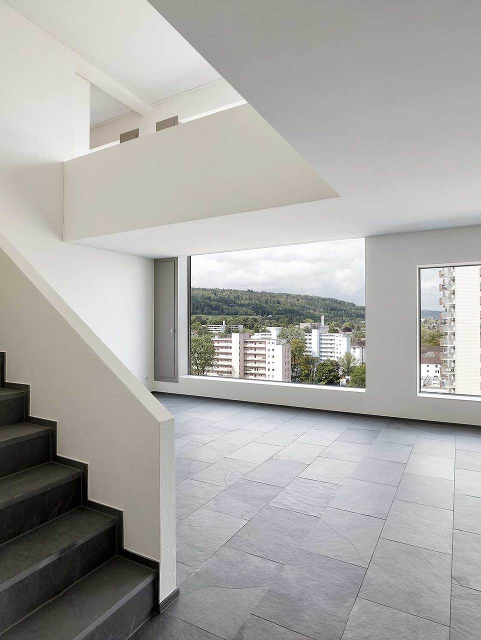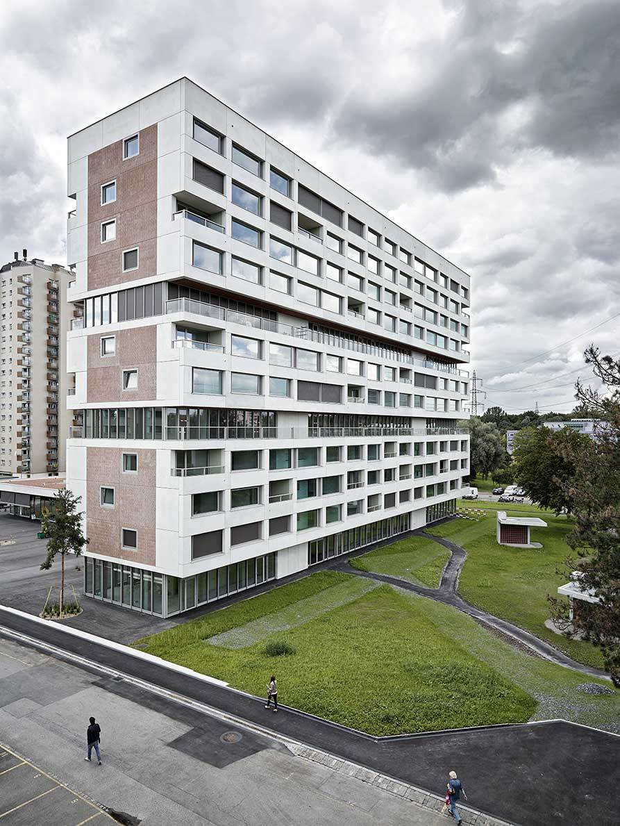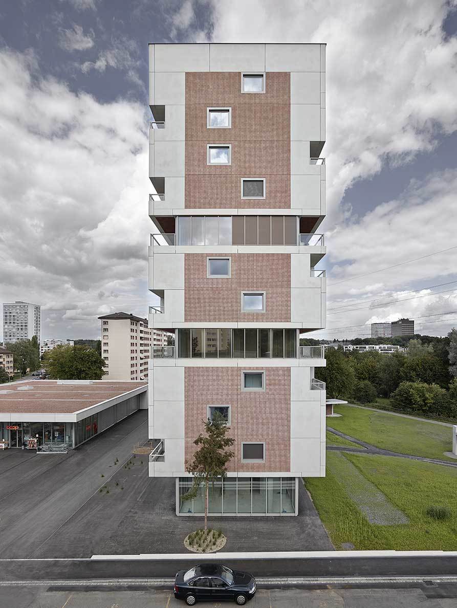 Die 12-Geschossigkeit des Gebäudes wird zum Potential für ein Raumkonzept, das aus dem Schnitt generiert wird: Die angestrebte Wohnungsmischung aus Duplex-Einheiten, die in ihrer Zweigeschossigkeit eine größere strukturelle Bestimmtheit aufweisen, und eingeschossigen Loftwohnungen, die nach struktureller Flexibilität streben, führt zu einem Platten-Scheiben-Tragwerk. Dessen brückenartige Konzeption erfüllt die unterschiedlichen Bedingungen der Geschosse und macht sie außen ablesbar. Die Maisonette-Wohnungen zeichnen sich dabei durch teilweise zweigeschossige Lufträume und ihre über die Gebäudetiefe verspannten Grundrisse aus. In den Loftgeschossen hingegen wird die Idee des freien Grundrisses zelebriert, indem die eingestellten Kerne als trennende Elemente den Raum strukturieren und die durchlaufenden, in das Volumen eingezogenen Balkondecks eine Raumerweiterung in die umgendende Landschaft hinaus erzeugen. (Text: Boltshauser Architekten)