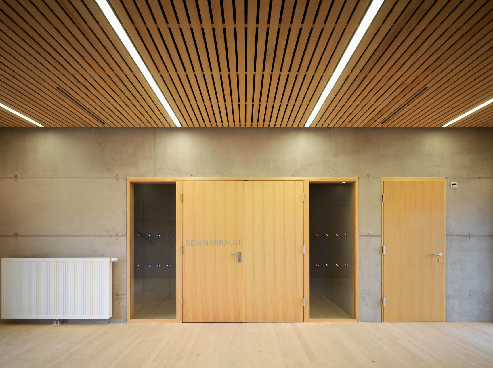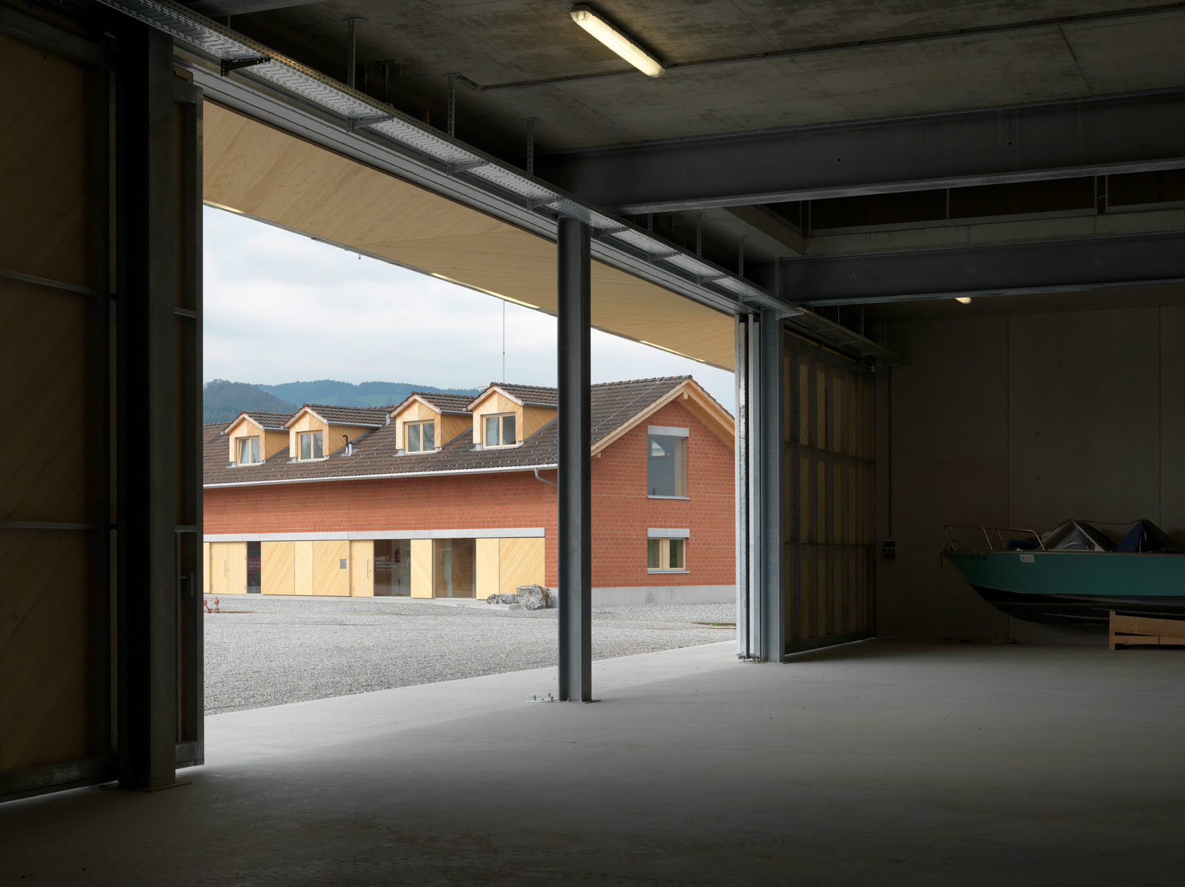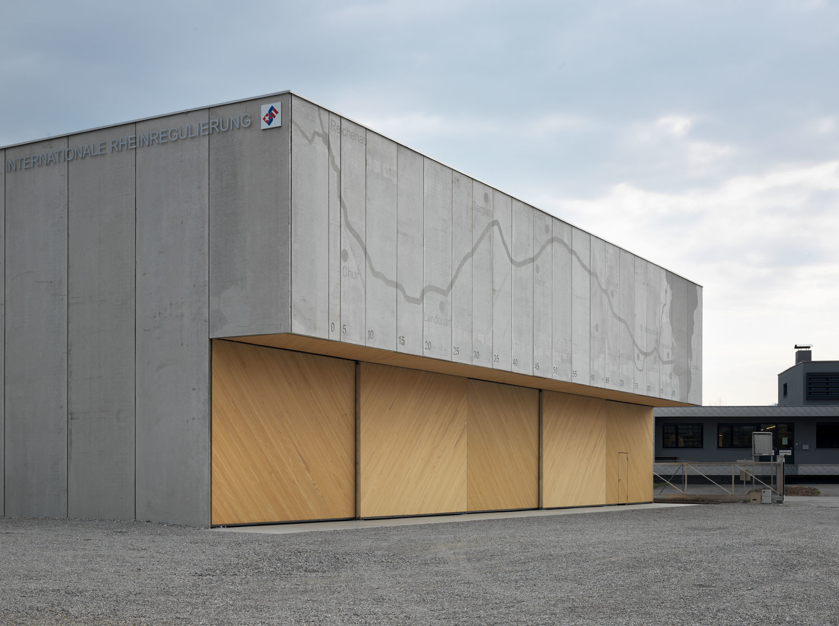 Der freistehende Betonkubus ist reiner Zweckbau, ein großer Schrank. In der Lagerhalle befinden sich derzeit ca. 20.000 gefüllte Sandsäcke, leere Sandsäcke, Sandsackabfüllmaschinen, weitere für einen Notfall erforderliche Materialien, wie Bretter, Absperrungen, Tafeln, Schaufeln, bis zu Schwimmwesten. Es müssen Sattelschlepper zufahren können, es gibt fünf Tore und einen Hallenkran. Die Architektursprache des Gebäudes ist in Proportionen und Material klar definiert. Vertikale Beton-Hohlwandfertigteile, vor Ort vergossen, werden baukastenmäßig aneinandergereiht. Die unterschiedlichen Breiten ergeben sich aus dem Kunst-und-Bau-Projekt. Der in den Zuständigkeitsbereich fallende Rheinverlauf und Bodensee wird in fünf Flusskilometer-Abständen durch die Fugenteilung maßstabsgetreu dargestellt und in die schalglatte Oberfläche mittels Stockgeräten eingraviert. (Text: Martina Pfeifer Steiner)
