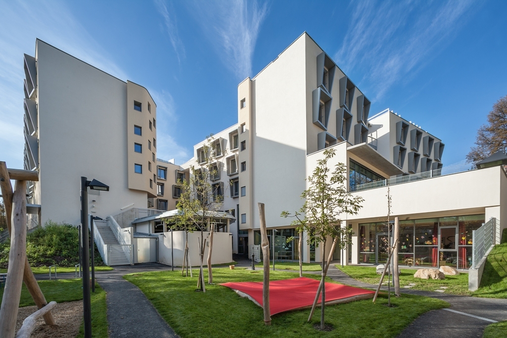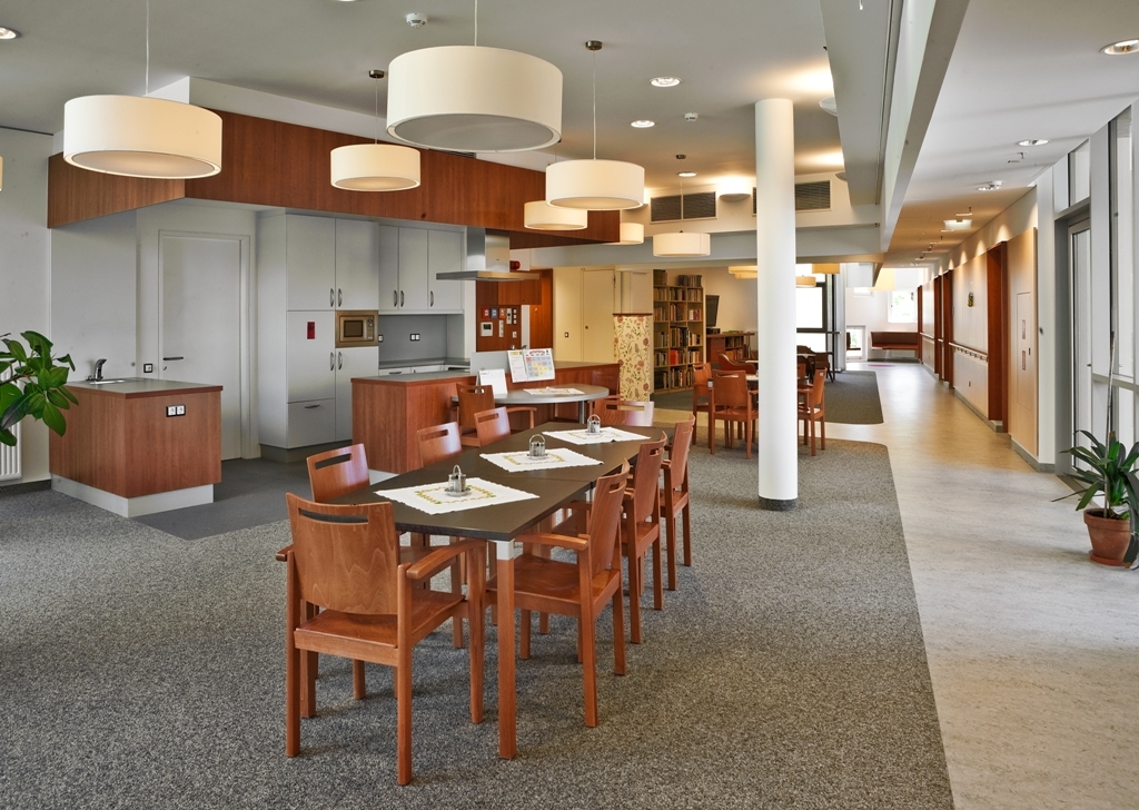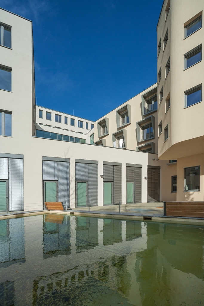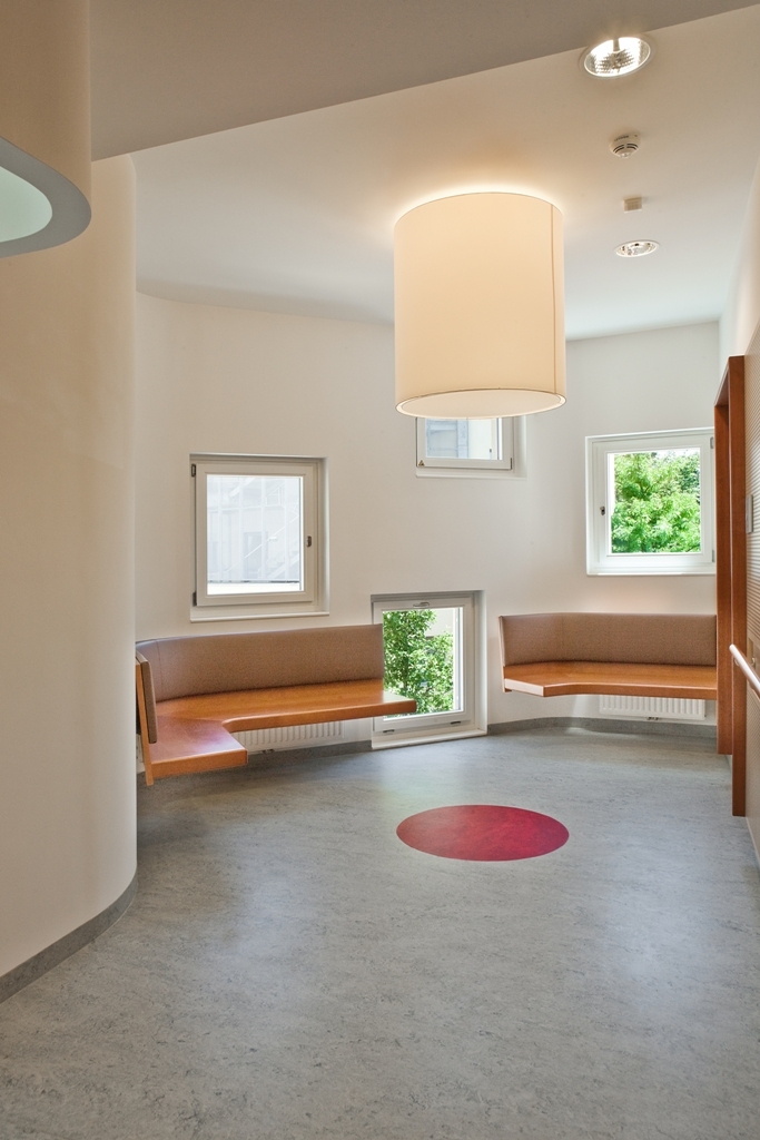 Mietwohnungen, eine Ärztepraxis und ein Kindergarten ergänzen die betreuten Bereiche des Hauses, um hier die soziale Interaktion auf das Niveau des (positiv) Alltäglichen zu bringen. Zusammenleben ist also das Leitmotiv für den Betrieb des Hauses wie für die Architektur, welche den Rahmen definiert. Die Überschaubarkeit der Wohngruppen, die selbsterklärenden Wegfolgen und die Sensibilität im Umgang mit vertrauten Materialien – nicht zuletzt Holz als bewährtes Wohlfühlelement – ließen ein Ambiente entstehen, das den hohen flexiblen Gebrauchswert mit der Optimierung räumlicher Zusammenhänge verbindet. (Text: Architekten)