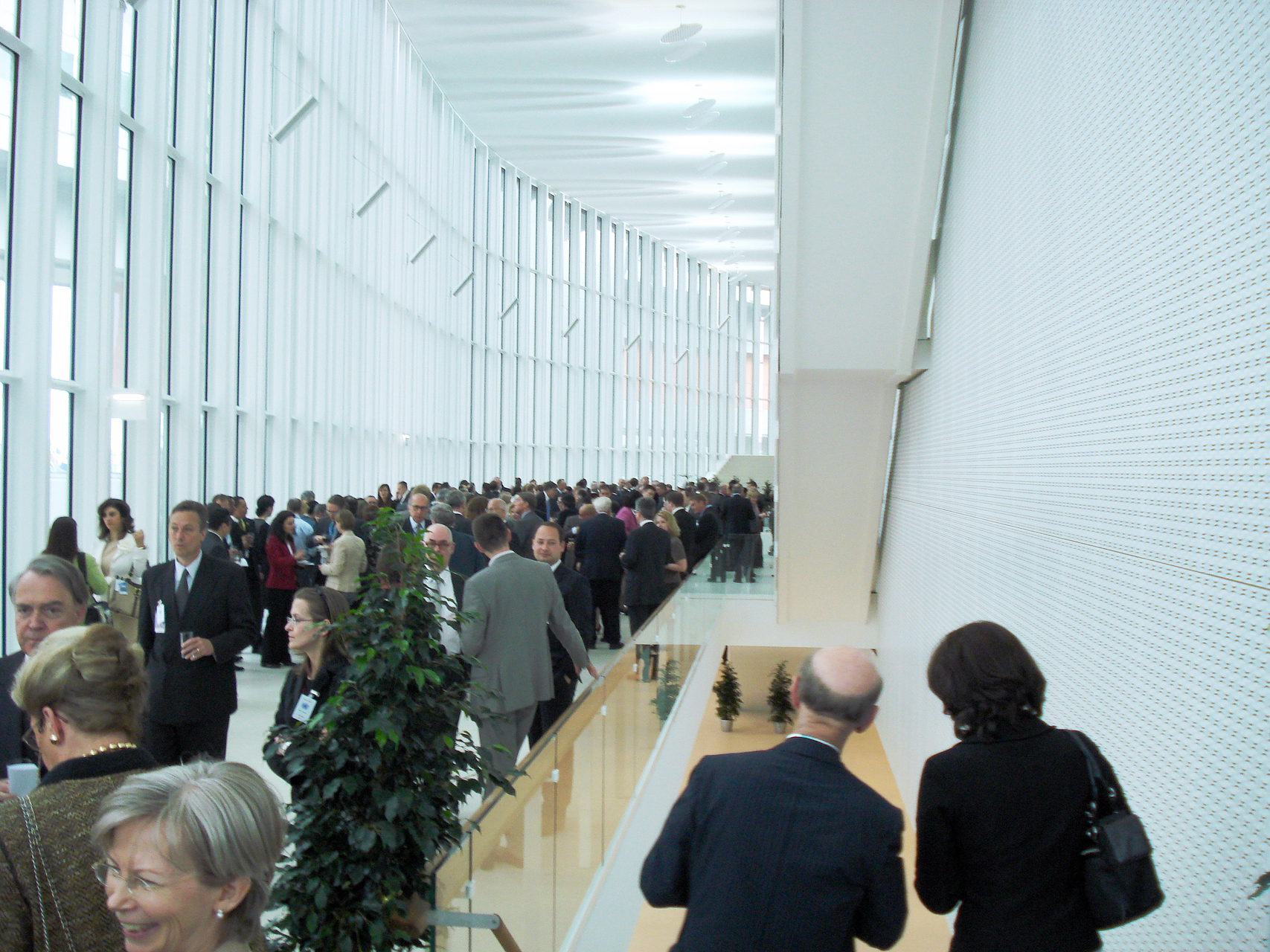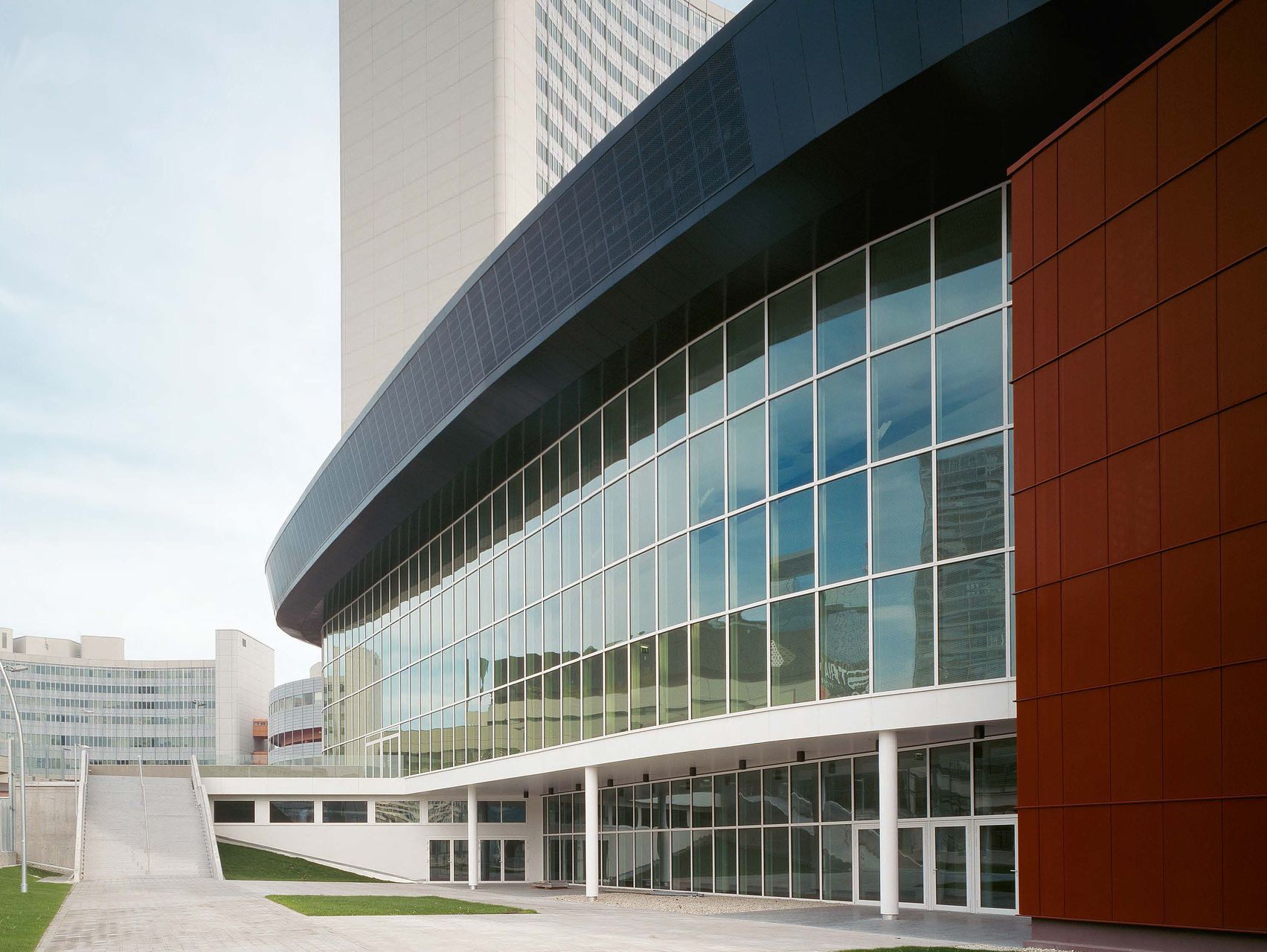 Im Gebäude verdeutlichen Rampen, Stiegen und Foyers sowie lichtdurchlässige Sichtachsen die funktionell erforderlichen Anbindungen an das Herzstück, die Konferenzräume. Die Grundkonzeption wird von der Prämisse des Sichtbarmachens der Bewegungsflüsse bestimmt: Ein kompakter Kern, die klare Trennung des Verwaltungs- und Konferenzbetriebes sowie die Übersichtlichkeit der Foyerzonen garantieren maximale Orientierung und reibungslose Abläufe.
