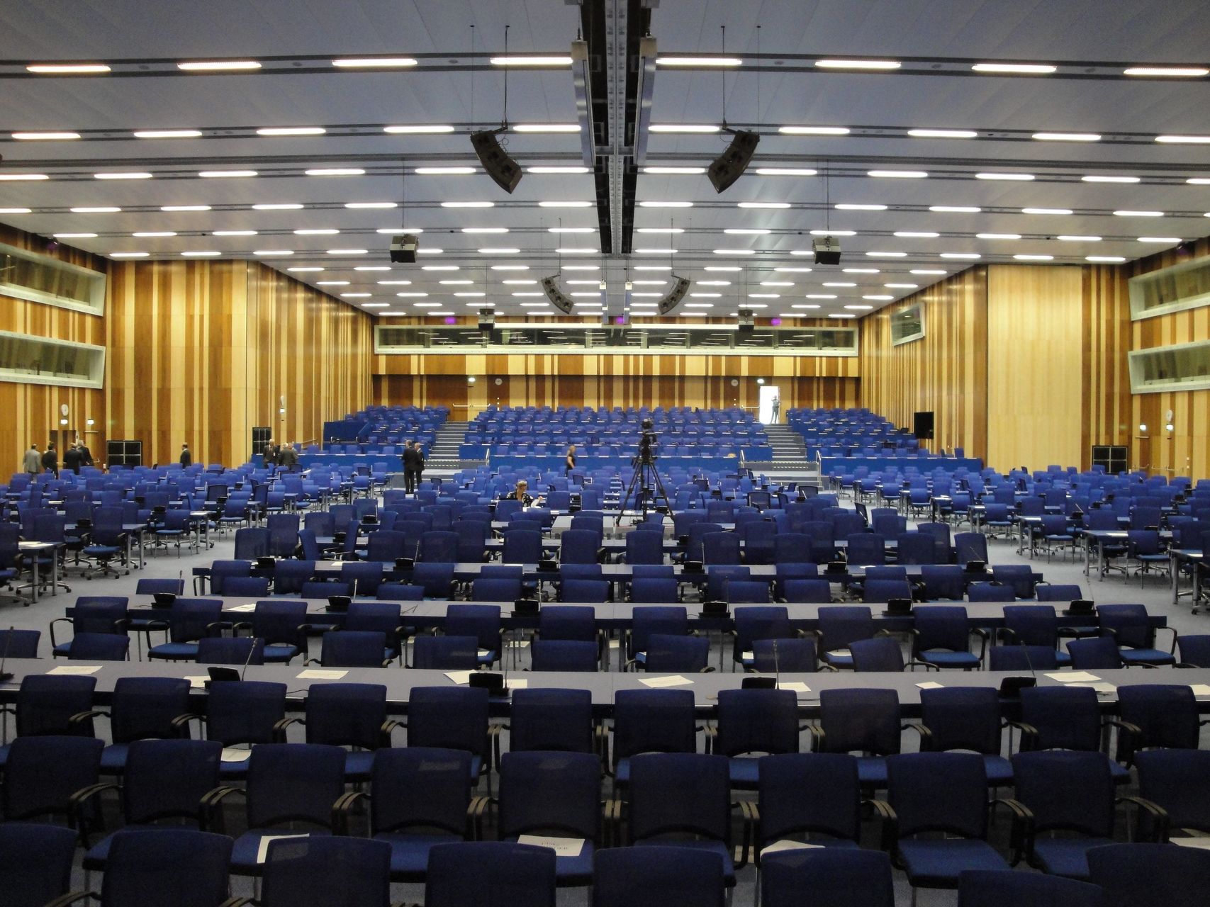 Einen Einblick in den Konferenzalltag vermittelt die Gebäude- und Konferenztechnik. Alleine die technische Ausstattung jedes einzelnen Konferenztisches lässt erahnen, welch hoher technischer Aufwand sich hinter der sichtbaren Architektur verbirgt. Im Sinne eines ökologischen und ökonomischen Einsatzes von Primärenergie wurde auf Niedertemperatursysteme für die Beheizung des Gebäudes sowie im Foyer auf eine Kühlung mittels der Fußboden- und Fassadenflächen gesetzt. Großflächige Glasflächen im Foyer reduzieren die technische Beleuchtung, speziell während der Sommermonate. (Text: Architekt, redaktionell überarbeitet von Martina Frühwirth)