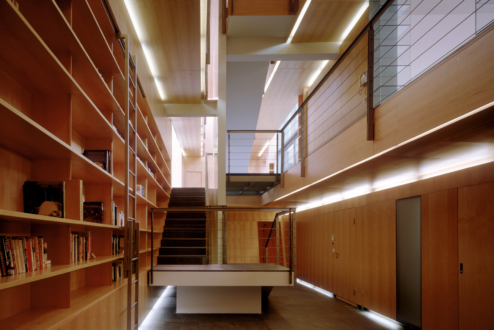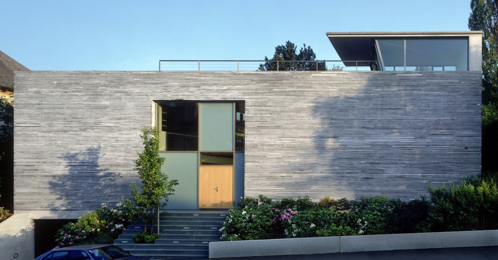 Zwischen Straße und Garten gelegen, introvertiert zur einen und extrovertiert zur anderen Seite, wurde dieses Haus mit einem aus der Bücherwelt geborgten Leitgedanken gebaut. Bereits die geschlossen konzipierte Vorderfassade aus Natursteinriemen erweckt Aufmerksamkeit und deutet auf einen dahinter steckenden, lesbaren Dialog zwischen Physis und Sophos, Natur und Buch, Geschlossenem und Offenem hin. Gegensätze bestimmen auch den Innenraum: quer zum dreigeschossigen Bibliotheksraum gelegen befinden sich die leichten, mit viel Licht versorgten Wohn- und Schlafräume. Über den in hellem Holz materialisierten Bibliotheksraum kommt man zum dazu kontrastierenden, offenen Gartentrakt in Glas, wodurch die räumliche Transformation pointiert wird. Unter allen Einfamilienhausprojekten der Albert Wimmer ZT GmbH nimmt das Haus M. eine herausragende Stellung ein. (editierter Text des Architekten)