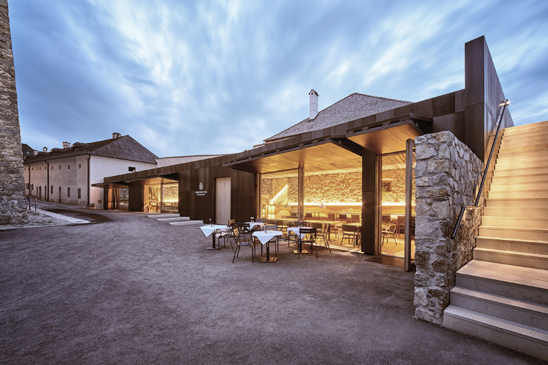 LindnerArchitektur Baden und BWM Architekten Wien gestalteten gemeinsam mit Esterhazy das neue Restaurant mit Gasträumen für 120 Personen auf der Burg Forchtenstein im Burgenland. Die im Kern mittelalterliche Burg Forchtenstein ist seit beinahe 400 Jahren in Esterházy Besitz und in den Sommermonaten ein beliebtes Ausflugsziel. Um den Besuchern dieser majestätisch über der Landschaft thronenden Burg auch eine attraktive Infrastruktur anbieten zu können, wurde mit dem „Grenadier“ im Be- reich der Roten Bastei eine neue Gaststätte errichtet, die sich in die authentische Atmosphäre der Burg dezent einfügt.Das neue Lokal, das zeitgemäße Anforderungen und Funktionen abdeckt, ordnet sich durch den Einsatz authentischer Materialien wie Holz, dunkles Metall und Keramik der einzigartigen Atmosphäre der historischen Umgebung unter, ohne dabei auf seine gestalterische Eigenständigkeit zu verzichten: Es ist ein Lokal, das die Geschichte der Burg in einer heutigen Gestaltungssprache weitererzählt. Die Besucher erleben das Restaurant als Vermittler zwischen alter Patina und moderner Anwendung.