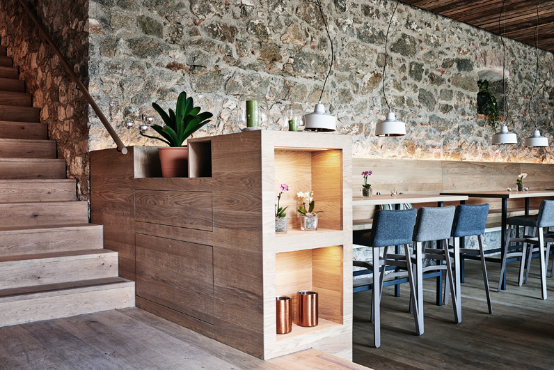 Historisches Handwerk wird in moderner Interpretation zeitlos angewendet und vermittelt gleichzeitig einen gemütlichen Aufenthalt in der Gaststätte. Im Inneren definieren Holz und die integrierte kräftige steinerne Burgmauer die Atmosphäre der klar strukturierten Räume.