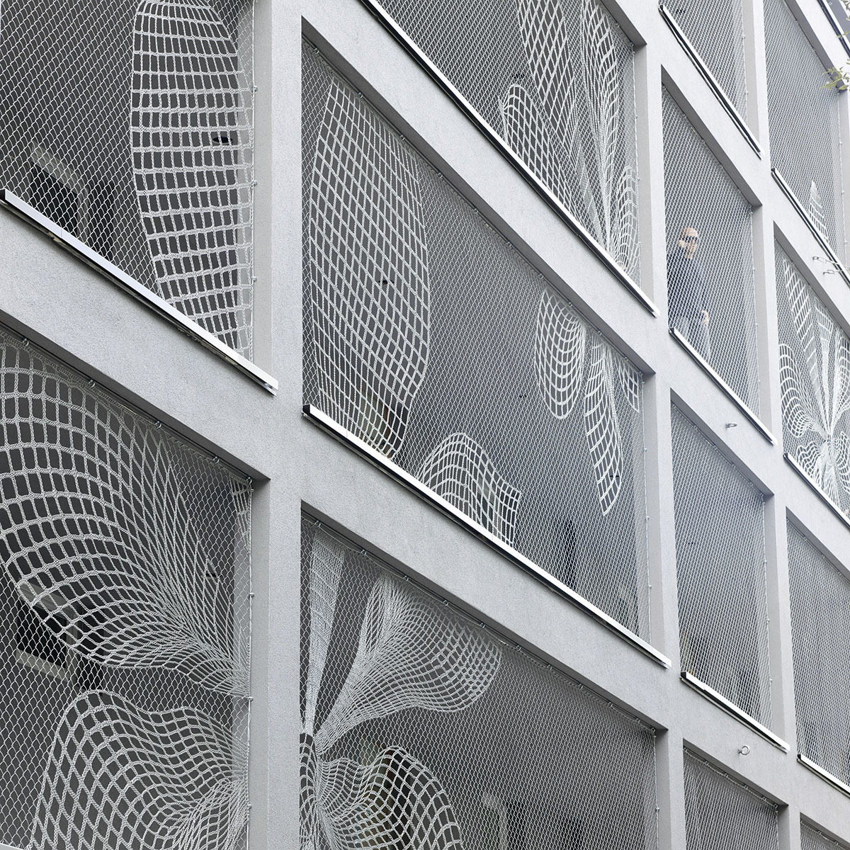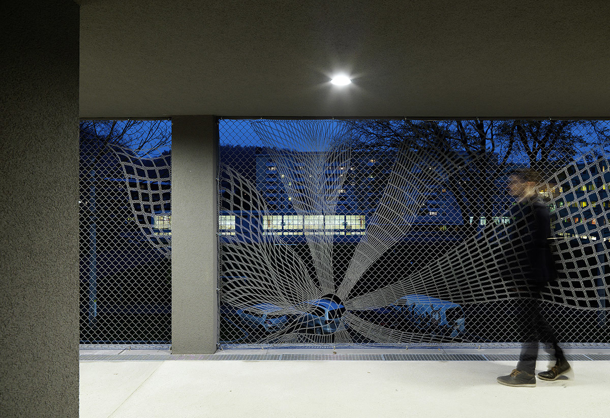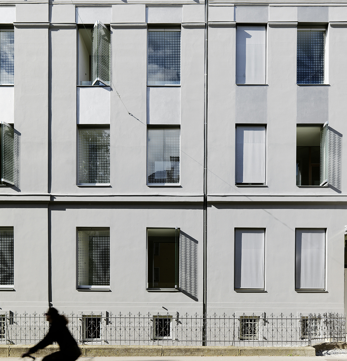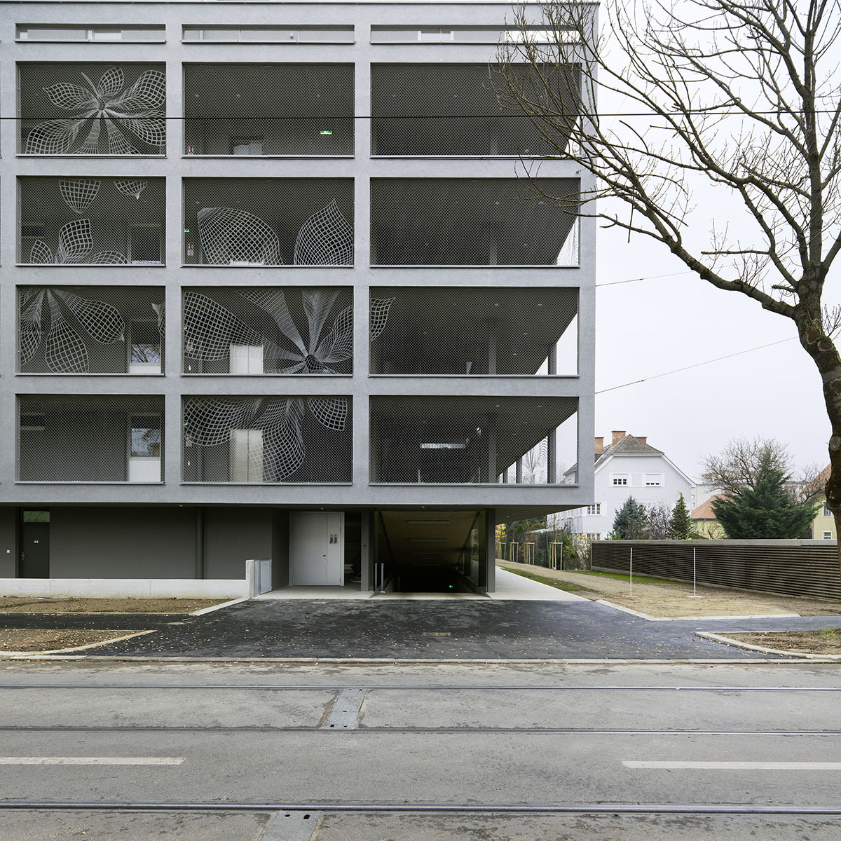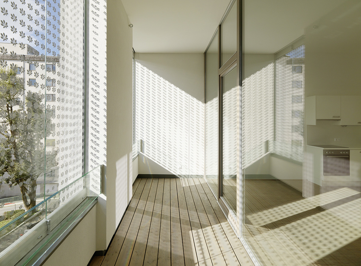 Der straßenseitige Laubengang ist als Kommunikationszone überbreit und bildet an der nordöstlichen Gebäudeecke eine großzügige Zone mit Stiegen, Rampe und Tiefgarageneinfahrt. Die Drahtgitterfassade mit ihren eingeflochtenen Mustern greift den Raster der Fenster und das Bildmotiv der Kastanie auf, das einst das Bestandsgebäude als Stuckrelief zierte und übersetzt dieses in ein großflächiges Muster. Als Sonnenschutz interpretiert dient das Kastanien-Bildmotiv auch auf den Glasfaltläden der in den Bestand eingeschnittenen Loggien, die sich mit den Wohn- und Schlafräumen, zu einer Einheit verbinden.