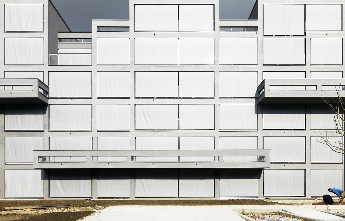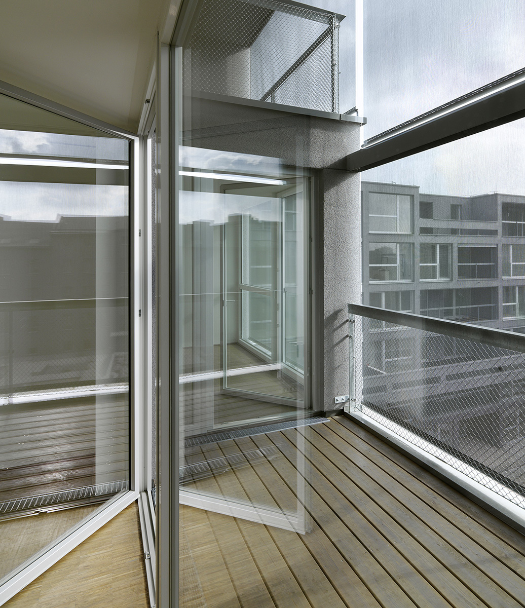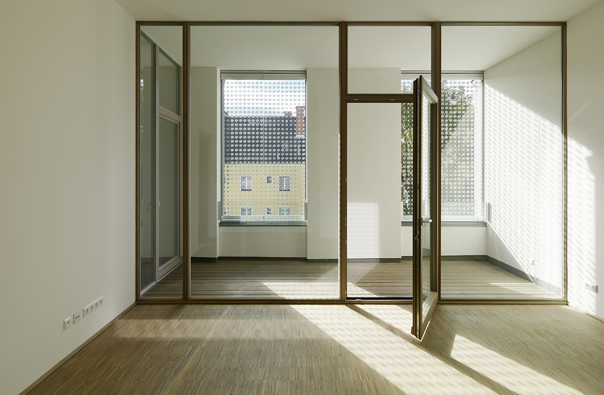 Beinahe vollflächig verglast öffnet sich die Innenhoffassade des Neubaus und verzahnt sich mit den Loggien, Balkonen und den Dachterrassen mit dem Außenraum. Screens lassen die Wohnungen schließen und erzeugen in der Nutzung ein Spiel von offenen und geschlossenen Flächen.