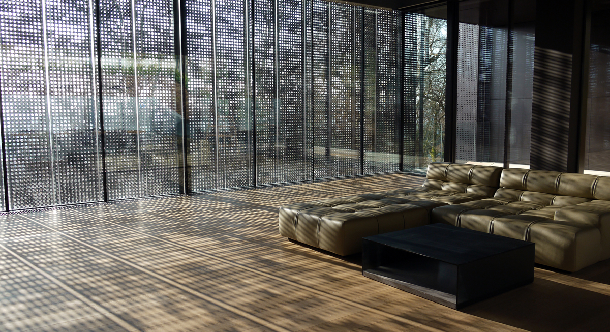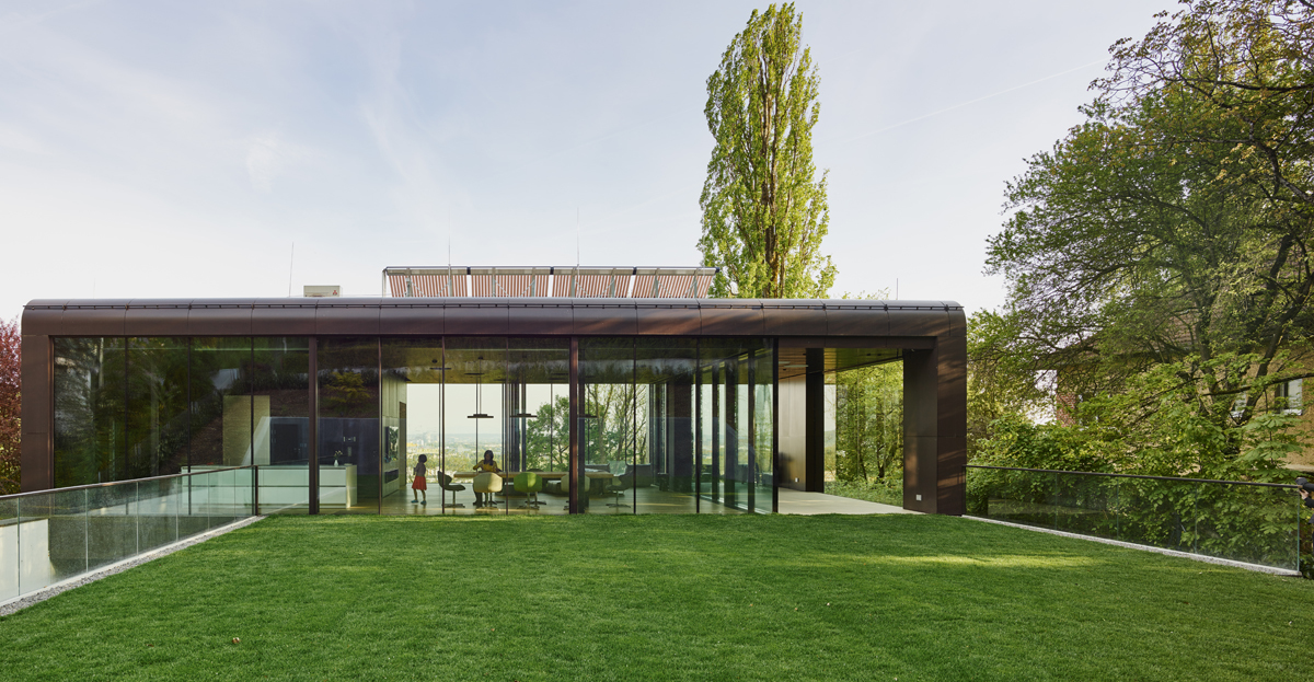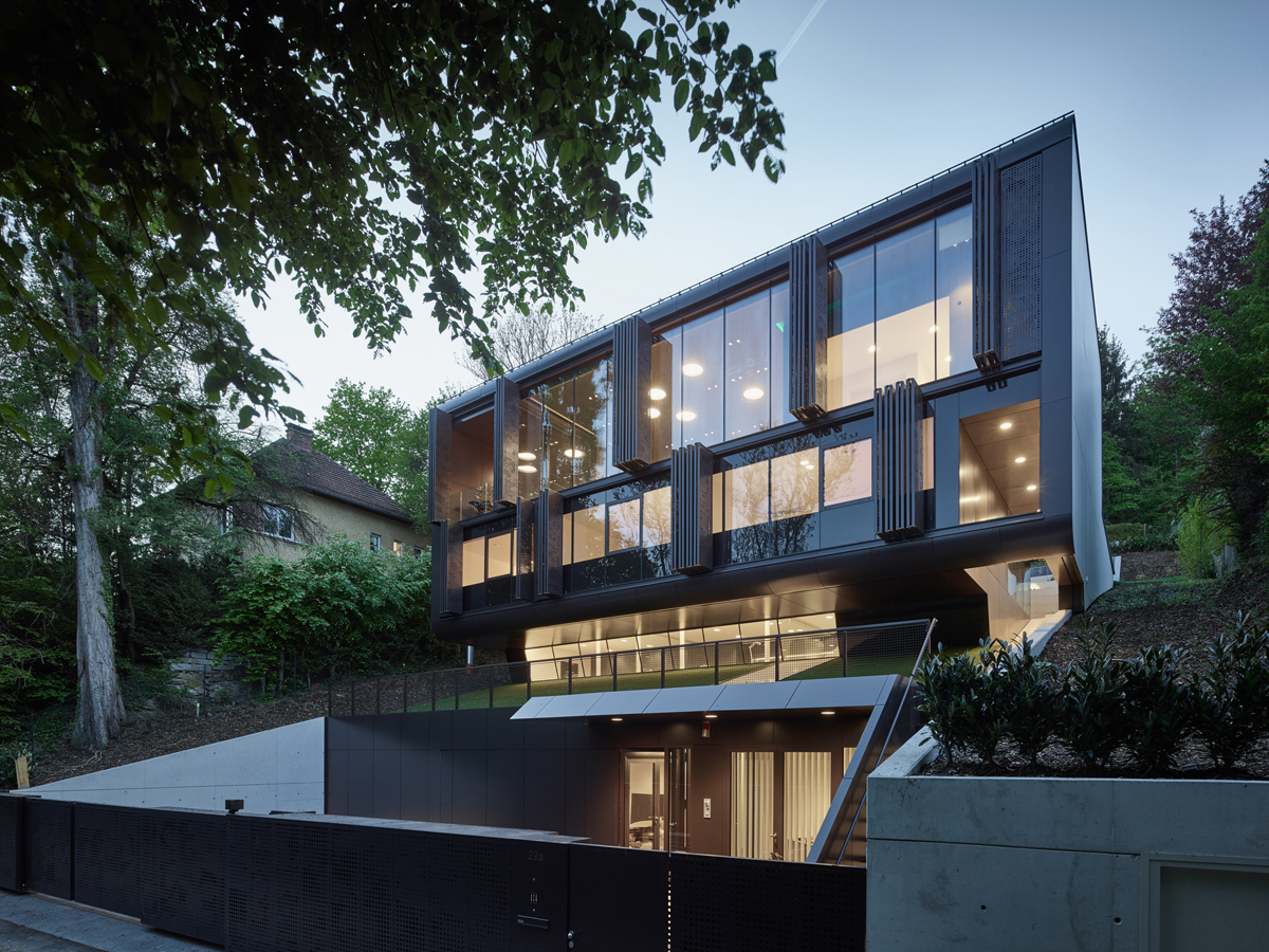 Der Wohnbereich sitzt als Glaspavillon auf dem Gebäude und öffnet sich zum Garten hin. Die südseitige Exponiertheit hoch über der Straße kann durch eine vorgelagerte Filterschicht reguliert werden. Dieser Vorhang aus perforierten Faltelementen überzieht die gesamte Südfassade. Die Bedürfnisse der Bewohnerinnen bestimmen den Grad der Offen- oder Geschlossenheit des Hauses und sorgen damit für eine lebendige Fassade. Neben der Regulierung der Privatheit dienen die Faltelemente als Sonnenschutz gegen sommerliche Überhitzung.