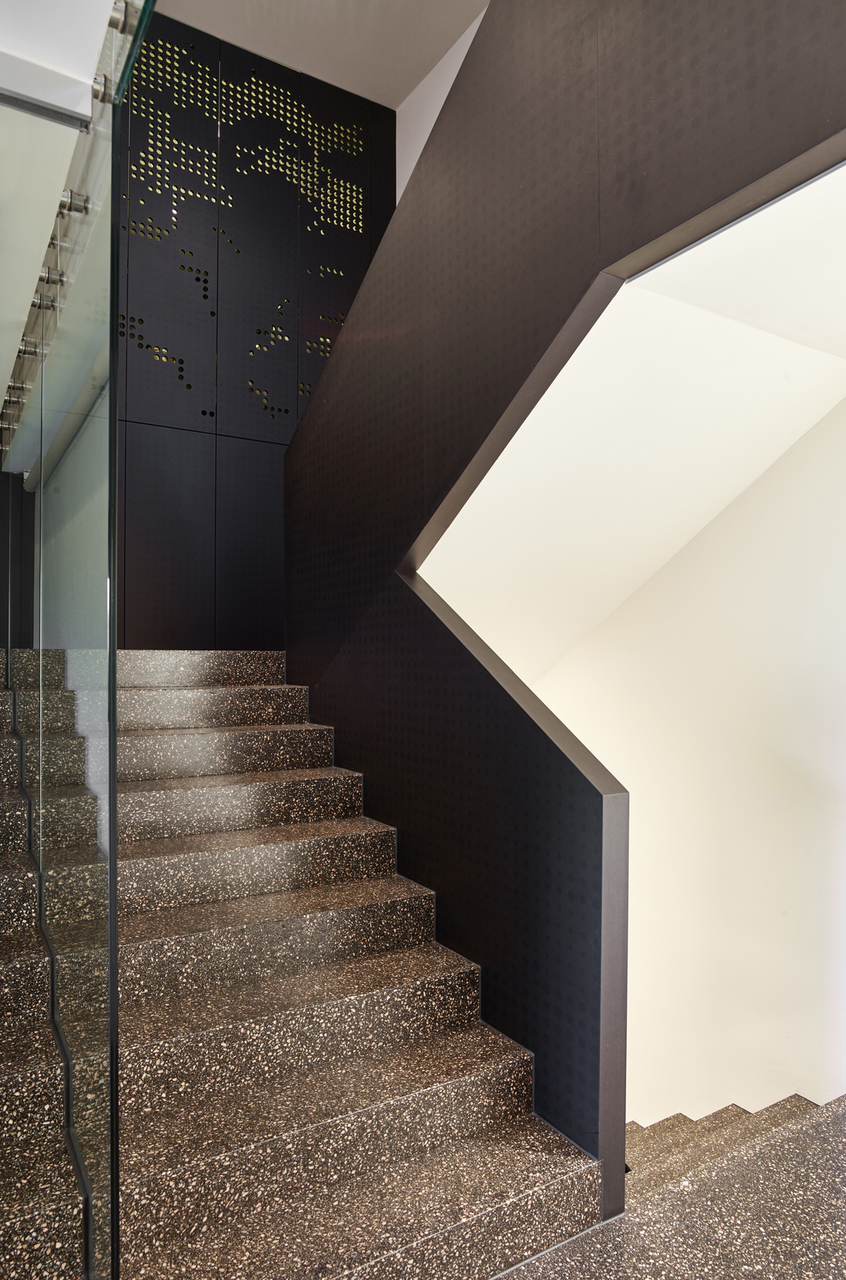 Die Schlafräumlichkeiten liegen unter dem Wohnbereich und haben über eine art Innenatrium direkten Bezug und Aufgang zum Garten. Der Eingang von der Pferdebahnpromenade führt in eine lichtdurchflutete Eingangshalle mit Lift- oder Stiegenverbindung in die darüberliegenden Ebenen. In einem Zwischengeschoß sind Wirtschafts- und Arbeitsraum situiert. Die Belichtung erfolgt über ein Fensterband unter den auskragenden Wohngeschoßen.