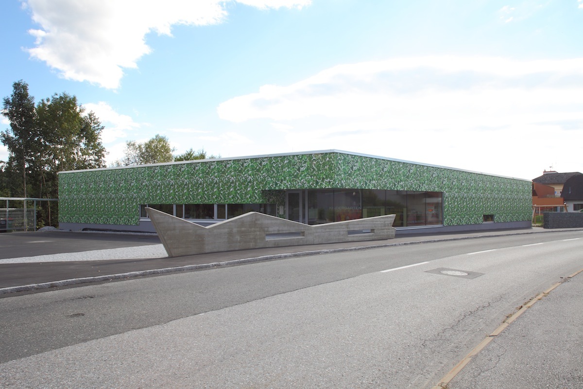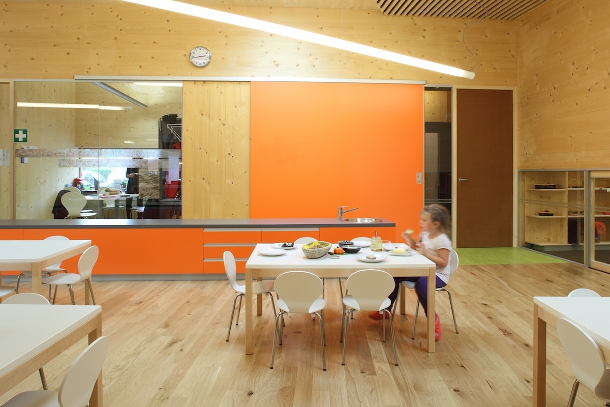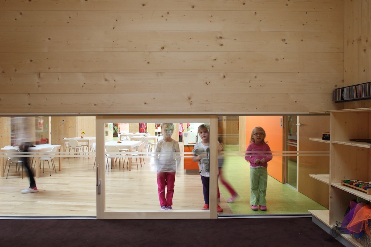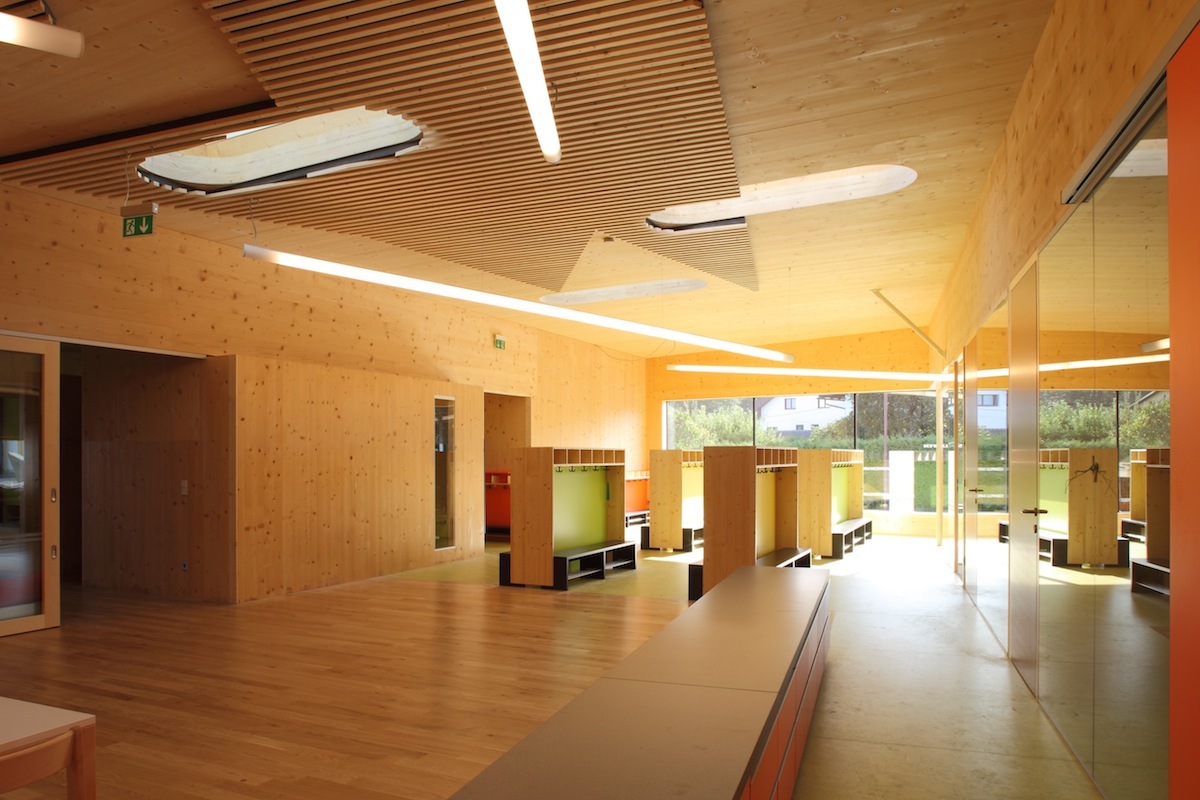 Drei Gruppen von Kindergartenkindern und eine Gruppe der Kinderkrippe sind unter einem gemeinsamen Dach vereint. Das angestrebte pädagogische Konzept von Offenheit und Förderung von Selbstständigkeit wurde vom Architekten ebenso sorgfältig wie vielfältig in ein Bauwerk übertragen. Große Schiebetüren zwischen den Gruppen sollen Pädagogen wie Kinder dazu animieren, Gruppenräume abwechseld zu benützen. Die große, gedeckte Terrasse, die den linear angeordneten Gruppenräumen vorgeschaltet ist, wird gemeinsam verwendet. Eine Galerie zum Kriechen, Klettern und Queren von einem Raum zum anderen fördert den Kontakt zwischen den Größeren und den Kleinen. Räumliche Zonierung erfolgt durch Bereiche wie etwa eine Leseinsel oder die Jausentheke im großzügig dimensionierten Eingangsbereich, der mit klarer Gliederung für Multifunktionalität gestaltet wurde. Sie zeigt sich schon beim Betreten des Hauses über den Windfang: Grünes Linoleum kennzeichnet einen Weg, der die Garderobe, den Zugang zum Gruppenraum der Krippe, die baulich etwas separiert liegt und den Ausgang zum Gartenareal einschließt. der auch als zweiter Zugang vom Parkplatz her dient. Gruppenräume, Dienstzimmer und der Jausenbereich, der von den Kindern nach individuellen Bedürfnissen aufgesucht wird, sind mit Holzböden ausgestattet.