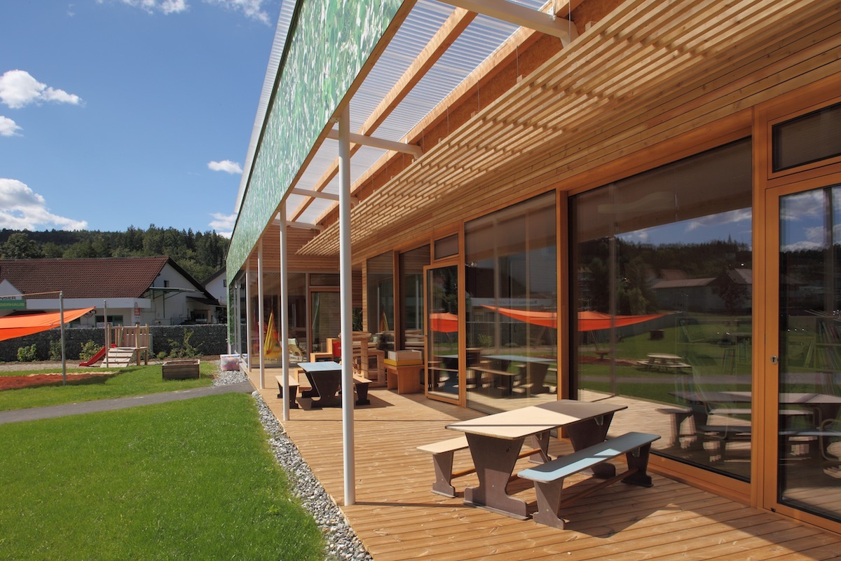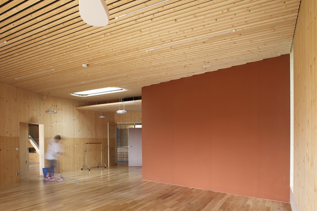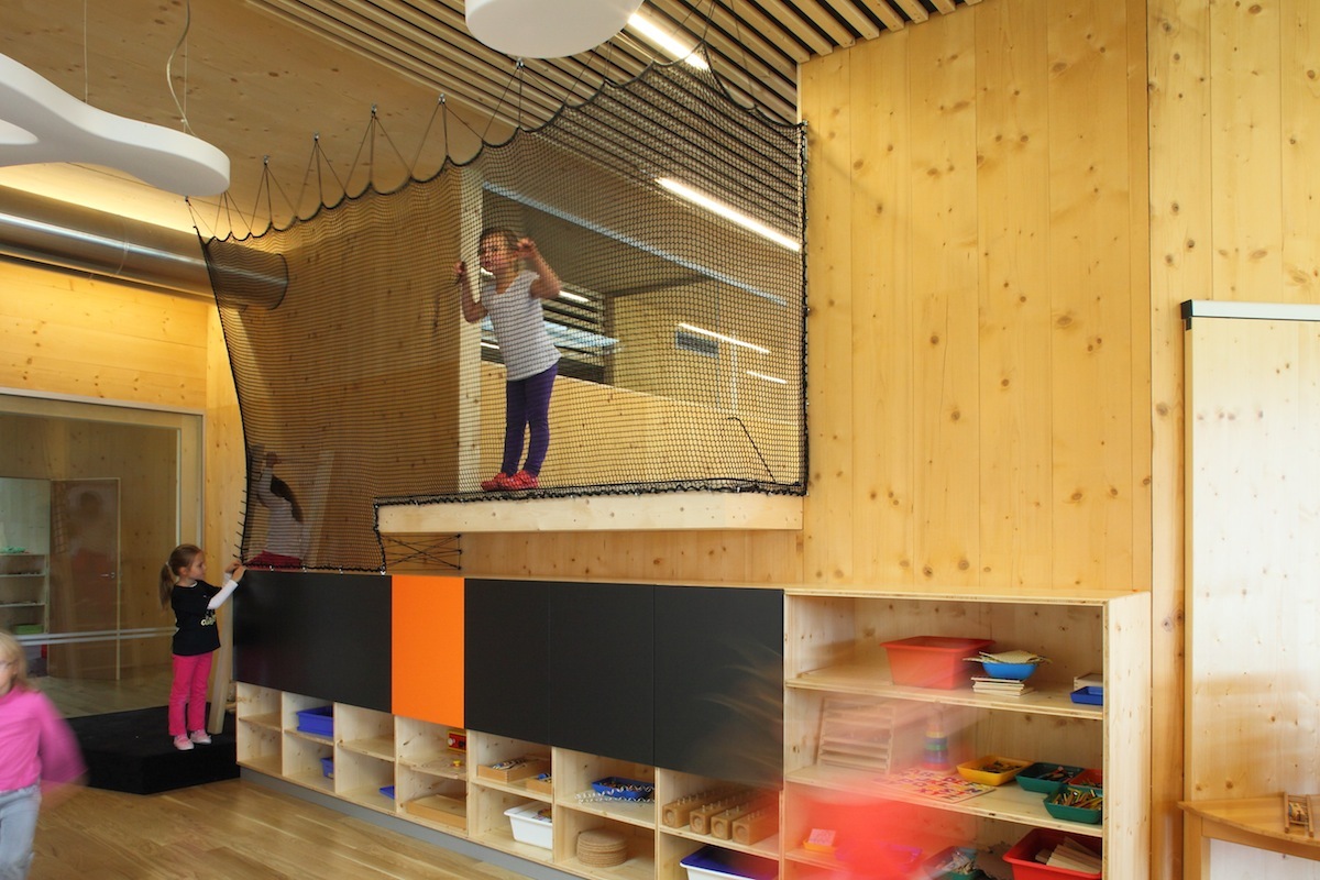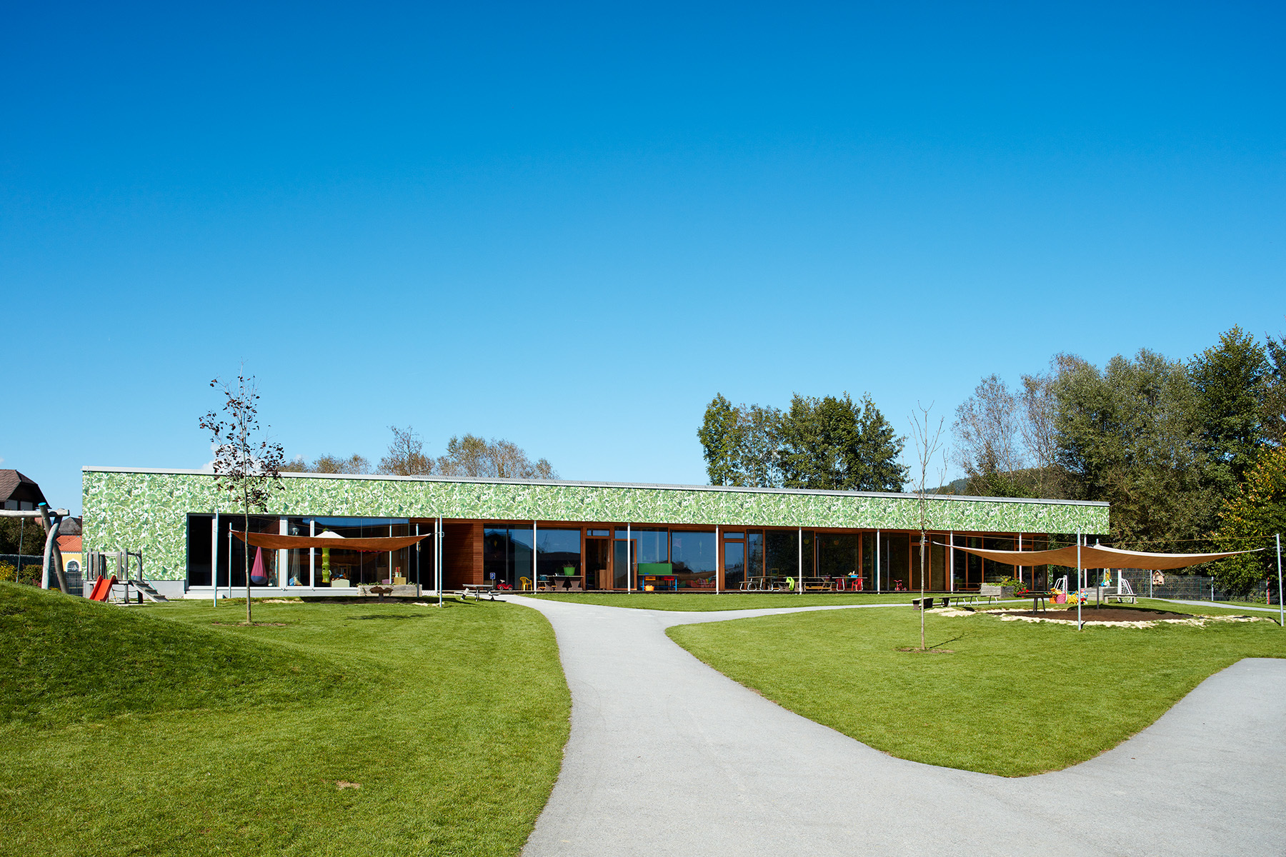 Drei Gruppen von Kindergartenkindern und eine Gruppe der Kinderkrippe sind unter einem gemeinsamen Dach vereint. Das angestrebte pädagogische Konzept von Offenheit und Förderung von Selbstständigkeit wurde vom Architekten ebenso sorgfältig wie vielfältig in ein Bauwerk übertragen. Große Schiebetüren zwischen den Gruppen sollen Pädagogen wie Kinder dazu animieren, Gruppenräume abwechseld zu benützen. Die große, gedeckte Terrasse, die den linear angeordneten Gruppenräumen vorgeschaltet ist, wird gemeinsam verwendet. Eine Galerie zum Kriechen, Klettern und Queren von einem Raum zum anderen fördert den Kontakt zwischen den Größeren und den Kleinen. Räumliche Zonierung erfolgt durch Bereiche wie etwa eine Leseinsel oder die Jausentheke im großzügig dimensionierten Eingangsbereich, der mit klarer Gliederung für Multifunktionalität gestaltet wurde. Sie zeigt sich schon beim Betreten des Hauses über den Windfang: Grünes Linoleum kennzeichnet einen Weg, der die Garderobe, den Zugang zum Gruppenraum der Krippe, die baulich etwas separiert liegt und den Ausgang zum Gartenareal einschließt. der auch als zweiter Zugang vom Parkplatz her dient. Gruppenräume, Dienstzimmer und der Jausenbereich, der von den Kindern nach individuellen Bedürfnissen aufgesucht wird, sind mit Holzböden ausgestattet.