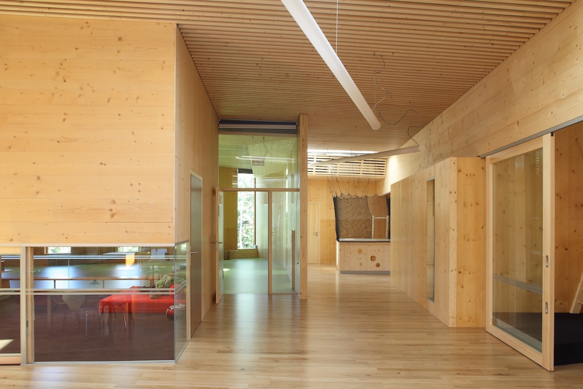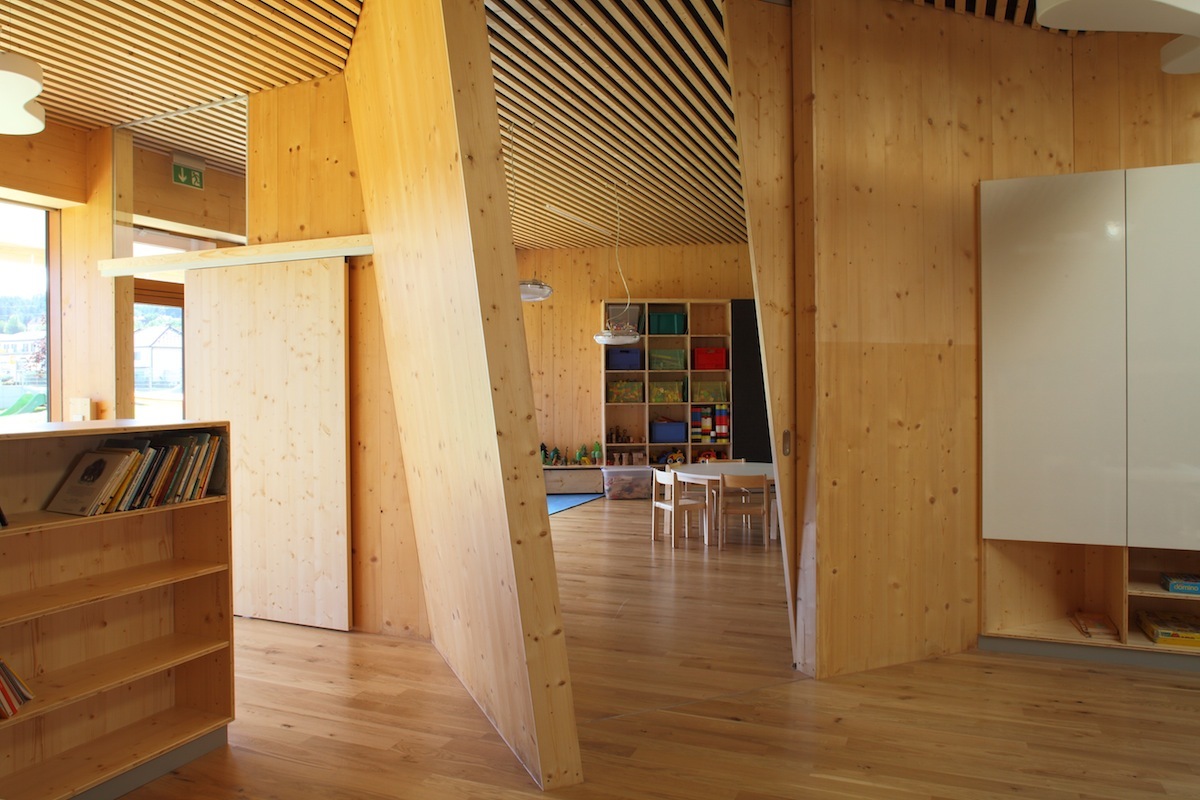 Alle Wände sind aus konstruktiv wirksamen Massivholzplatten (KLH), die mit fertigen Oberflächen auf die Baustelle geliefert wurden. Dass der Rohbau zugleich der Endausbau ist, verleiht dem Gebäude eine Art Werkstattcharakter – die Werkstatt Kindergarten – in der jedoch nichts grob, sondern alles fein und benutzerfreundlich detailliert ist. Wo das Haptische im Vordergrund steht, wurde Holz pur verwendet (Dreischichtplatten) und wurden Oberflächen lackiert. Viele der Möbel und alle Einbauten sind Entwürfe des Architekturbüros - gewollte Einfachheit ist gepaart mit erfrischender Farbigkeit und Mehrfachnutzen, wo Kastentüren auch als Schreibtafeln oder Magnetwände genützt werden können.