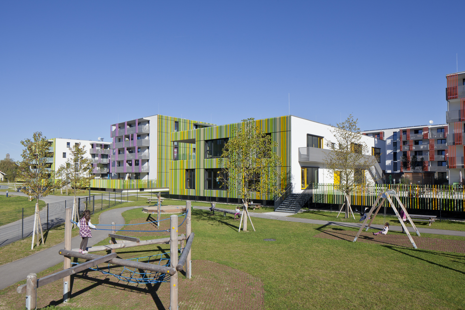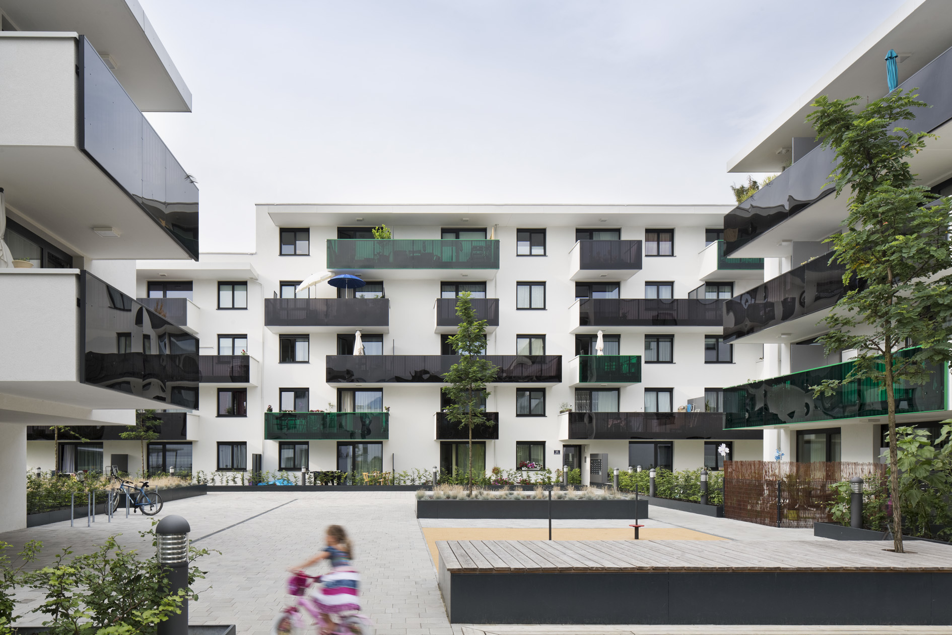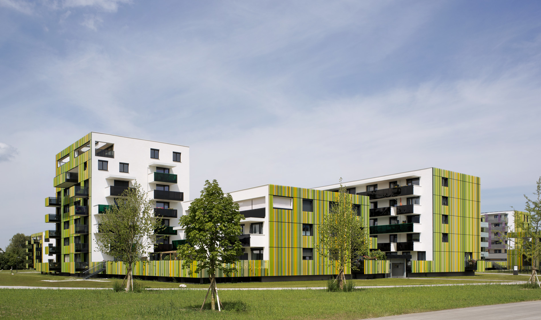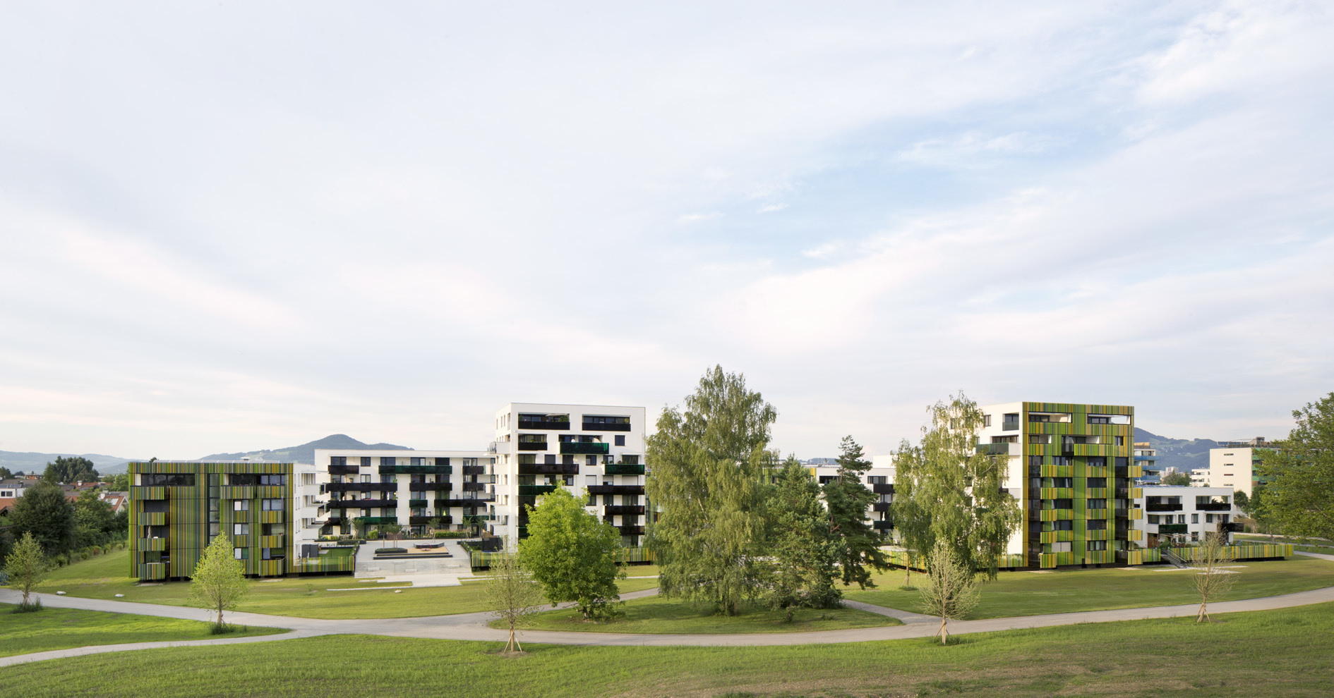 Die Freiräume der Parkanlage gehen von öffentlichen Bereichen zu privaten Gärten, Terrassen und Balkonen über, die den Wohnungen direkt zugeordnet sind. Vertikale Lamellen prägen die außenliegenden Fassaden der gruppierten Wohnanlage. Die Konstruktion aus farbig eloxierten Aluminiumrohren wird dem dunkel foliierten Wärmedämmverbundsystem vorgehängt und teils als absturzsichernde Brüstung weitergeführt. Die Farbgebung der einzelnen Lamellen orientiert sich an der umgebenden Parklandschaft. Im Gegensatz hierzu stehen die hellen Putzflächen der inneren, den Quartiershöfen zugewandten Gebäudefassaden, die durch die horizontalen Balkonkonstruktionen aus Stahlbeton mit farbigen Brüstungselementen gegliedert werden.