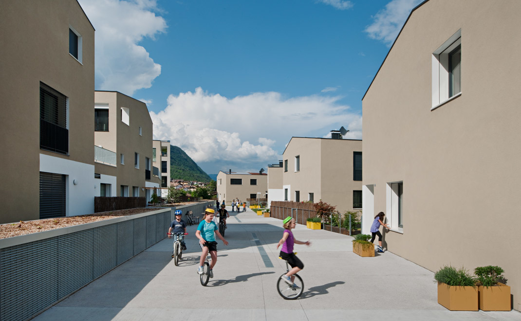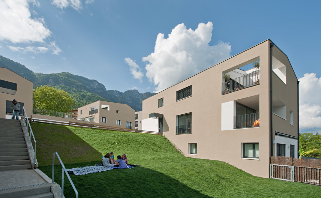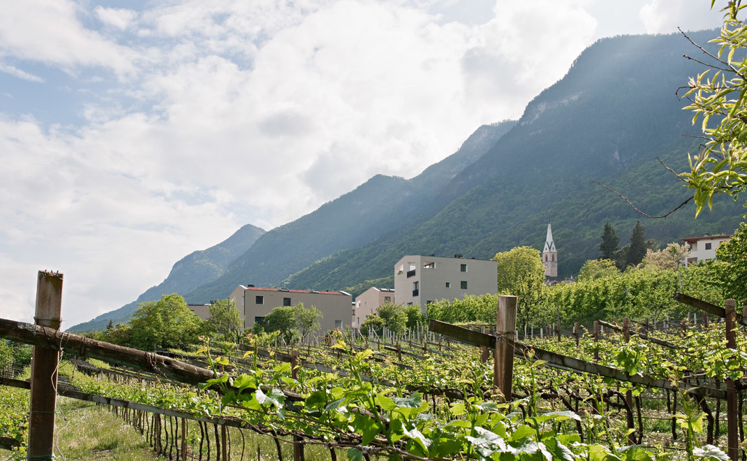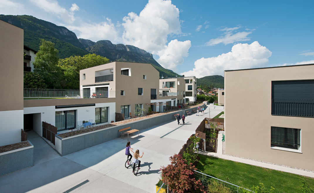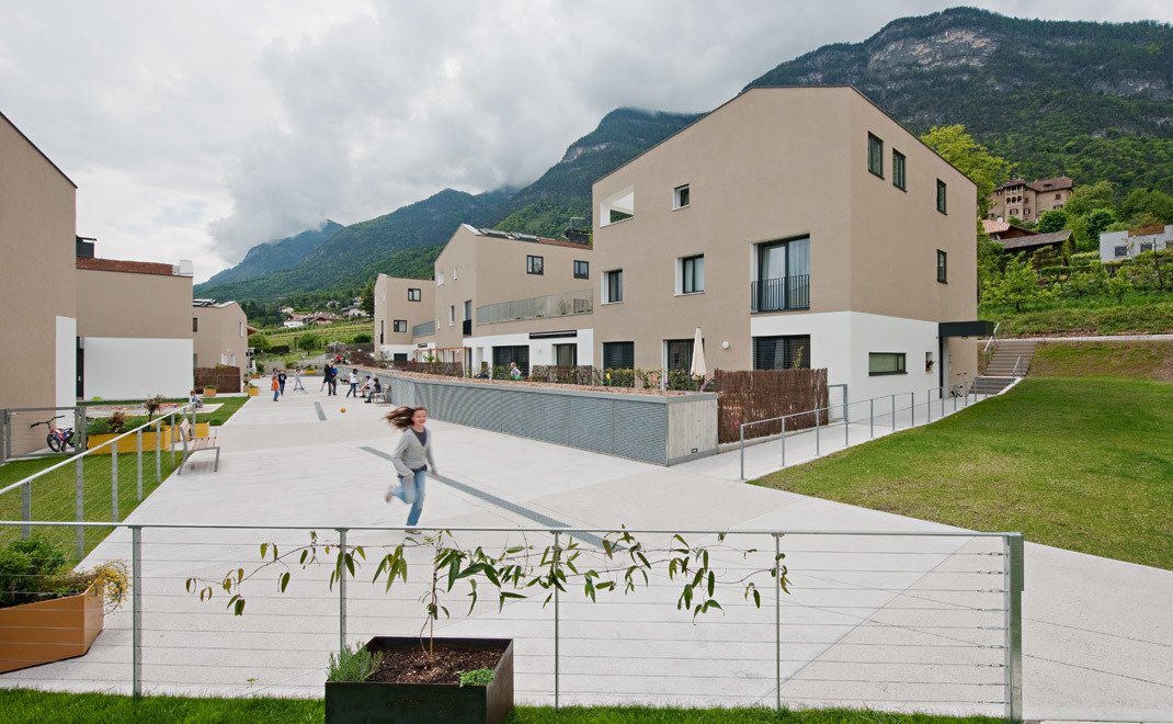 Die Wohnanlage mit 25 Einheiten nimmt verschiedene Muster älterer Agglomerationen in Kaltern auf. Die Architektur wirkt vertraut, einfach und überschaubar. Dennoch zeigt sie, im Gebrauch und in der Bewegung durch den Raum, ihre Komplexität und Überraschungen. Natur und Architektur gehen an bestimmten Stellen nahtlos ineinander über, Ordnung wird zu gewachsener Struktur und umgekehrt. Eine Wohn- und Spielstraße bildet das Herz der Anlage, und wird zum bestimmenden Element des sozialen Raumes. Kleine Pfade umgeben die Anlage und bilden mit Wohnstraße und Naturkorridor ein komplexes Wegenetz, welches die unterschiedlichsten (halb)öffentlichen Räume für Kommunikation und Interaktion als auch zum Rückzug freilegt. (Text: Architektinnen)